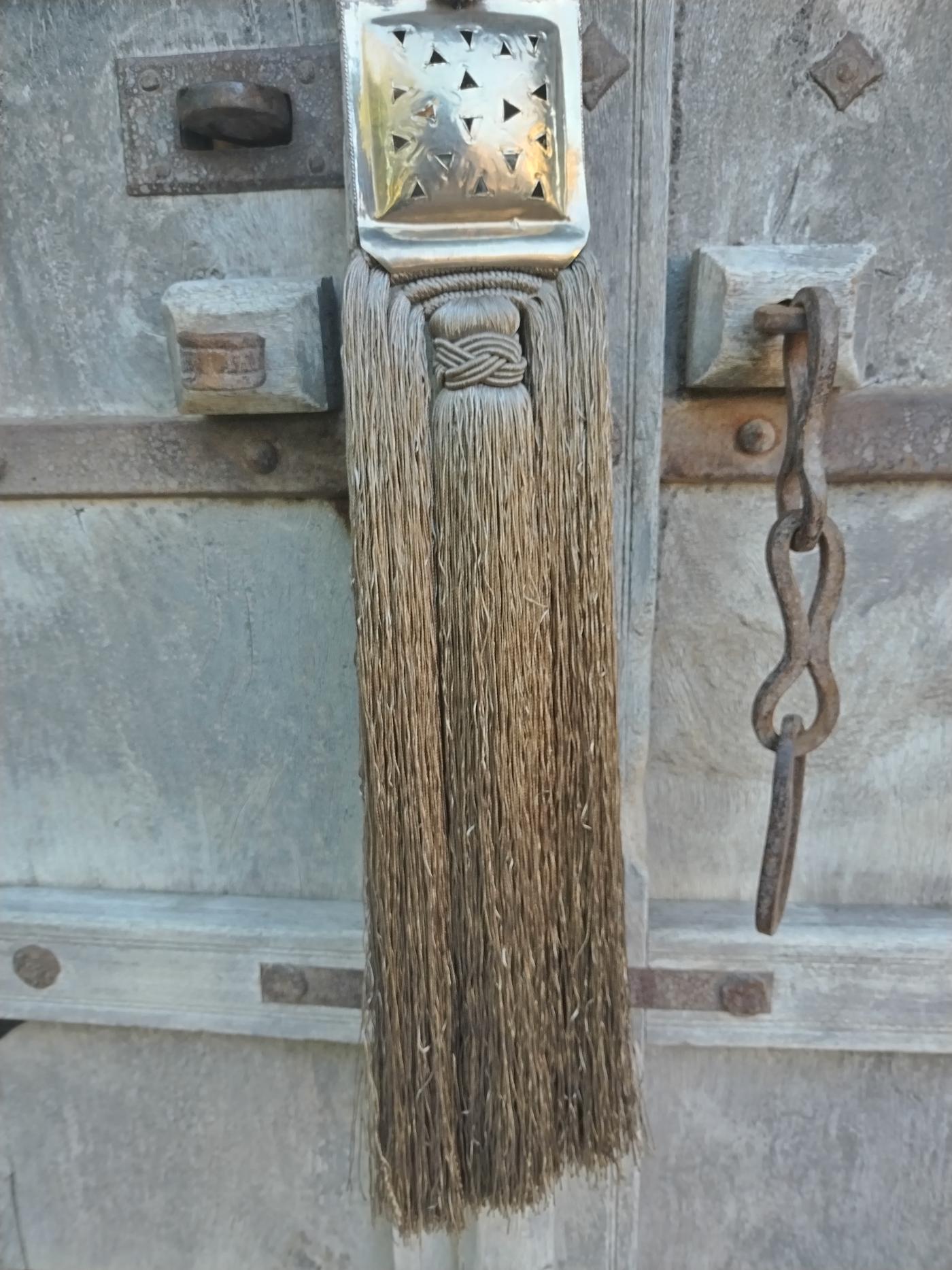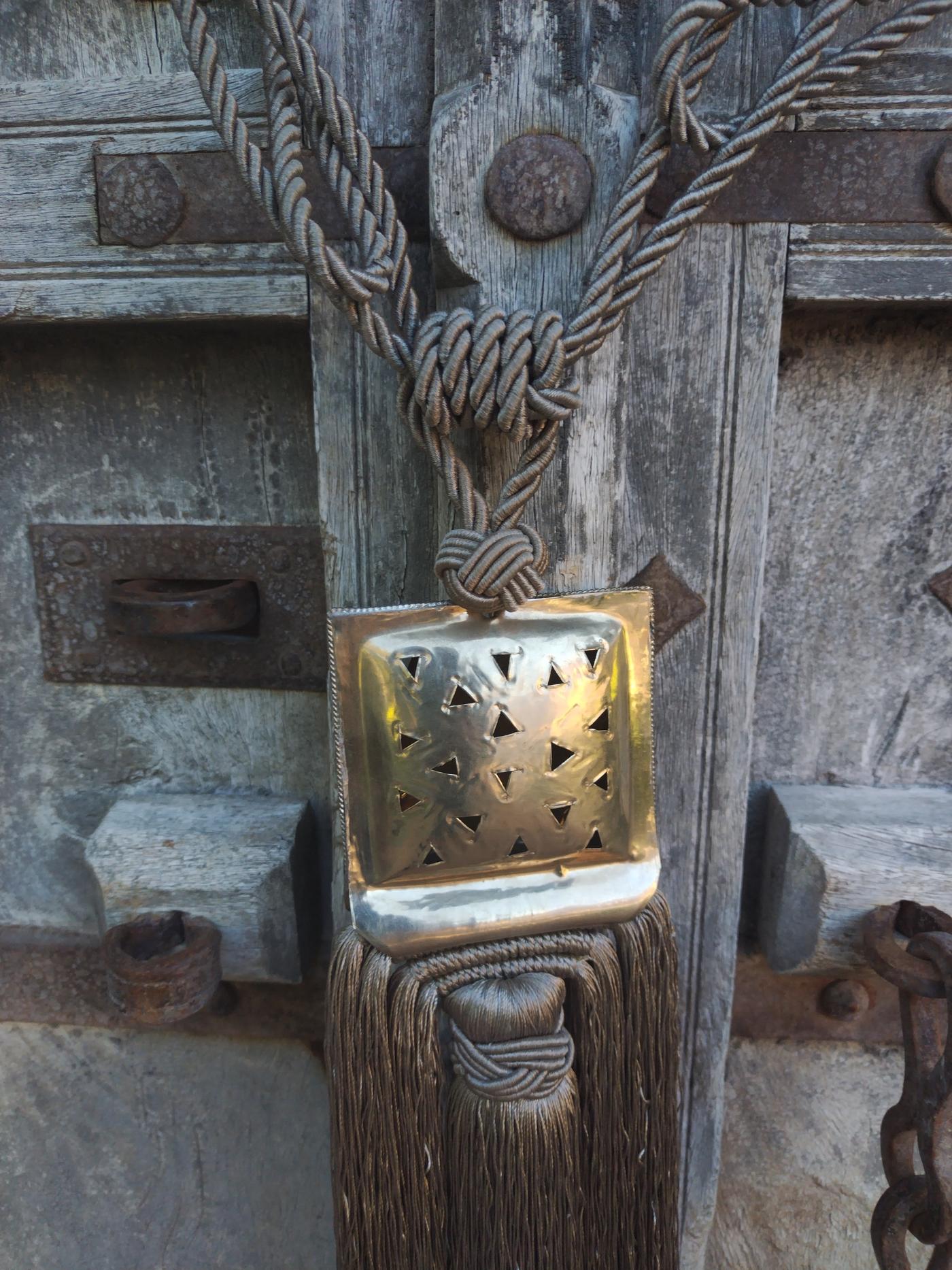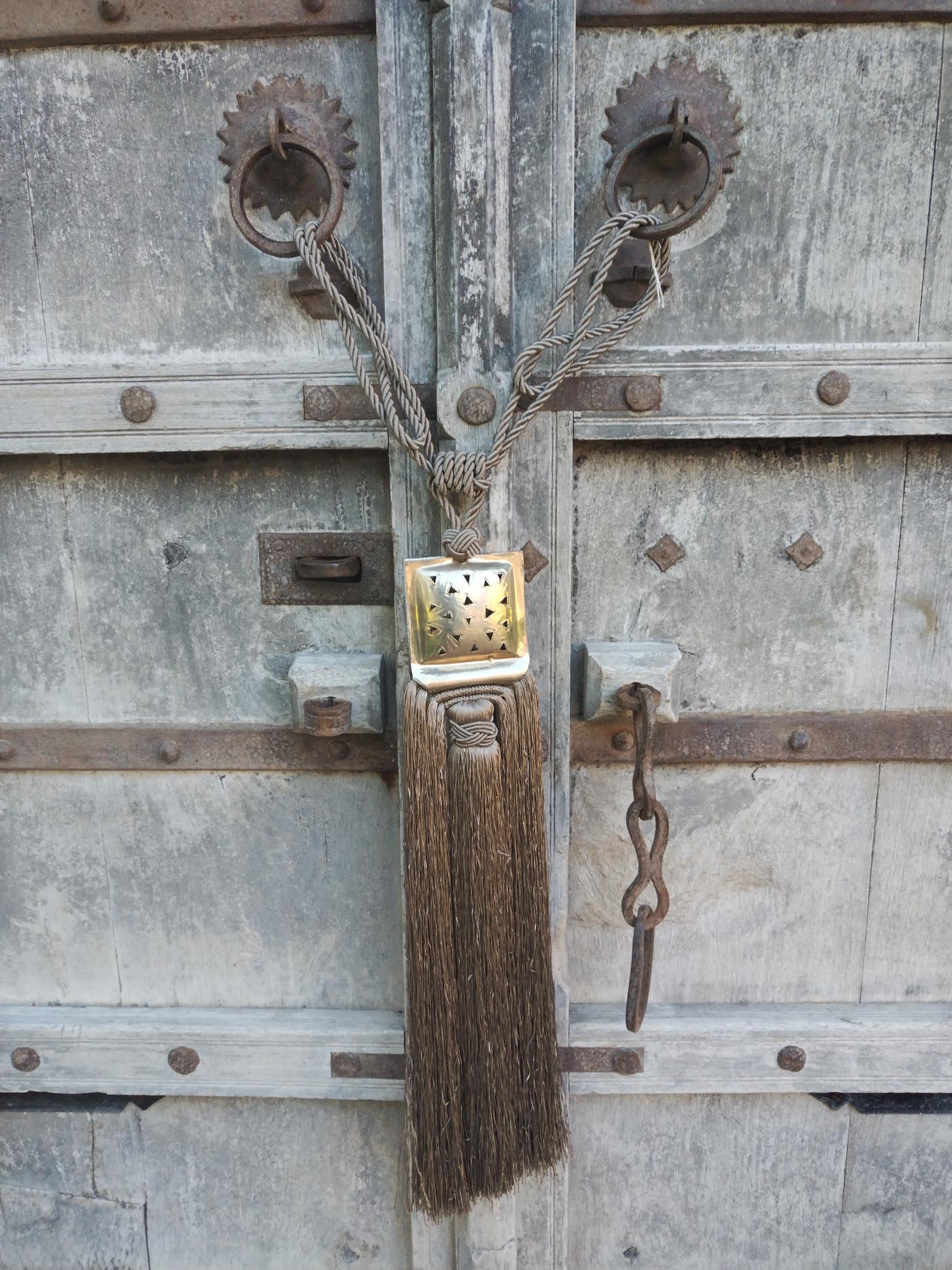 Nappa piccola decorativa per le tende color tortora scuro realizzata artigianalmente in Marocco con placca quadrata centrale decorata in argentone dorato con motivi geometrici