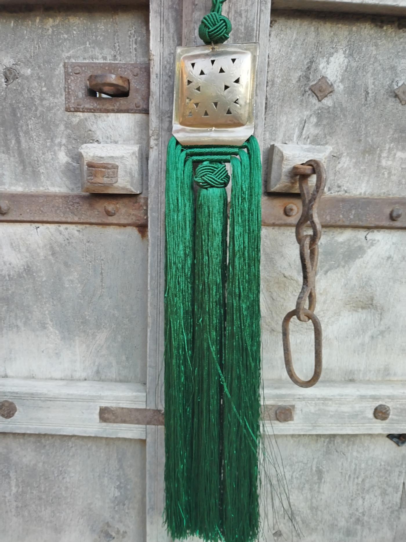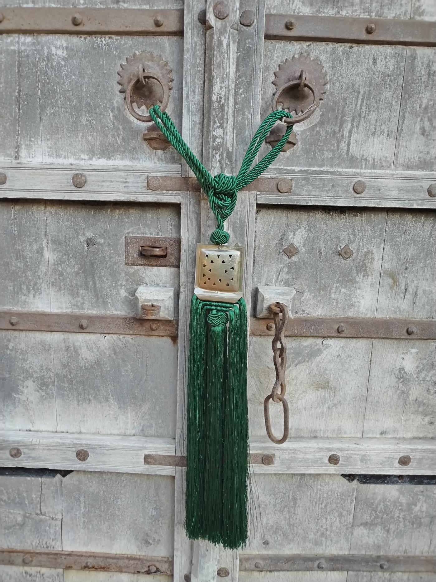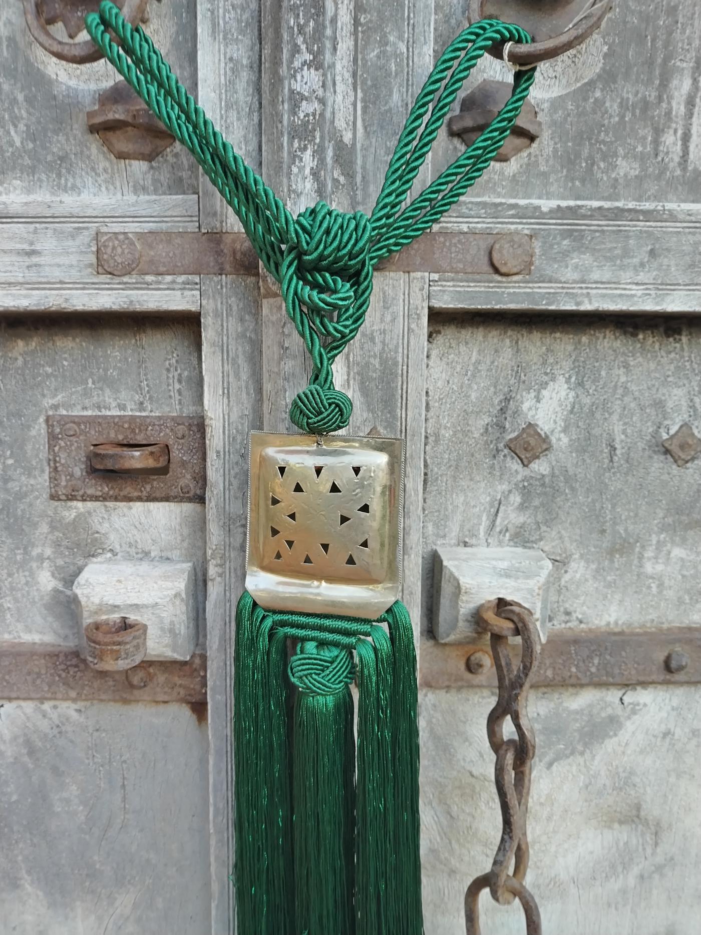 Nappa piccola decorativa per le tende color verde realizzata artigianalmente in Marocco con placca quadrata centrale decorata in argentone con motivi geometrici