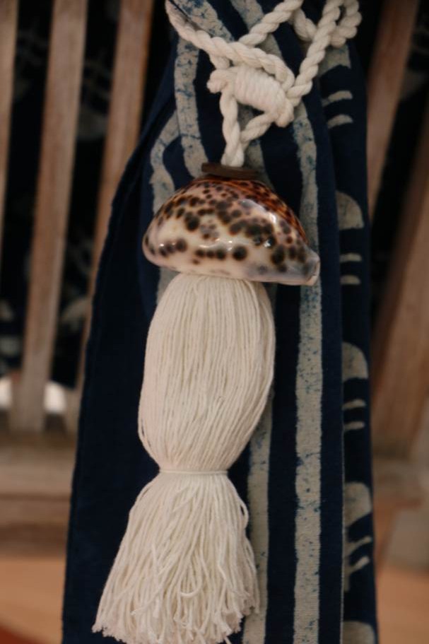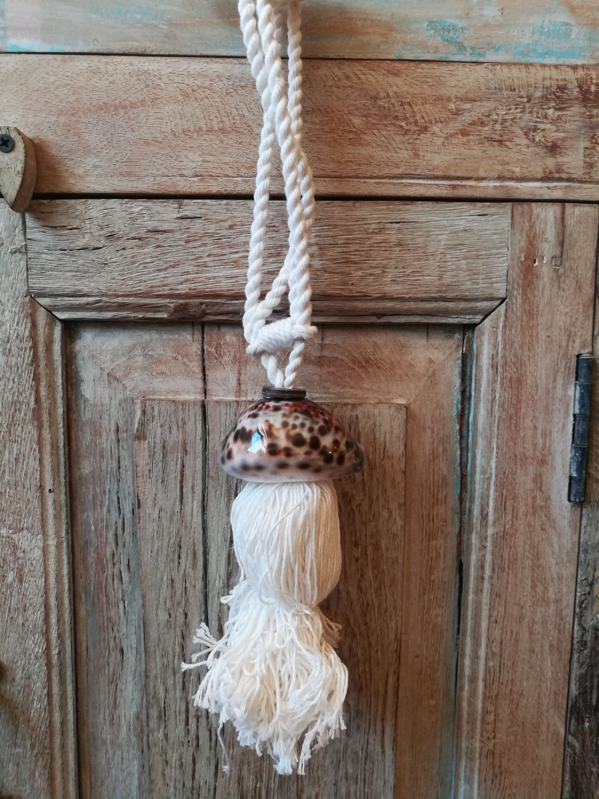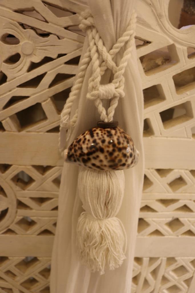 Nappe per le tende realizzate con cordone e pendente in cotone bianco adornato nella parte superiore con conchiglie vere indonesiane bianche a chiazze marroni