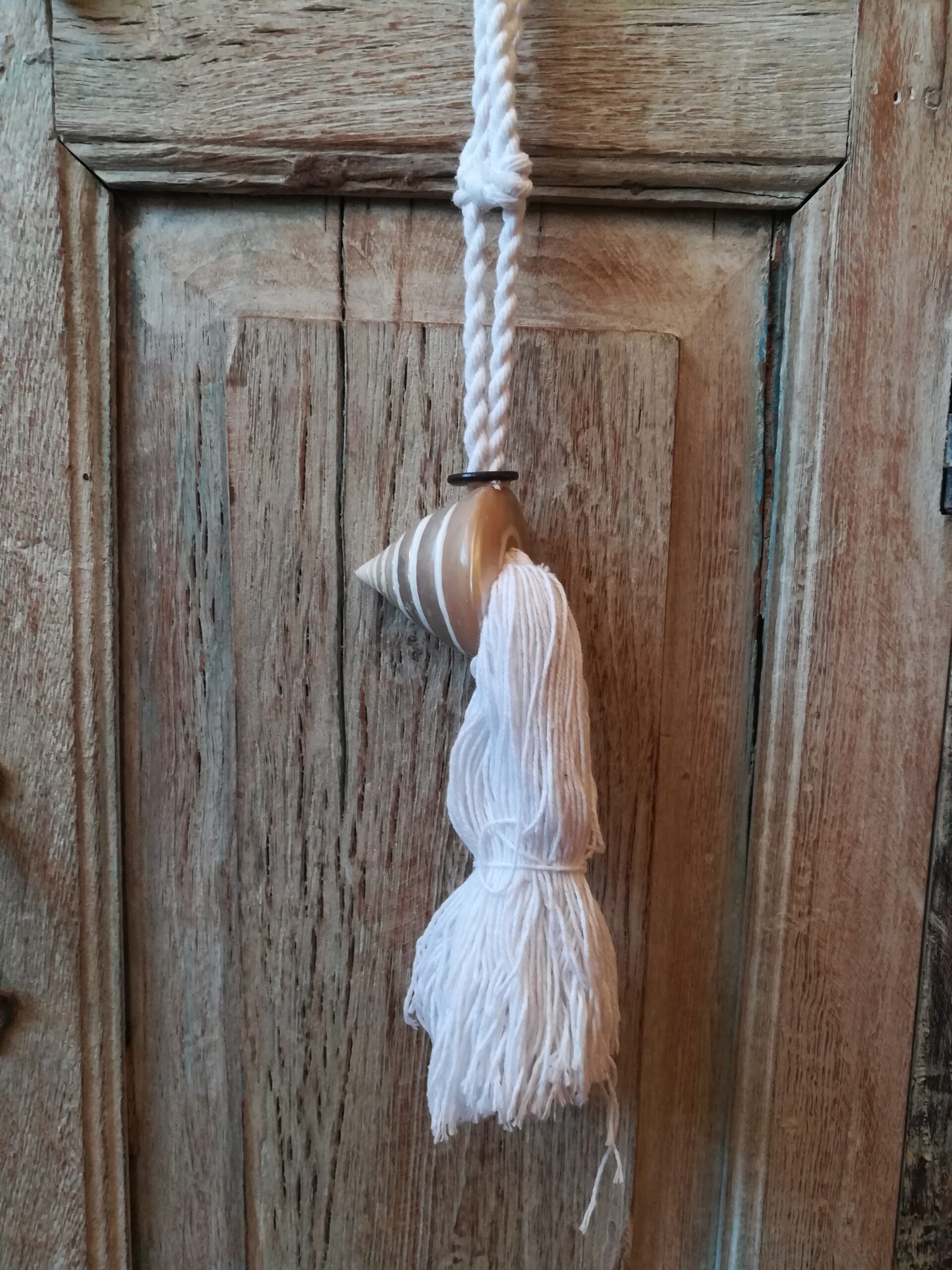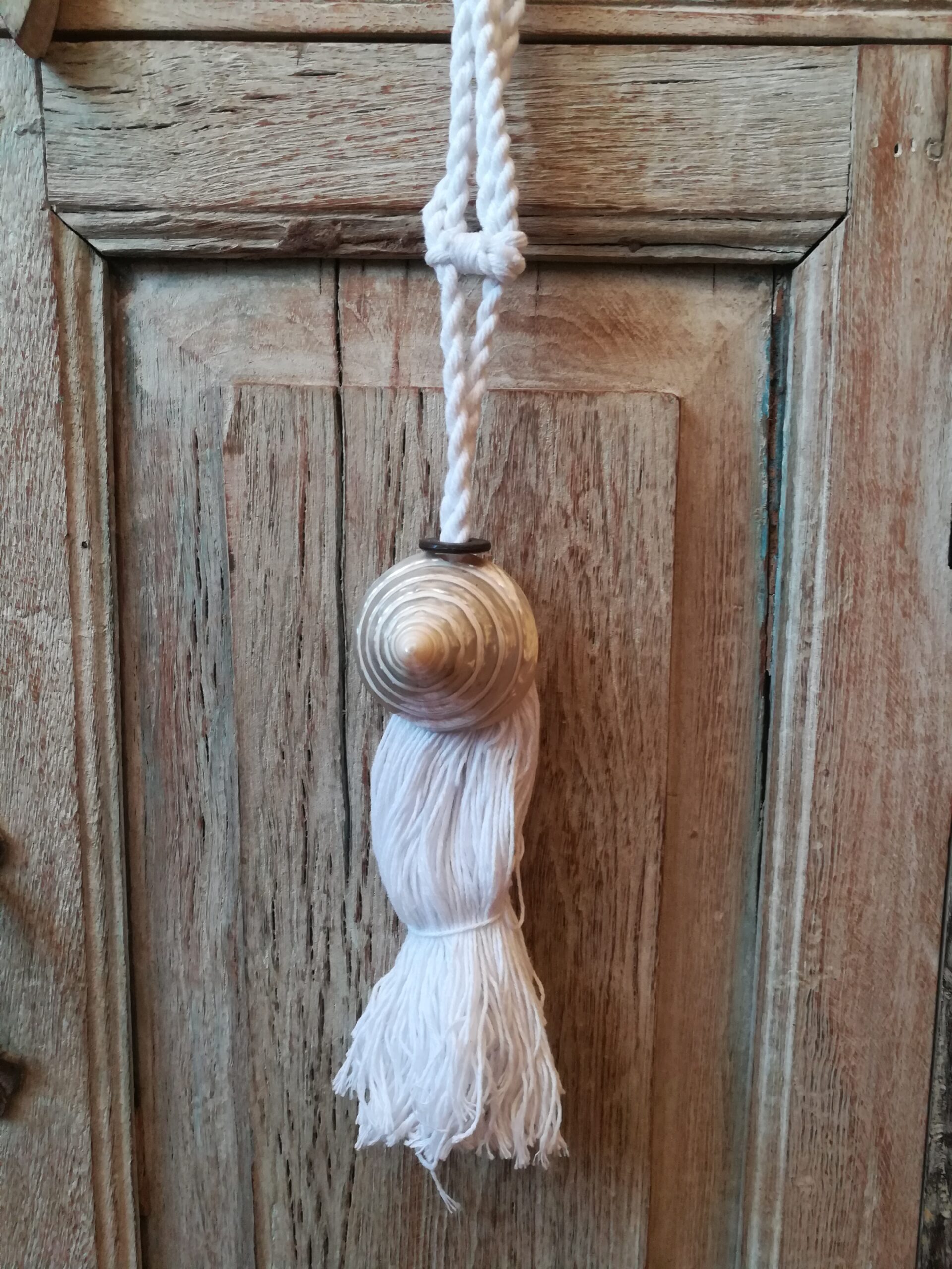 Nappe per le tende realizzate con cordone e pendente in cotone bianco adornato nella parte superiore con conchiglie vere indonesiane bianche
