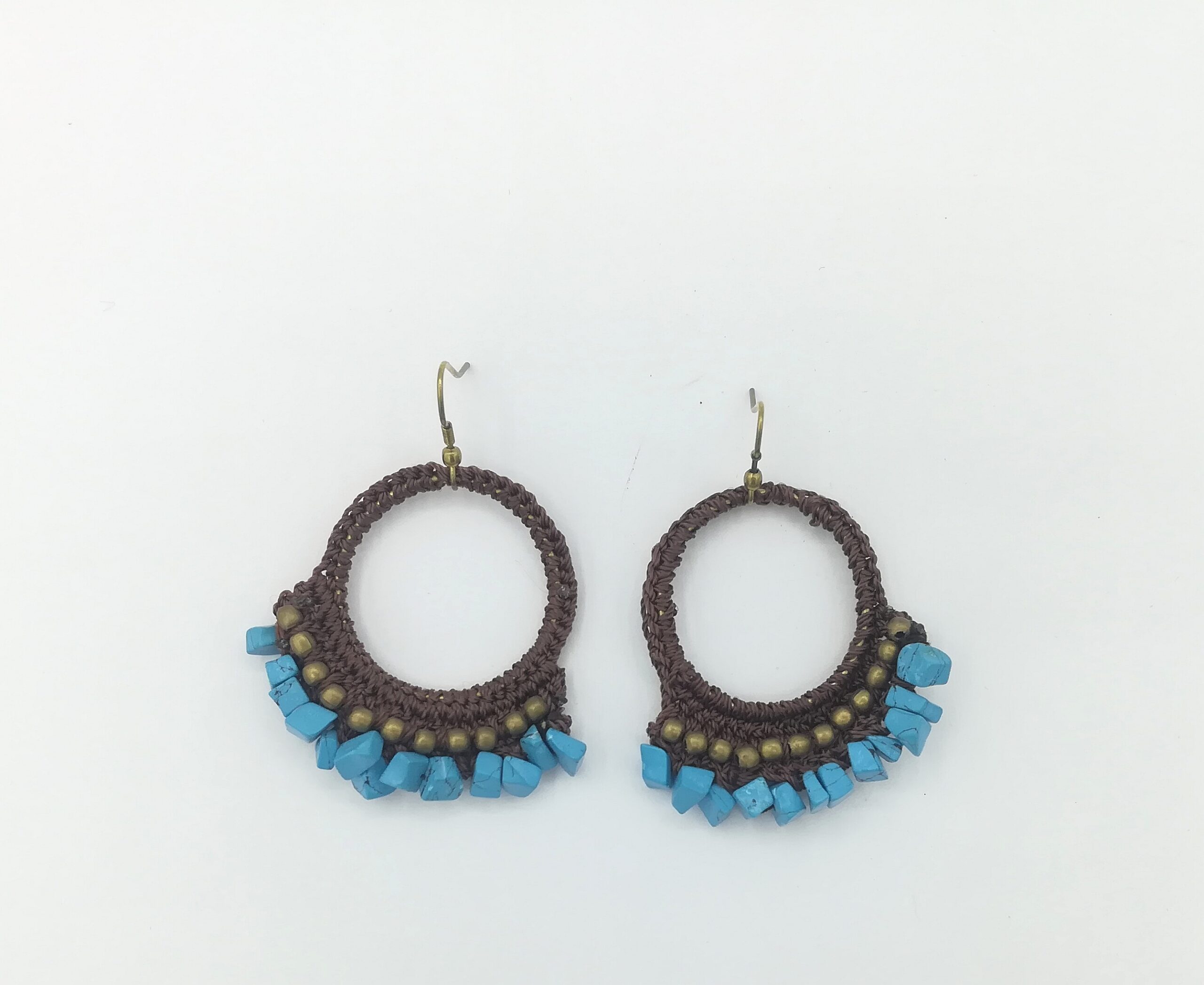 orecchini circolari pendenti, realizzati artigianalmente in Indonesia in macramè, pietre azzurre e metallo dorato.