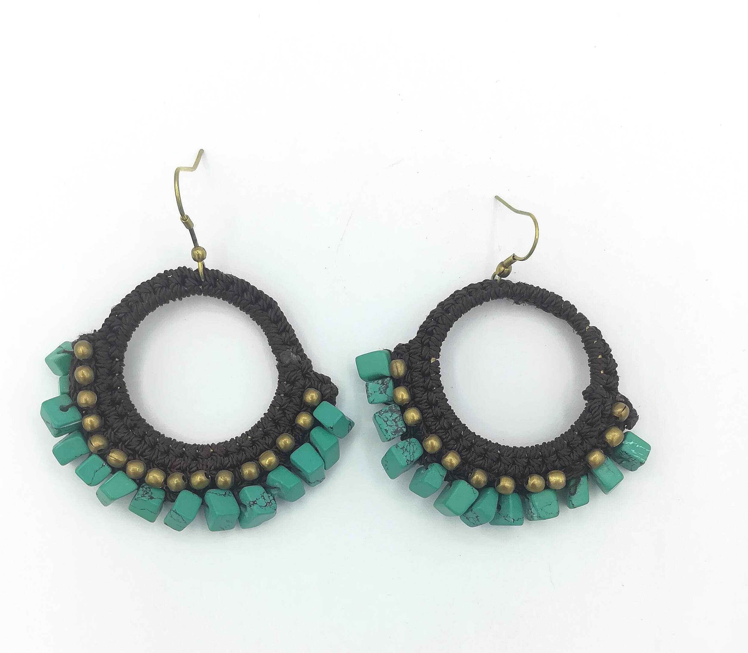 orecchini circolari pendenti, realizzati artigianalmente in Indonesia in macramè, pietre turchesi e metallo dorato.