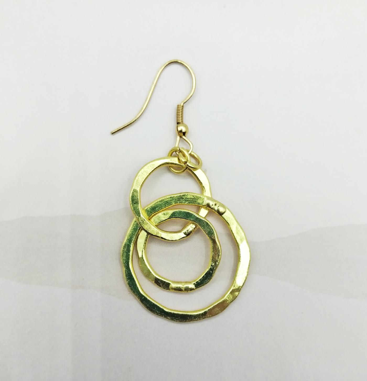 Gli orecchini Joanna sono realizzati interamente a mano in metallo dorato, si distinguono per il loro intreccio armonioso di cerchi di diverse dimensioni, che si sovrappongono in un gioco di forme fluide e luminose.