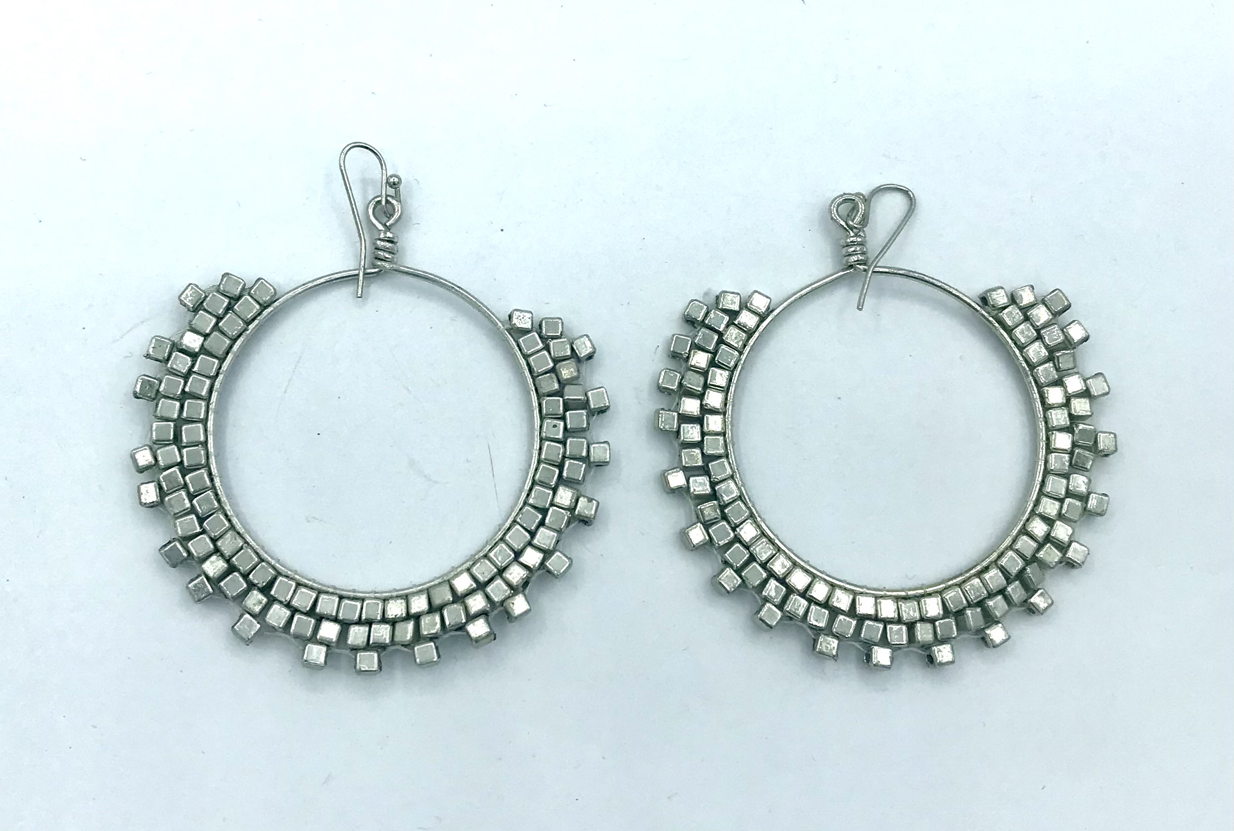 orecchini a cerchio pendenti, realizzati artigianalmente in India in metallo argentato