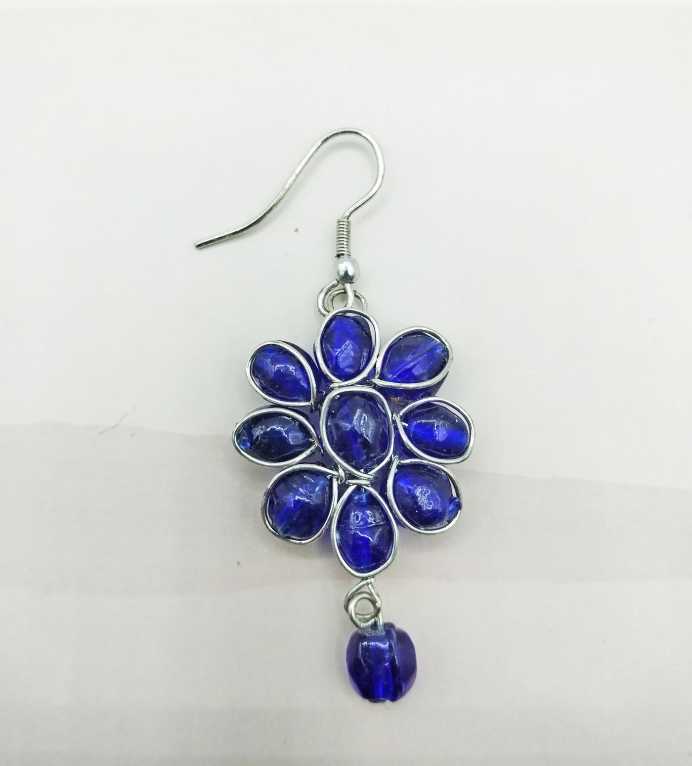 Orecchini pendenti realizzati artigianalmente in India con perline blu cobalto che formano un disegno floreale