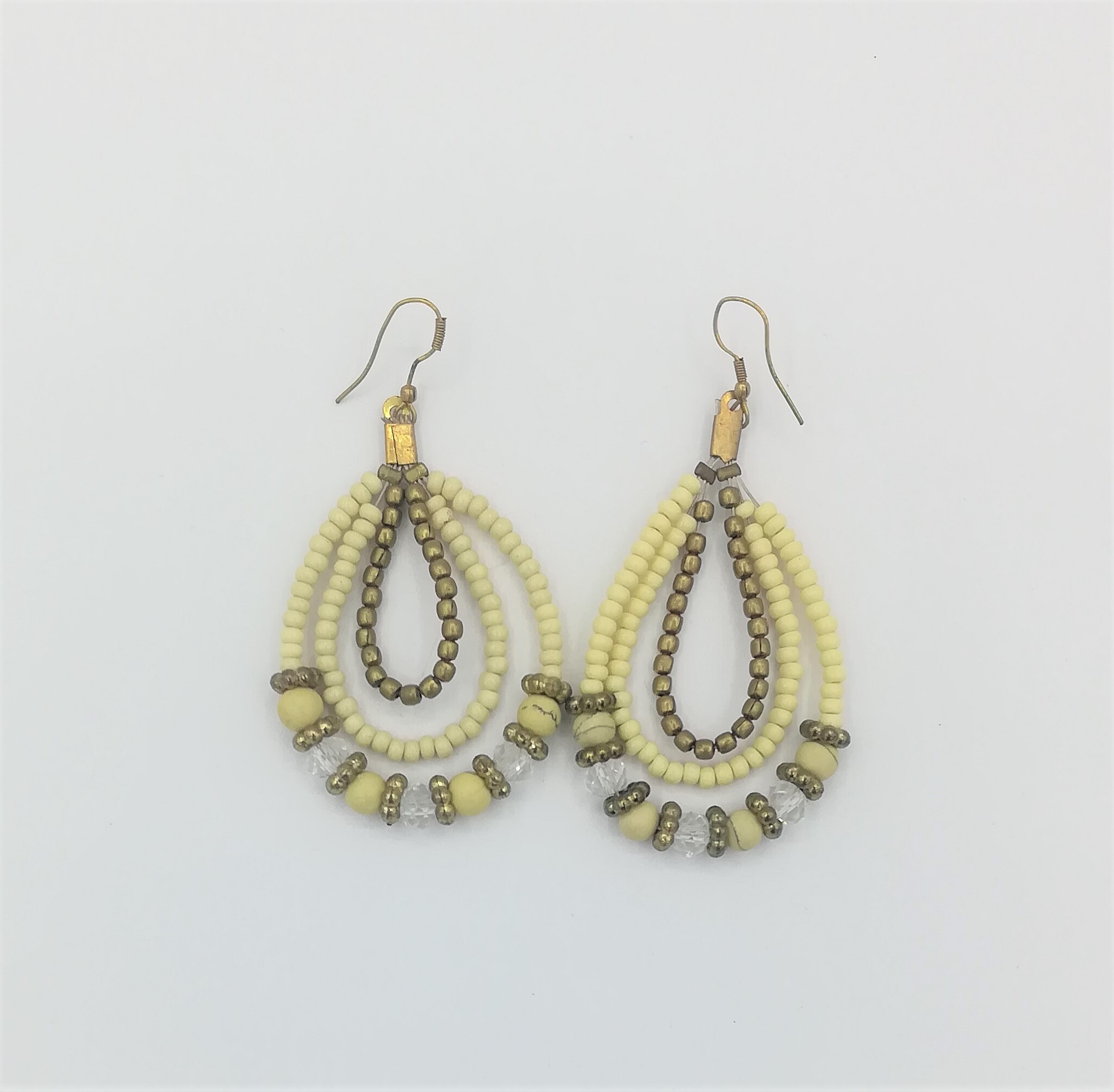 Orecchini pendenti realizzati in India con perline colorate panna e in metallo dorato