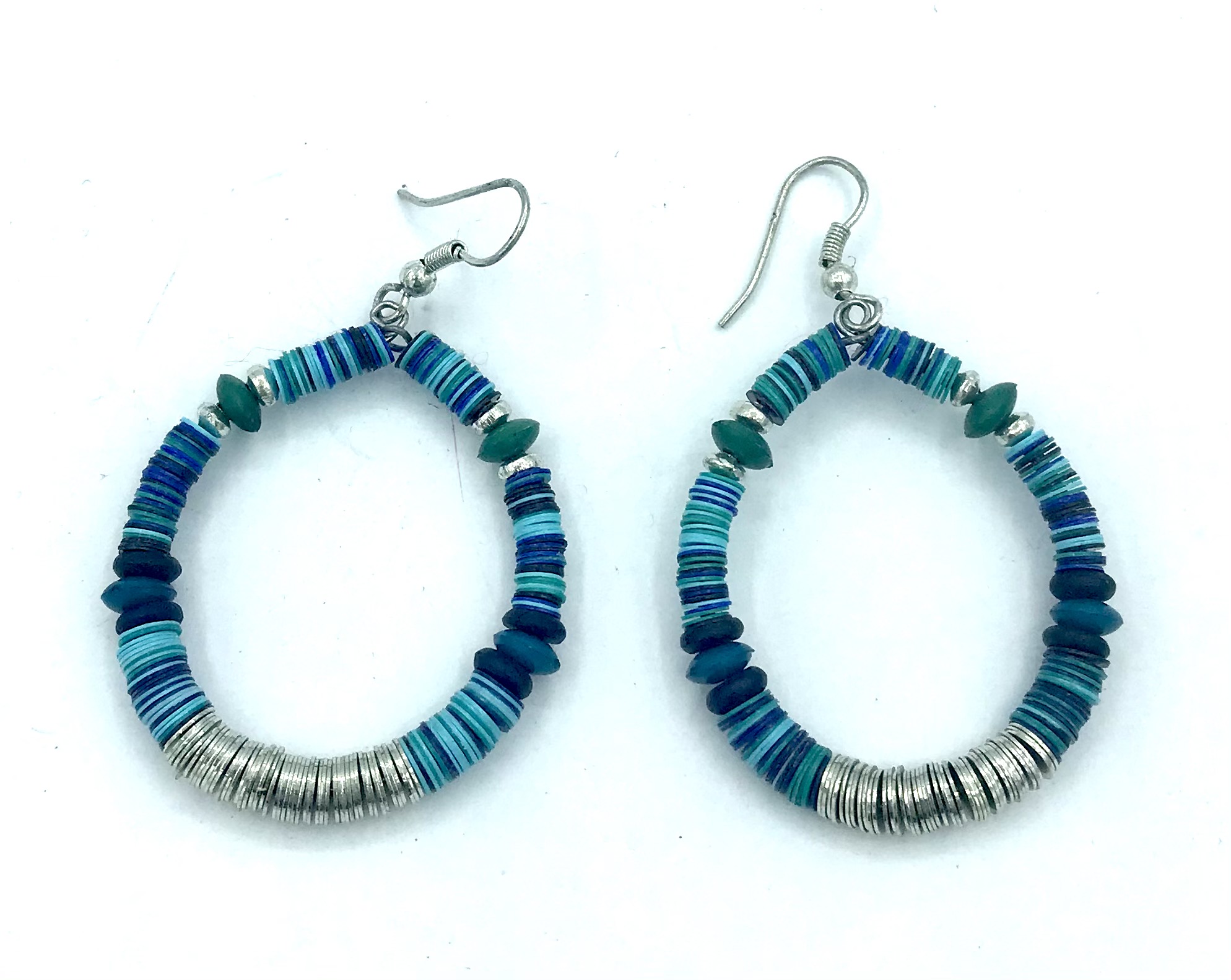Orecchini circolari pendenti, realizzati artigianalmente in India in metallo argentato con perline azzurre