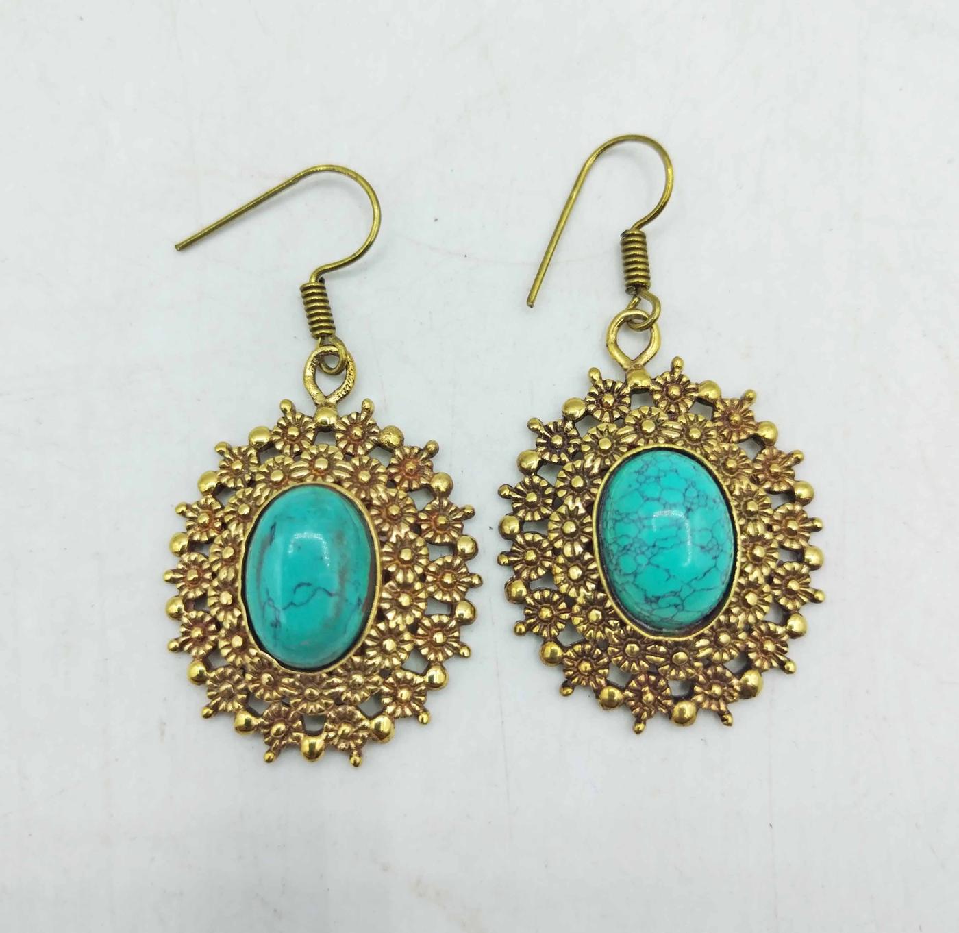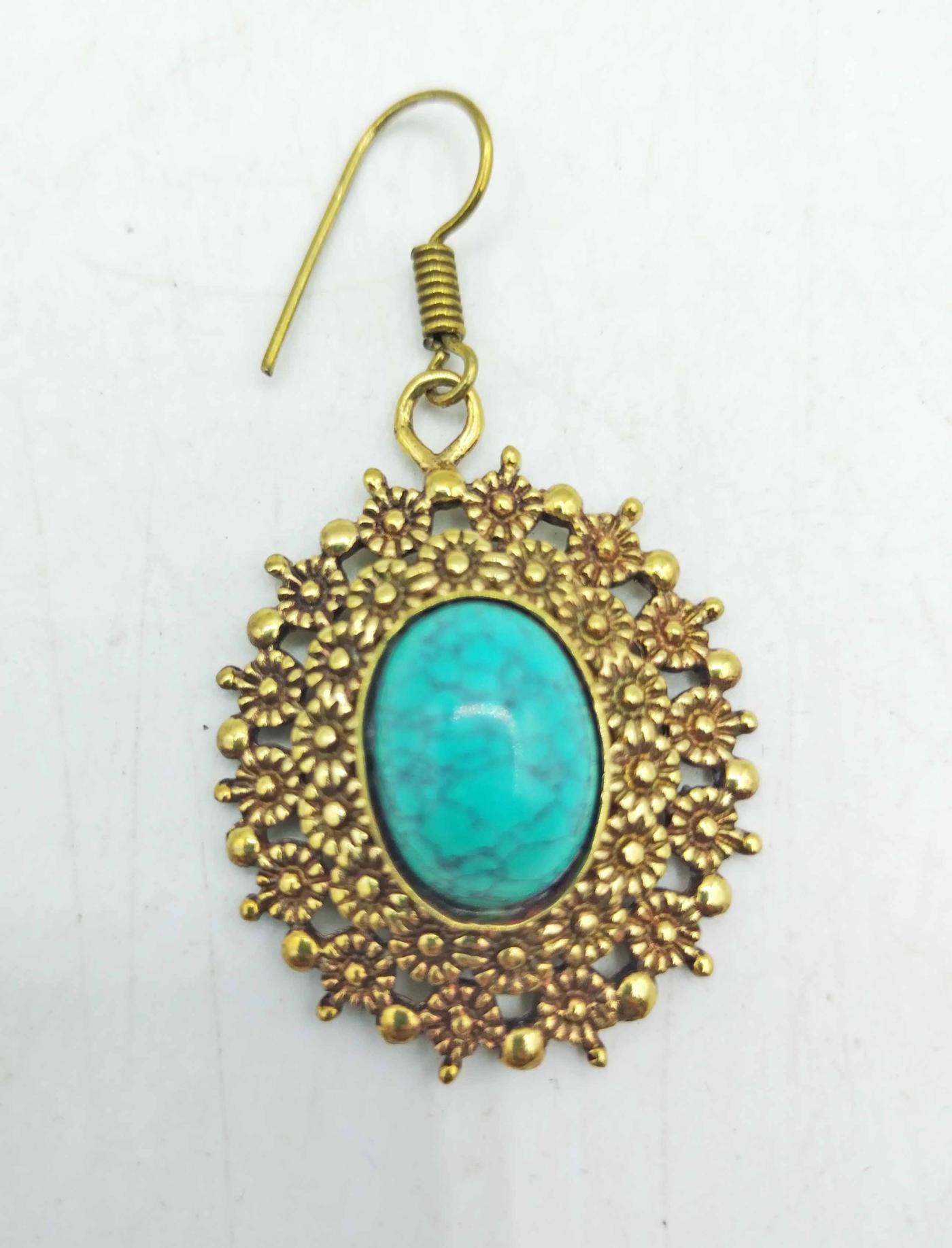 orecchini pendenti realizzati artigianalmente in India in metallo dorato traforato, con pietra turchese al centro