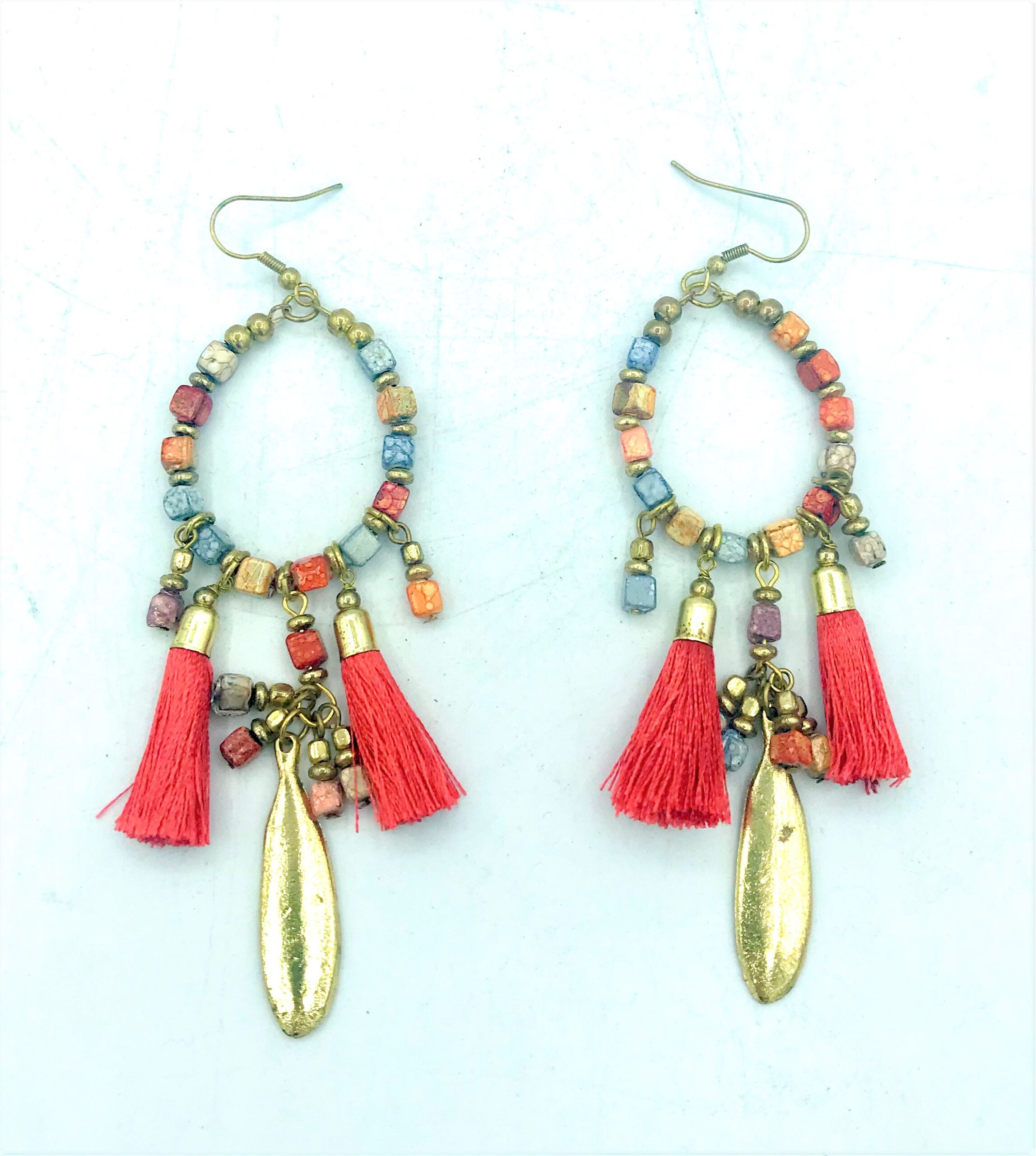 Orecchini lunghi realizzati in india con perline quadrate colorate, metallo e piccole nappe pendenti