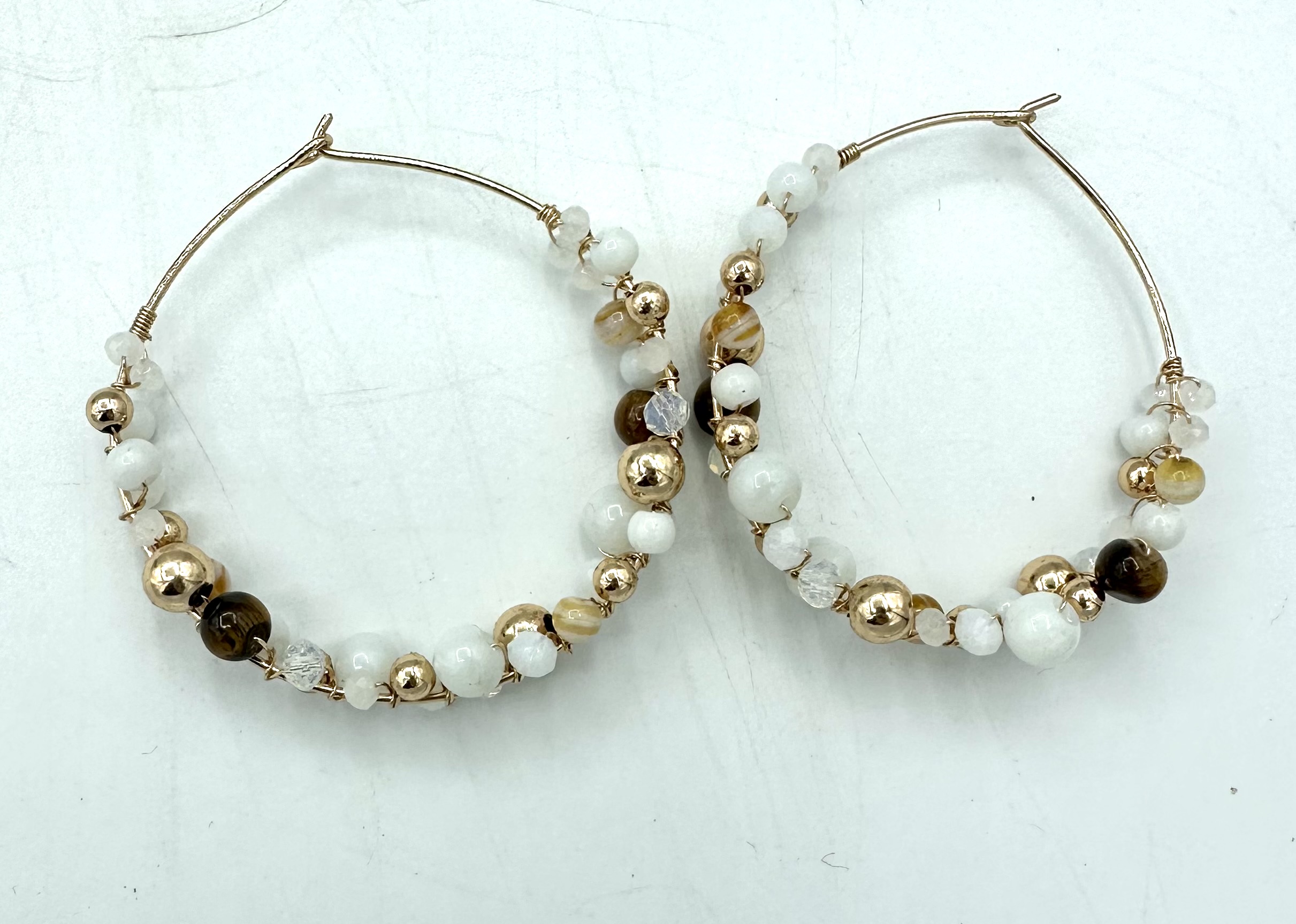 orecchini a cerchio decorati con perline diverse, realizzati artigianalmente in India in metallo dorato