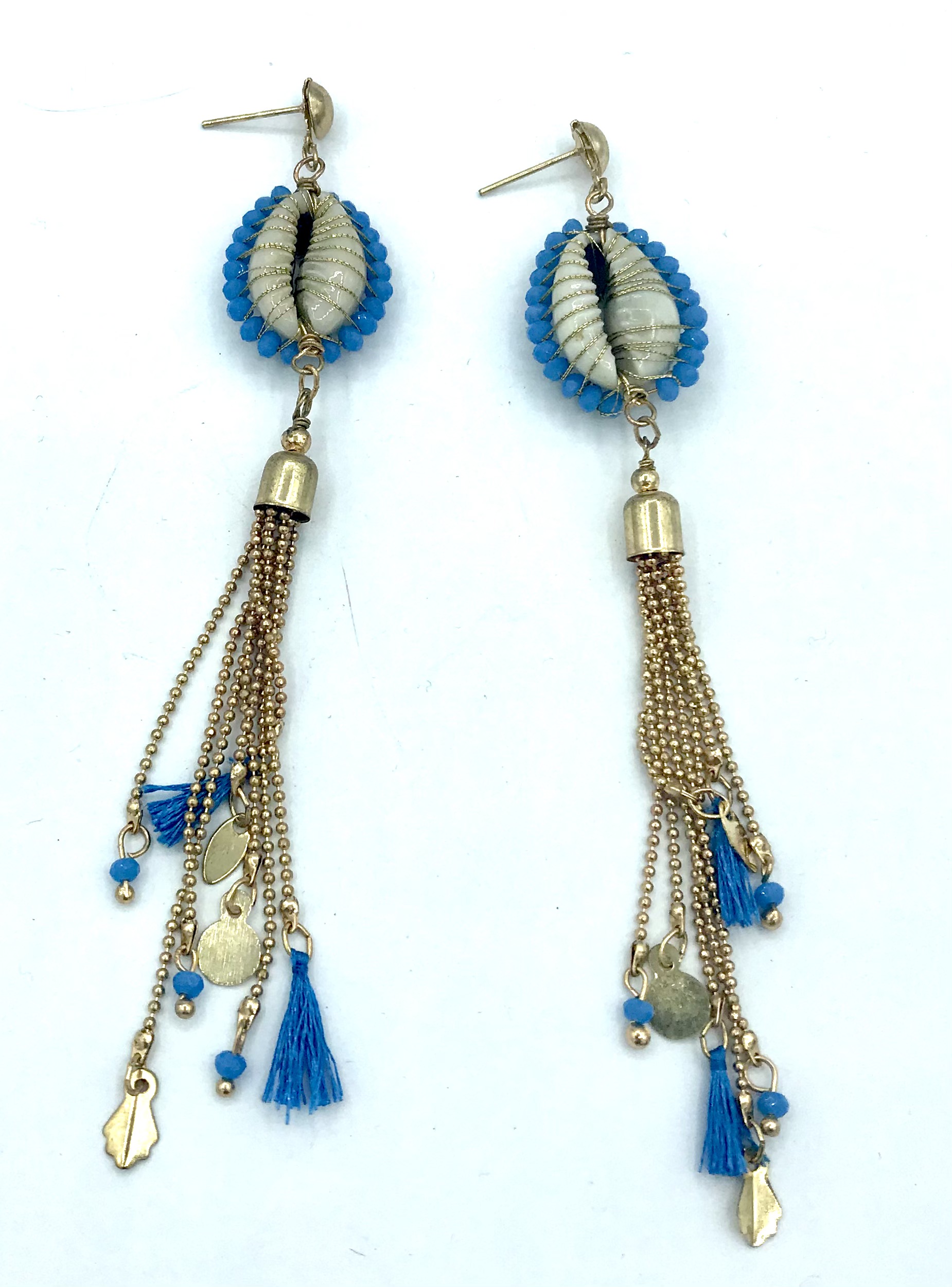 E’ un modello molto particolare di orecchini pendenti, realizzato incastonando una conchiglia bianca in una gabbia dorata che la rifinisce con delle perline azzurre che le girano tutto intorno e da cui partono una serie di catene dorate di diverse lunghezze da cui pendono perline e nappe azzurre.