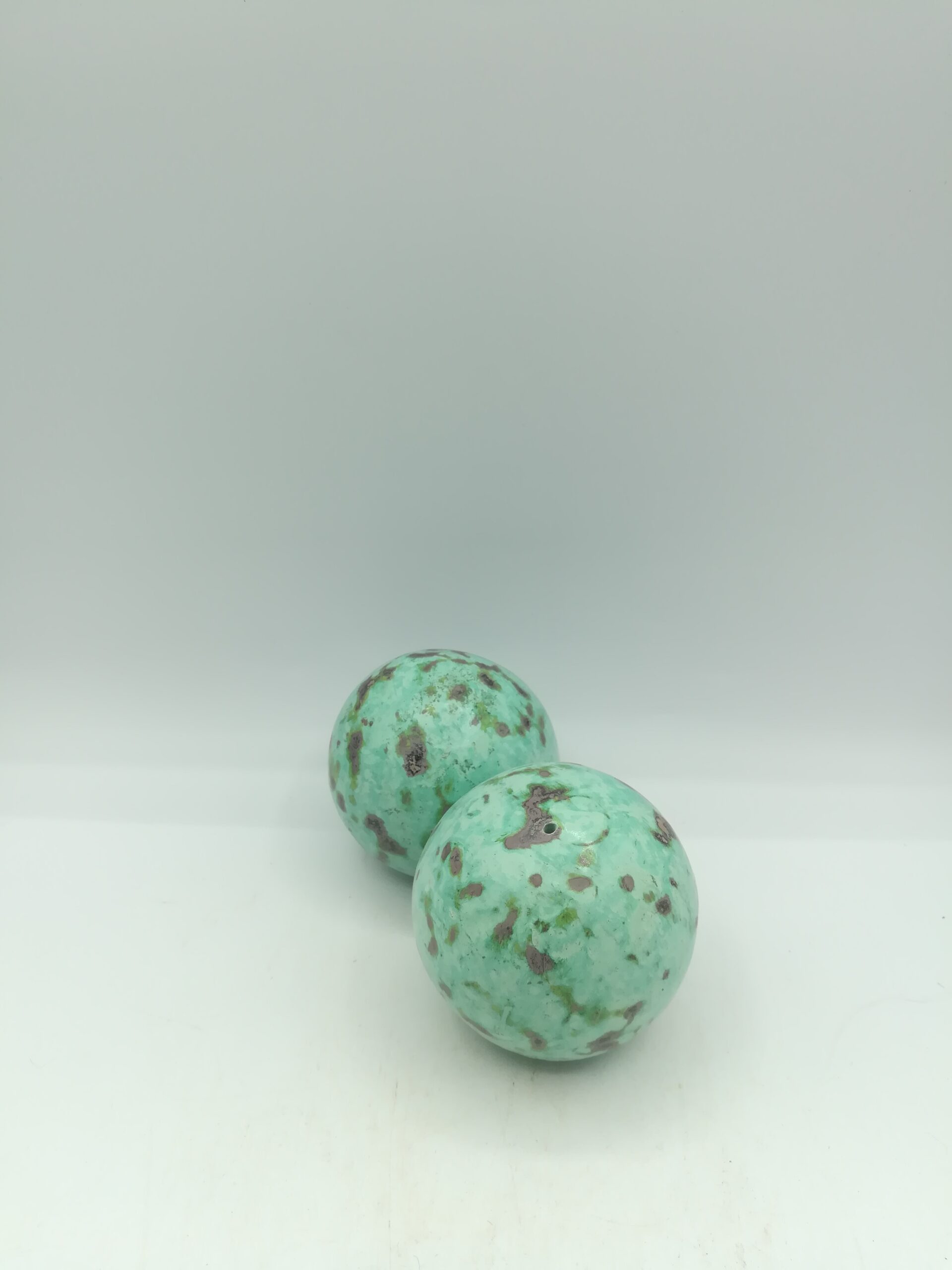 Palle decorative in terracotta, misura piccola, color verde acqua screziato, realizzate artigianalmente in Indonesia