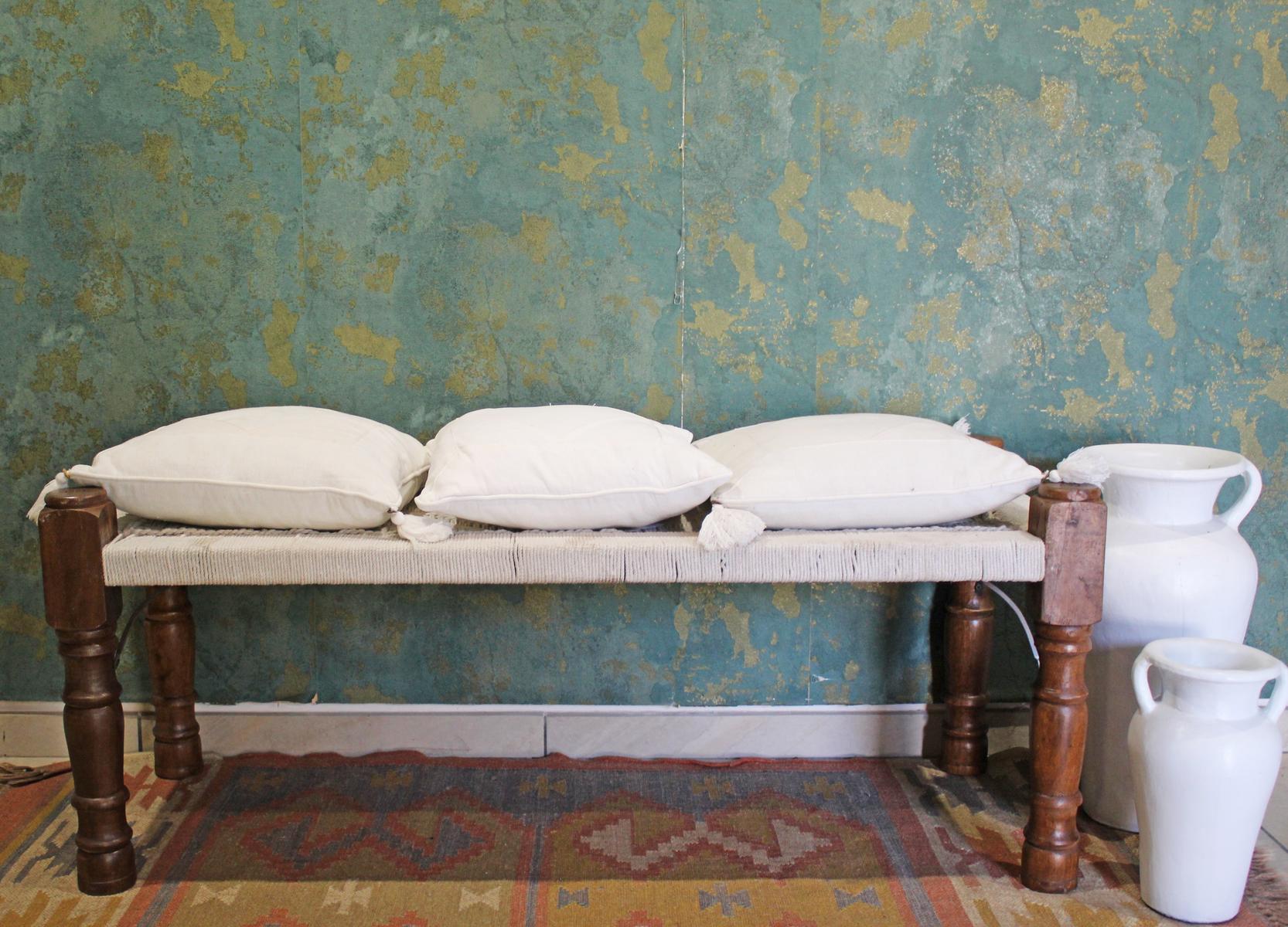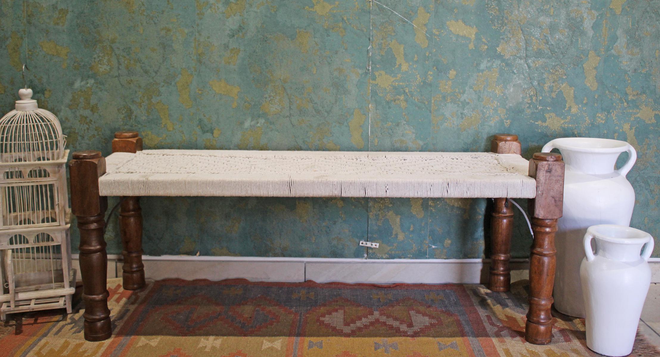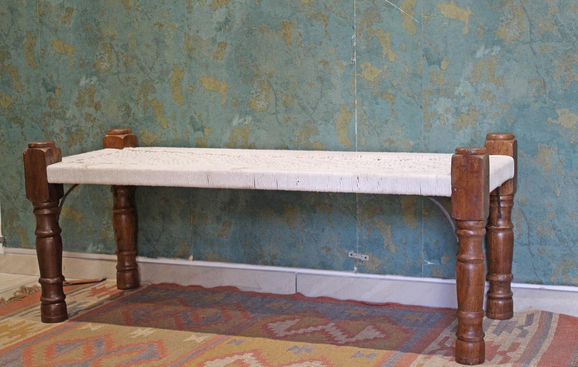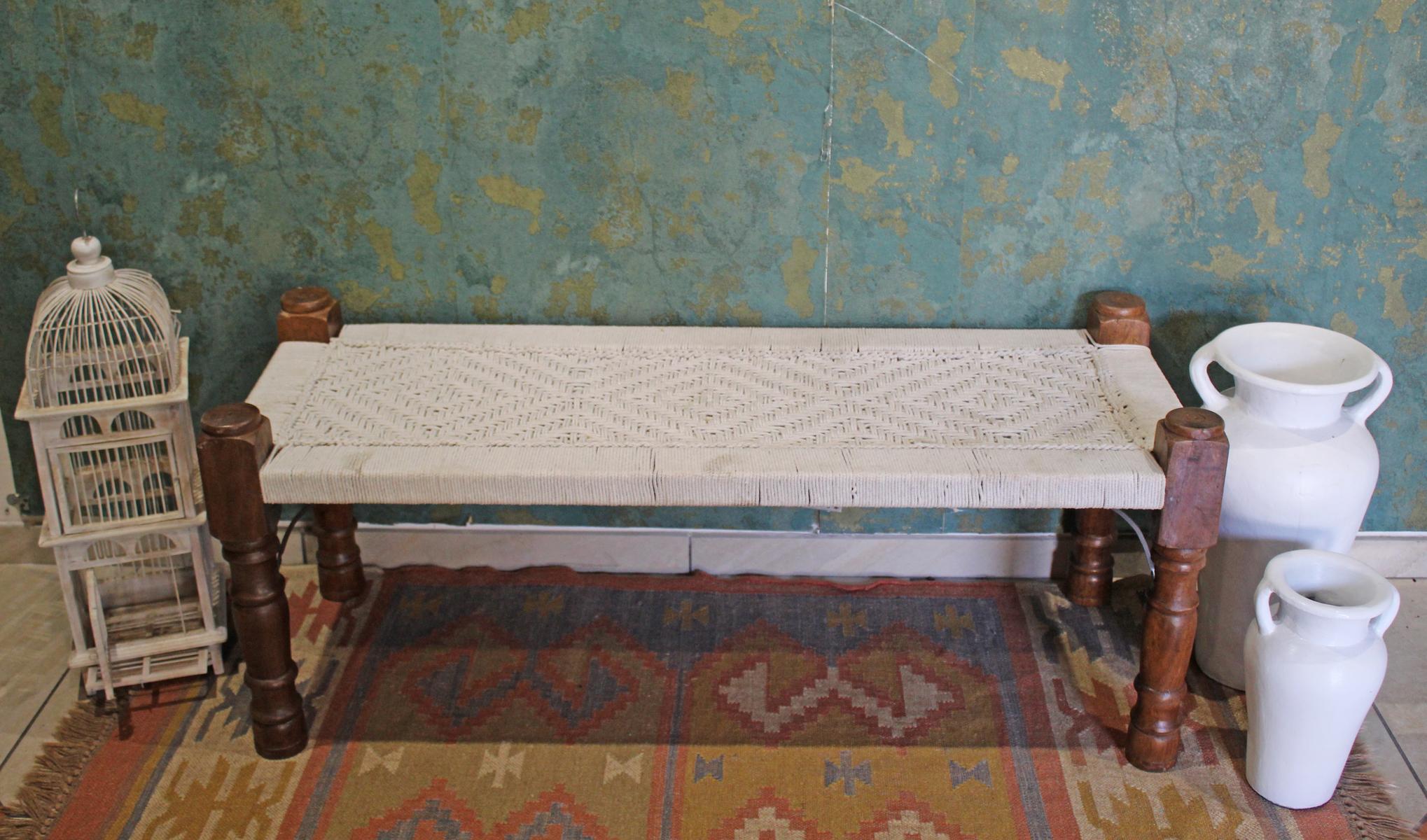 Panca indiana in legno naturale con seduta in cotone bianco realizzata con la tecnica del macramè