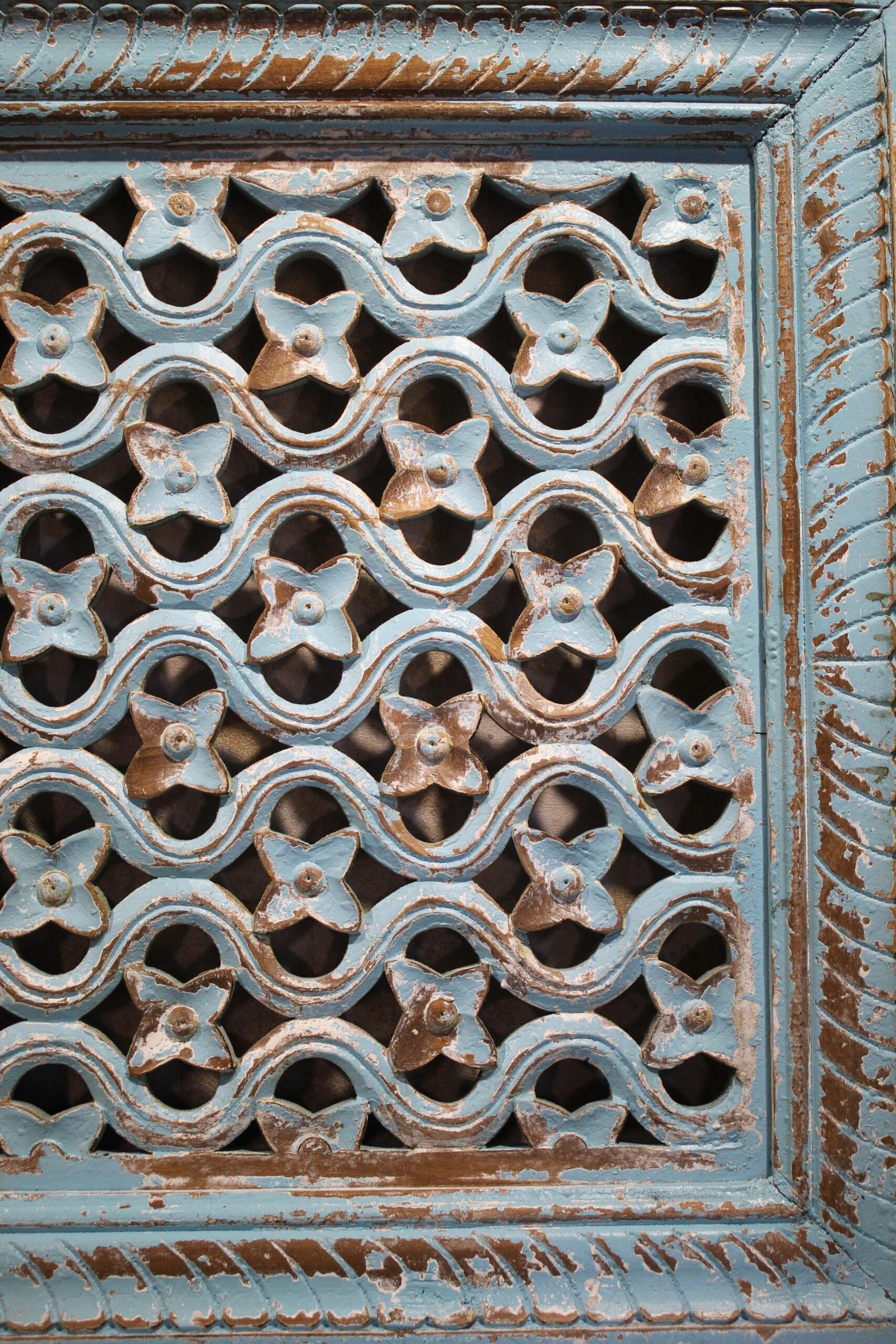 Pannello decorativo indiano in legno di teak intagliato, decapato sui toni dell’ azzurro.