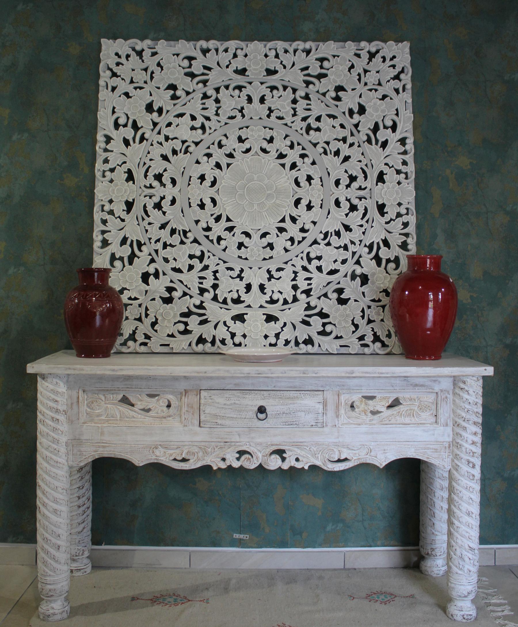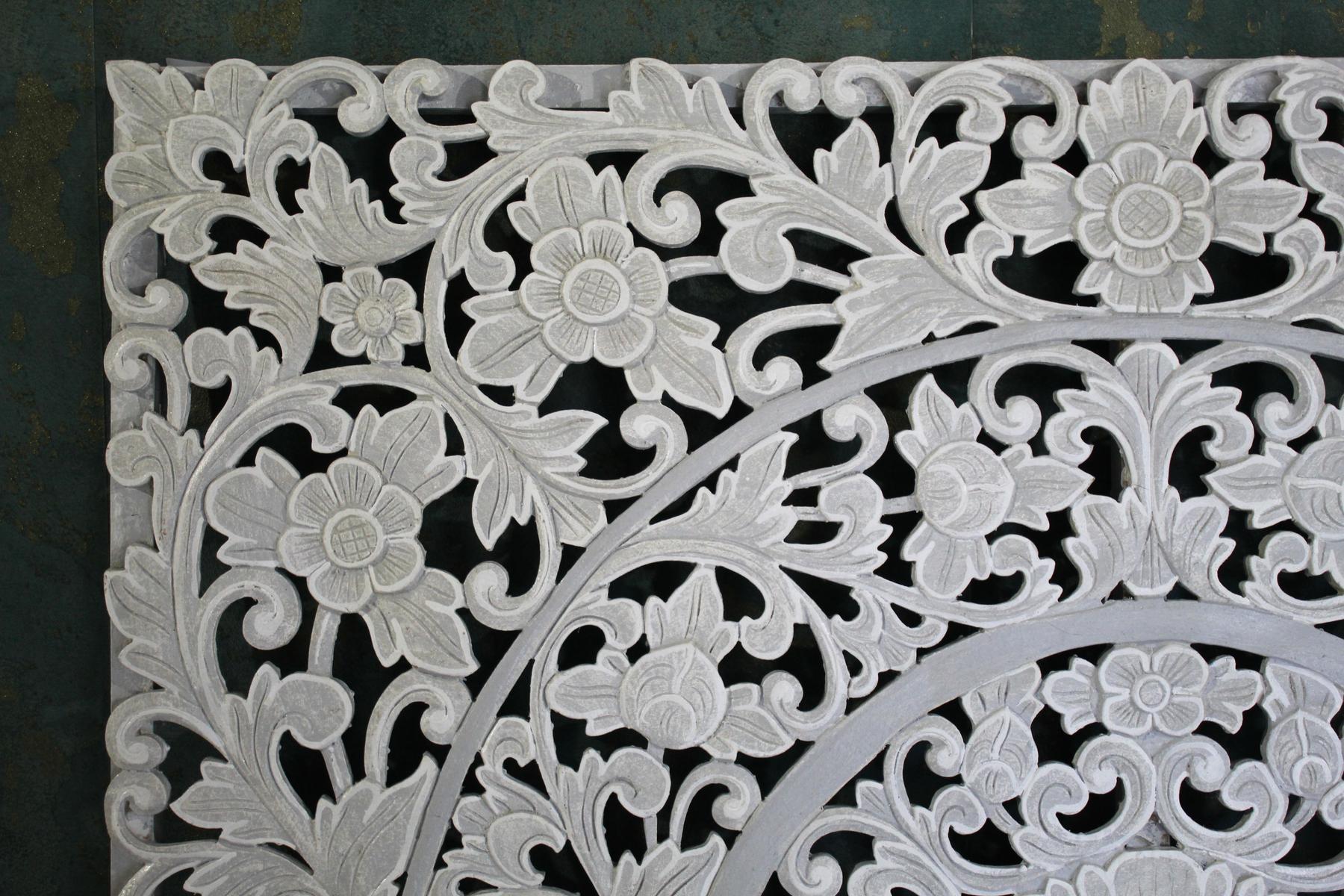 Il pannello Uluwatu, di forma quadrata completamente intagliato a mano con soggetti naturali; è realizzato in legno e pasta di legno , sui toni del grigio, con una lavorazione particolare che dà l’ idea della pietra, eseguita da abili artigiani Indonesiani.