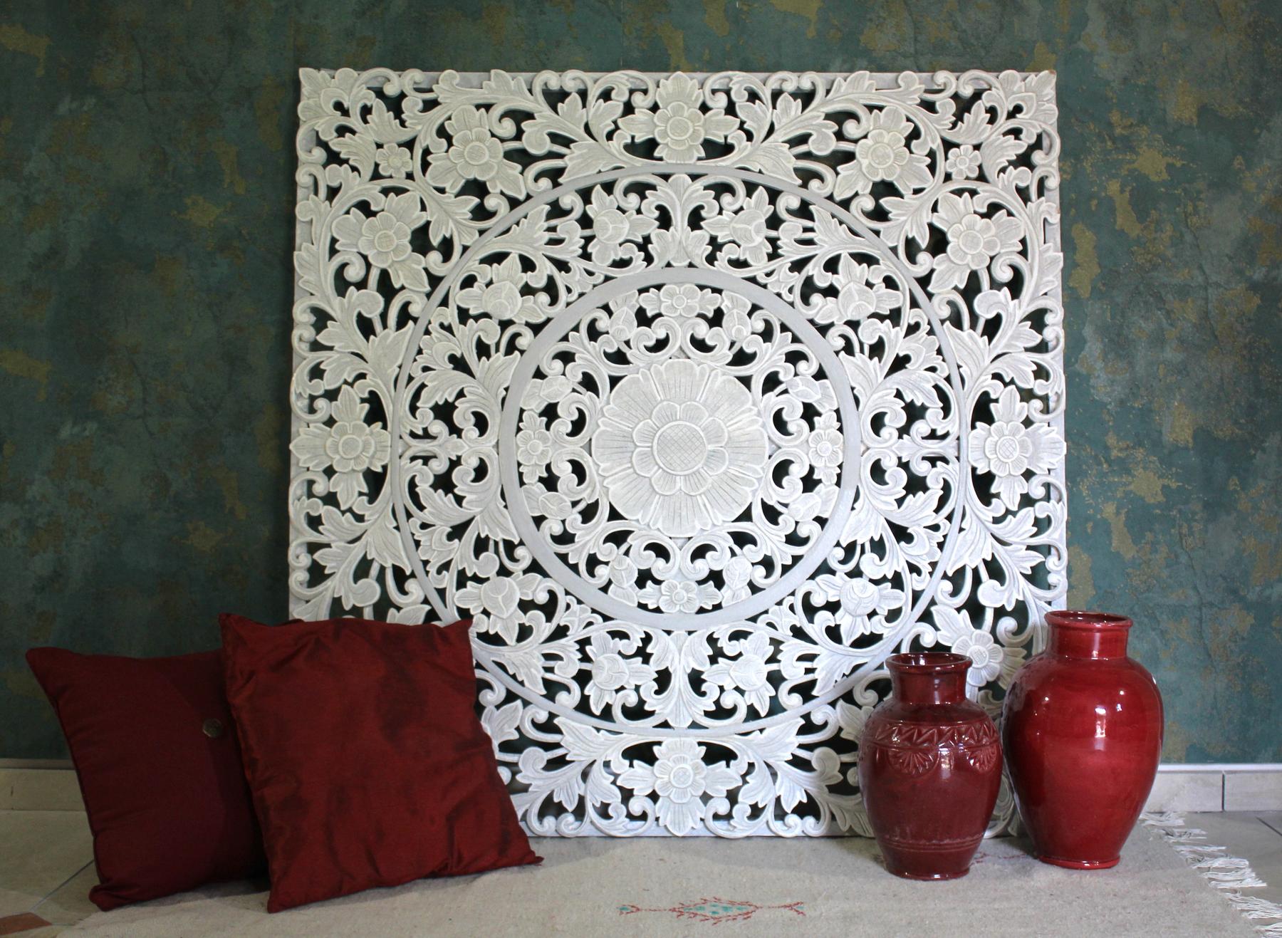 Pannello quadrato indonesiano in legno e pasta di legno, intagliato a mano
