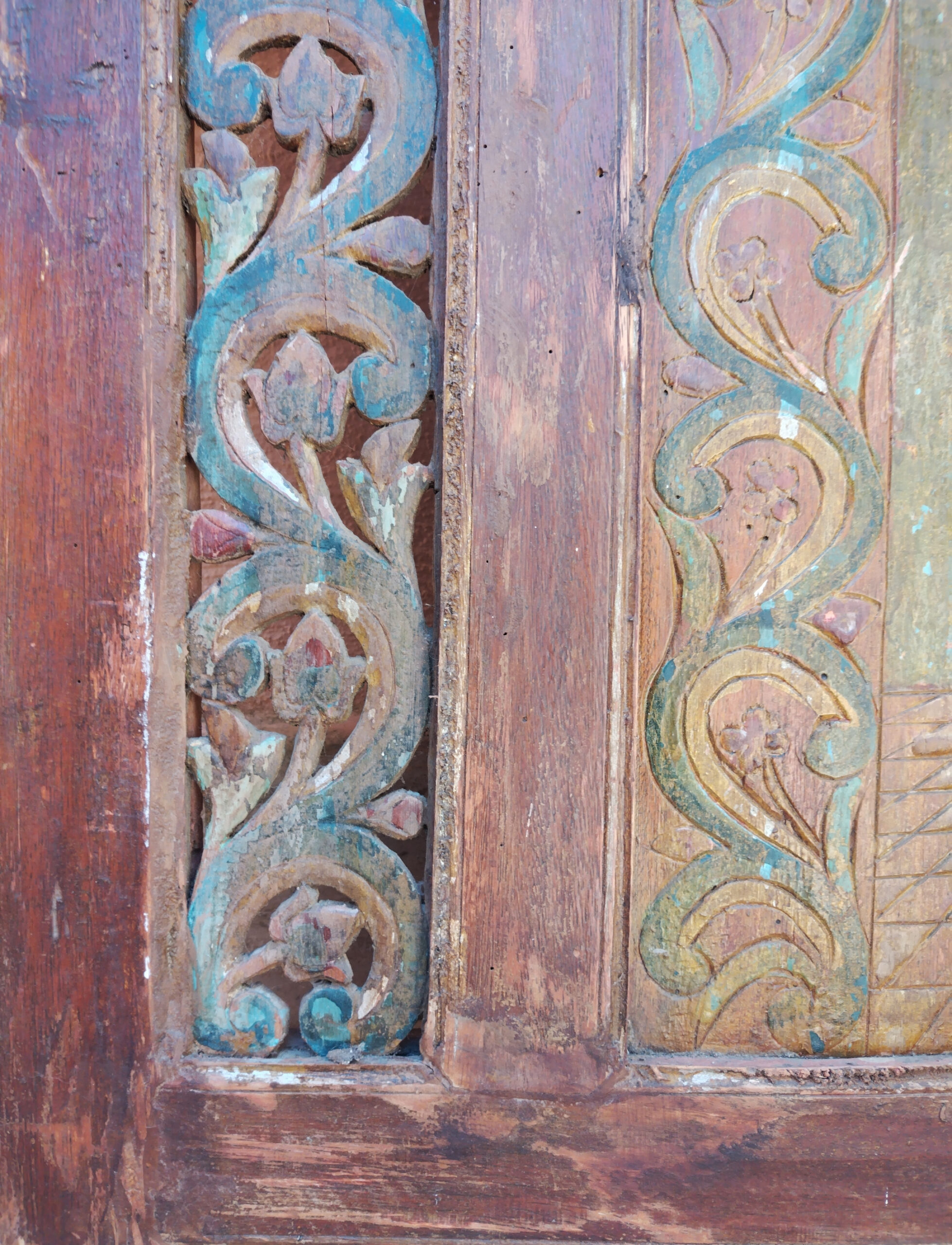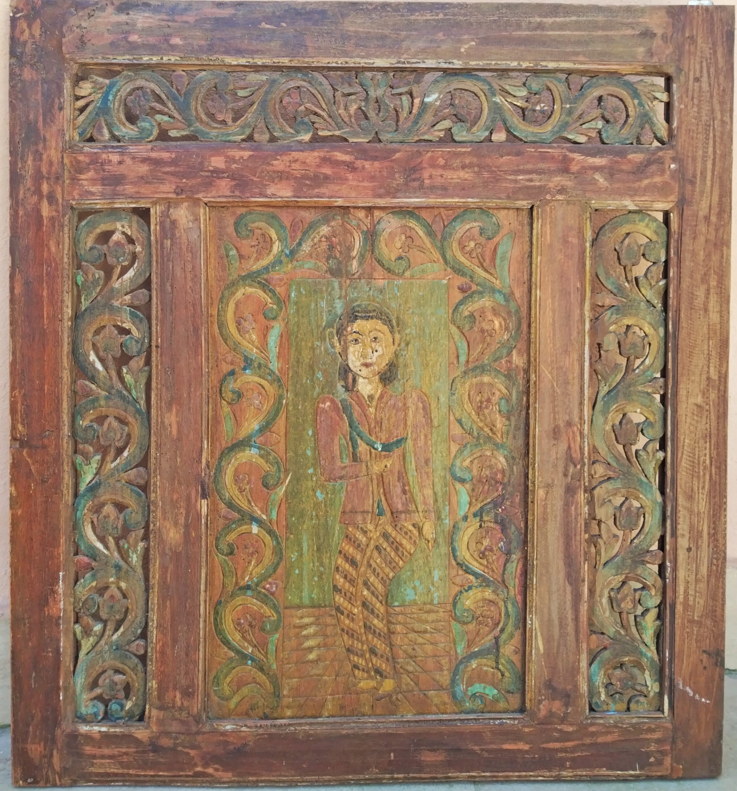 Pannello d’ antiquariato indonesiano, in legno di teak colorato di vari colori intagliato a motivo floreale e inciso