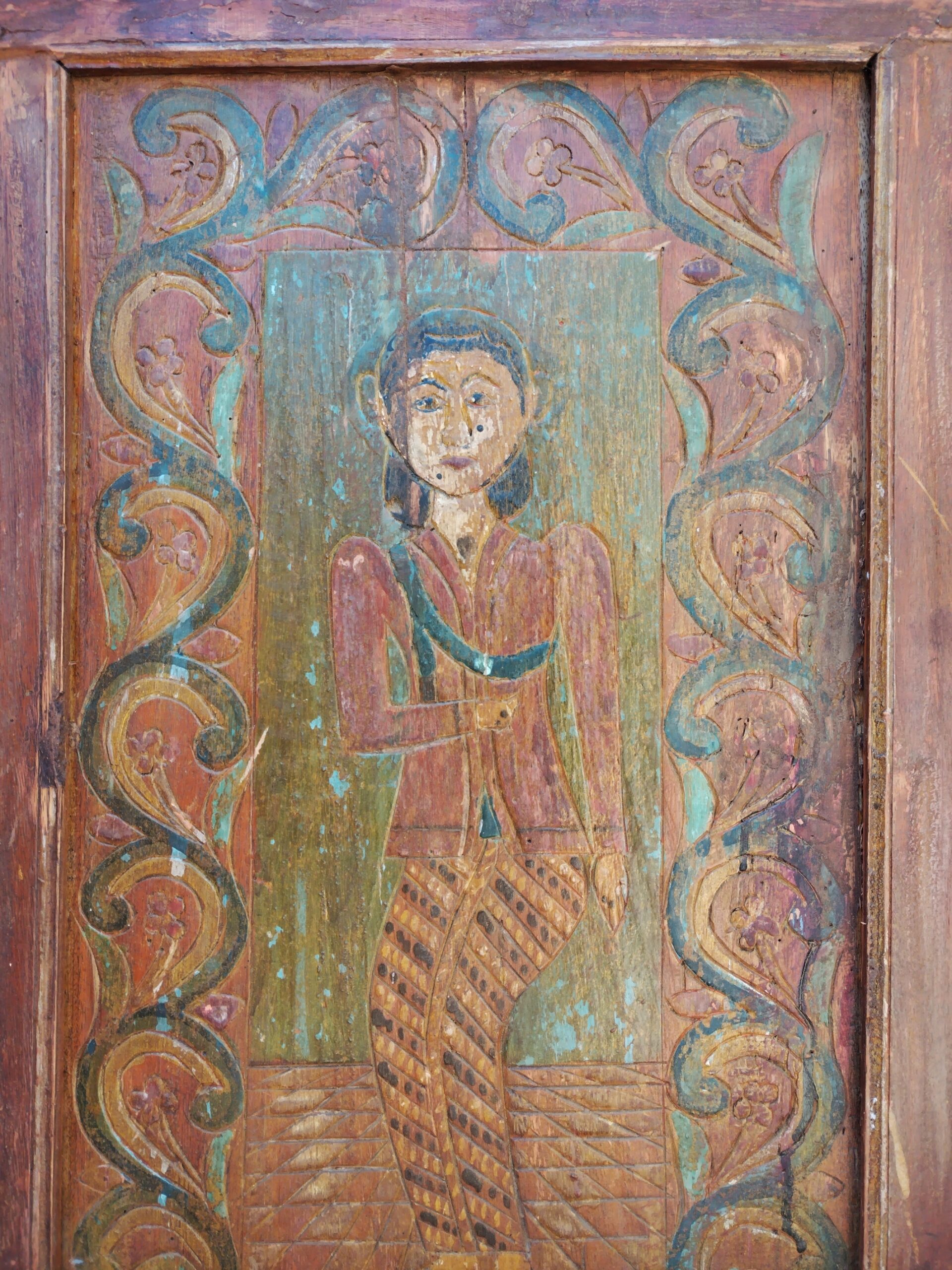 Al centro del pannello, un’incisione raffigura una donna, circondata da fiori intagliati con maestria. Questa figura femminile incarnare la bellezza e la grazia della donna indonesiana. I fiori intagliati che la circondano aggiungono un tocco di delicatezza e femminilità, creando un’atmosfera di serenità e bellezza naturale.