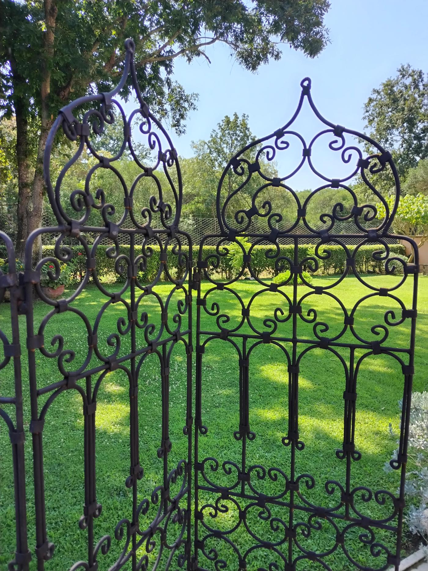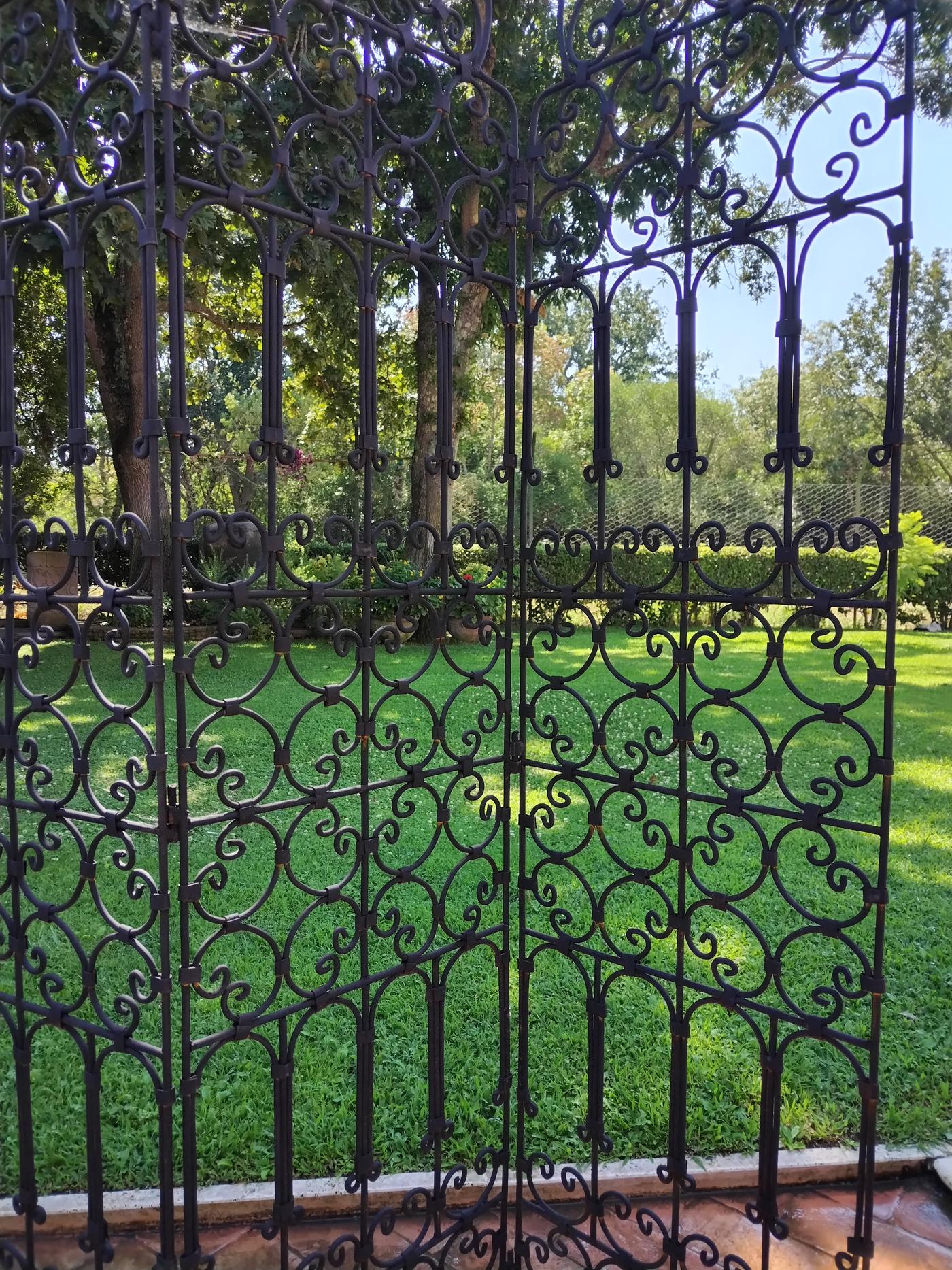 La fitta lavorazione in ferro battuto è un intreccio armonioso di motivi arabescati, con decorazioni ricurve e giochi di pieni e vuoti che creano un effetto scenografico e leggero.