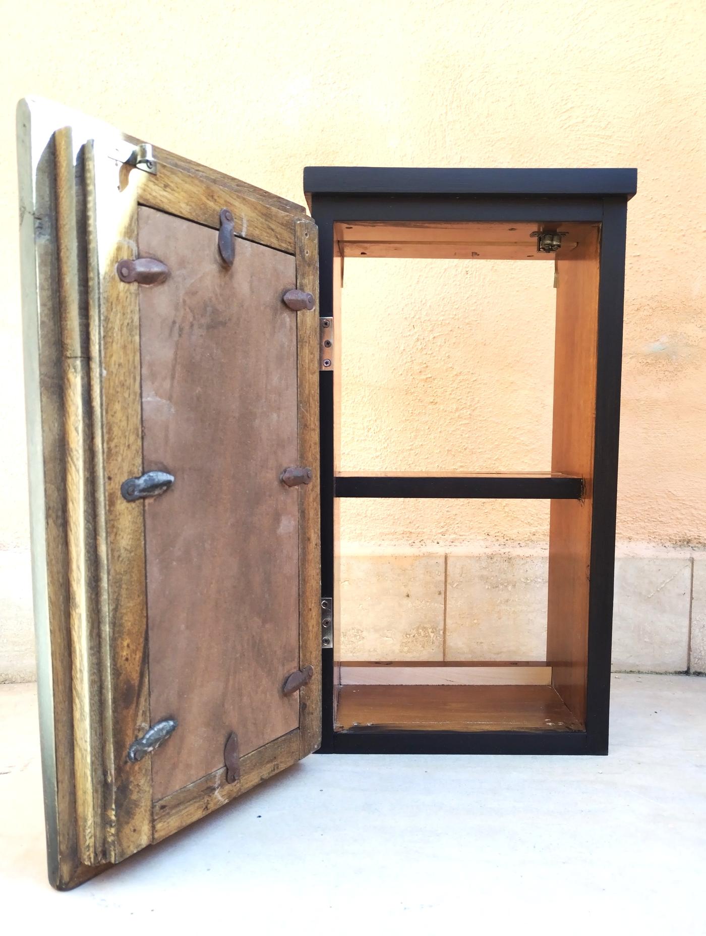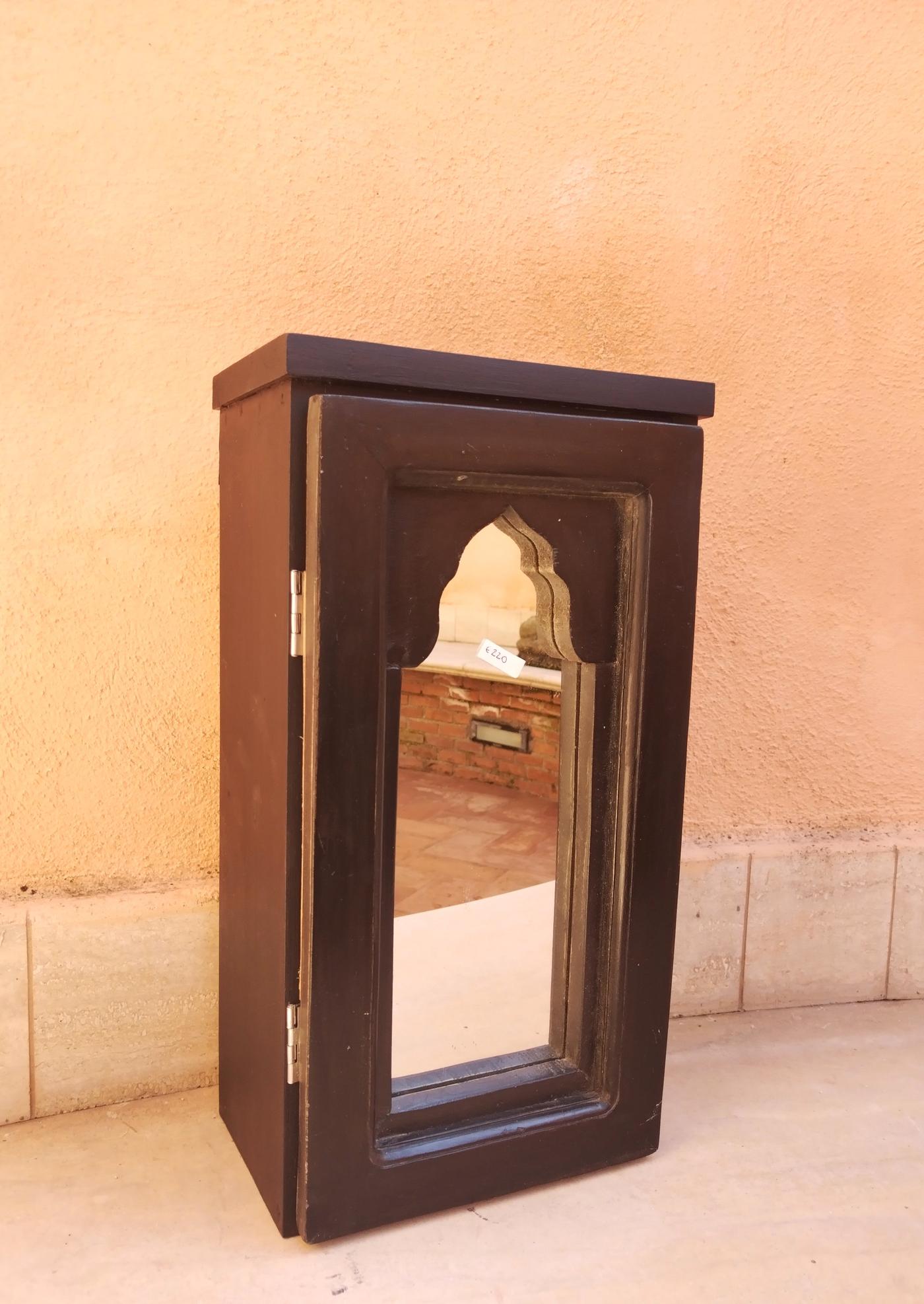 Piccolo pensile porta oggetti in legno color nero, realizzato in India, con anta specchiata