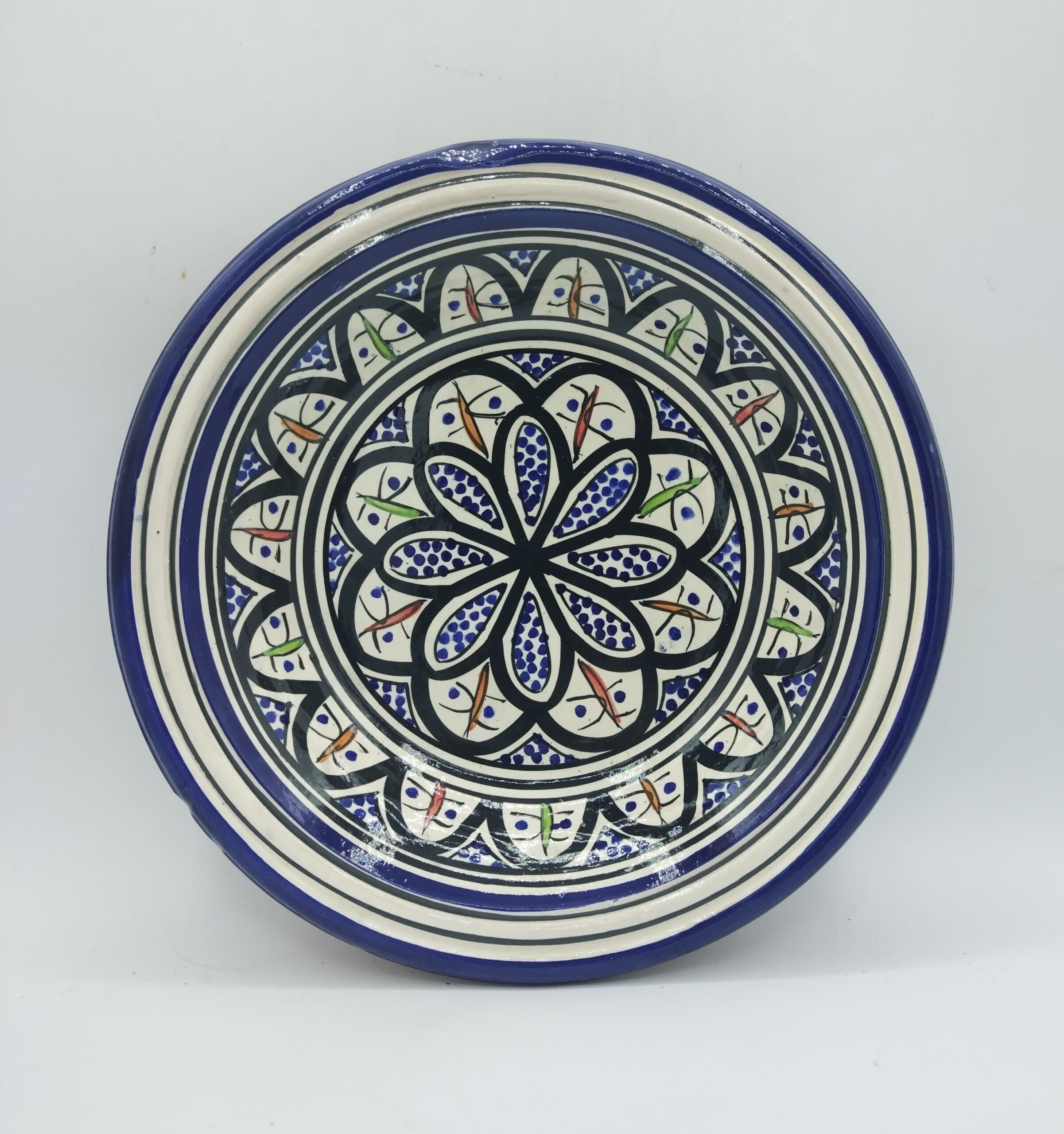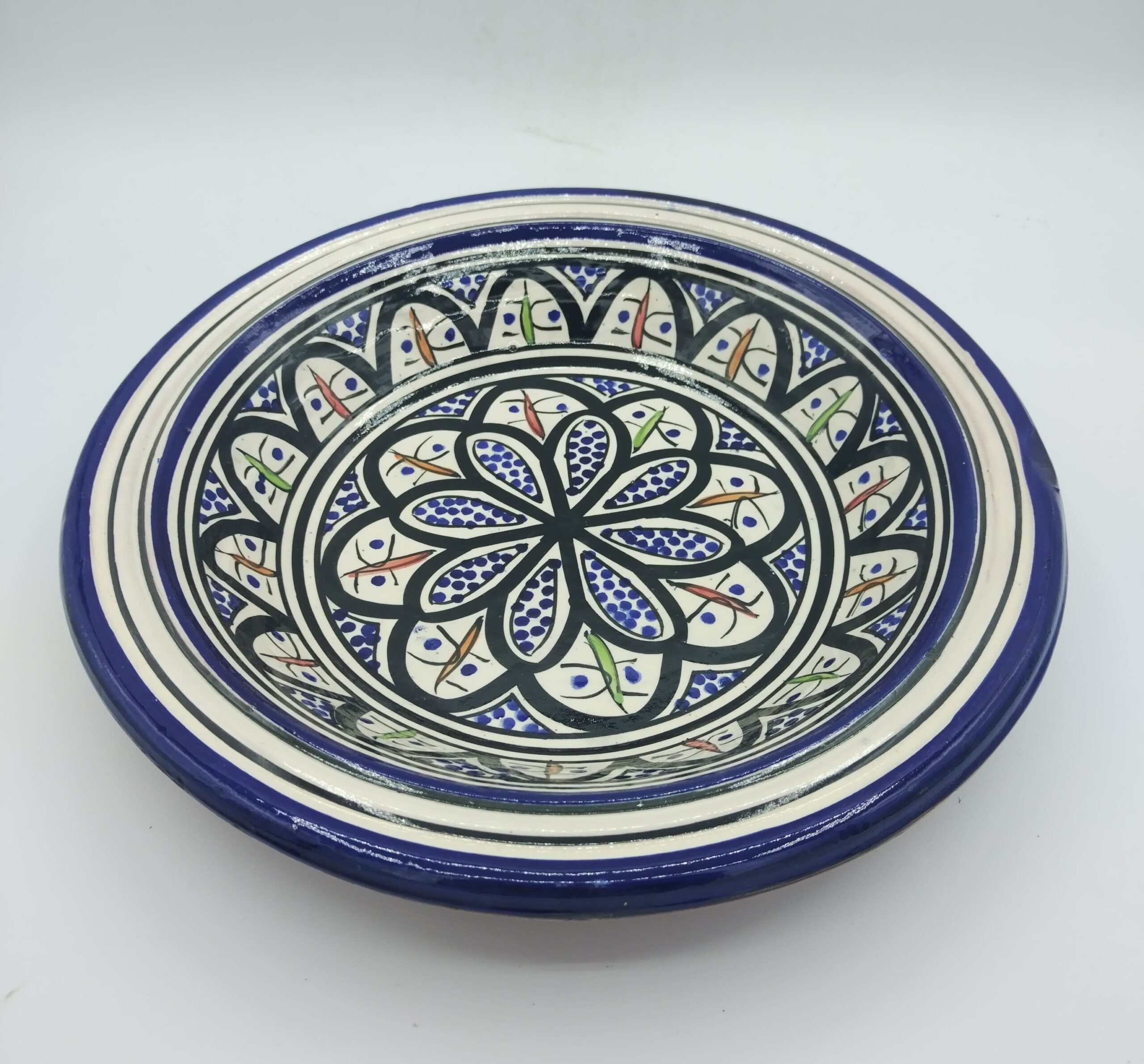 Piatto fondo decorato sui toni del blu, nero rosso e verde su fondo bianco, con motivi floreali in terracotta smaltata, realizzato artigianalmente in Marocco