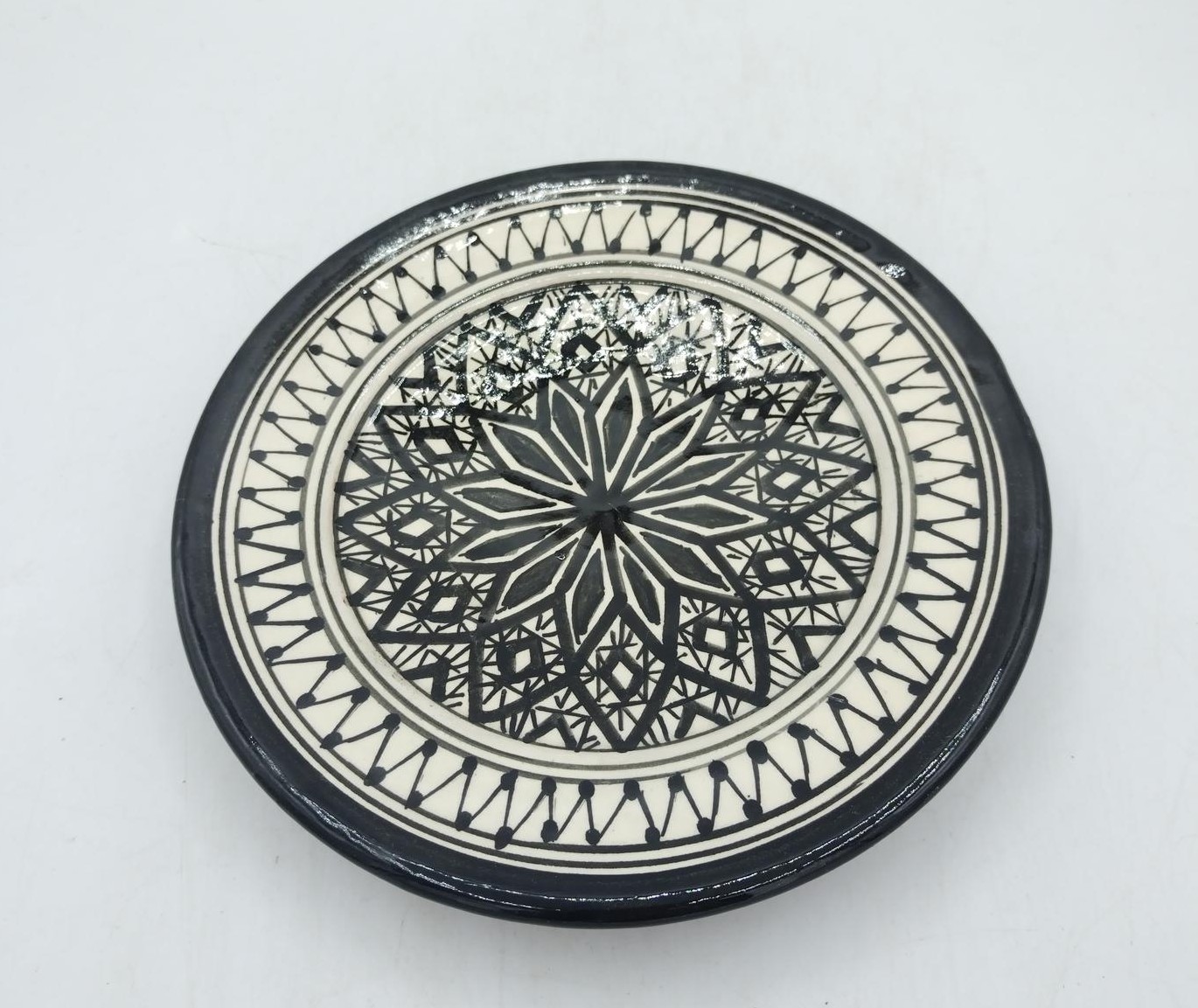 Piatti piccoli da dessert con fondo bianco decorati sui toni del nero con motivi geometrici in terracotta smaltata, realizzati artigianalmente in Marocco