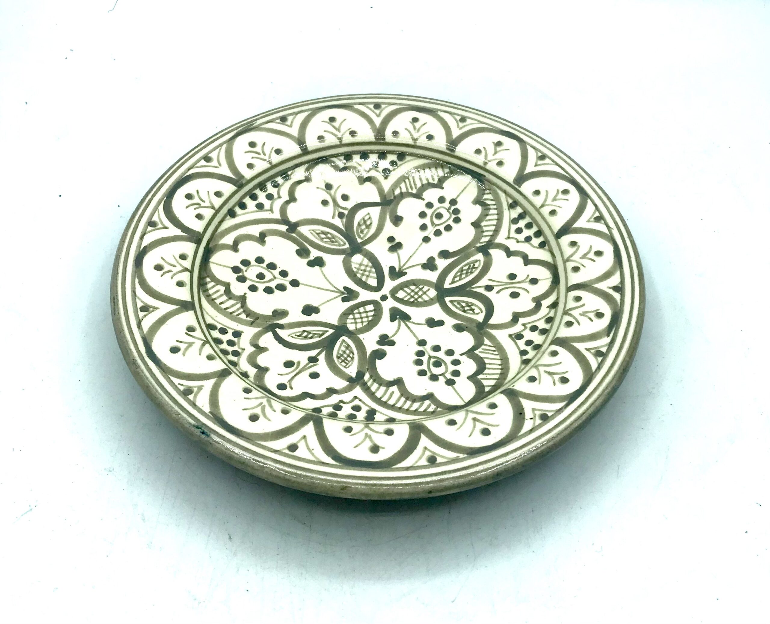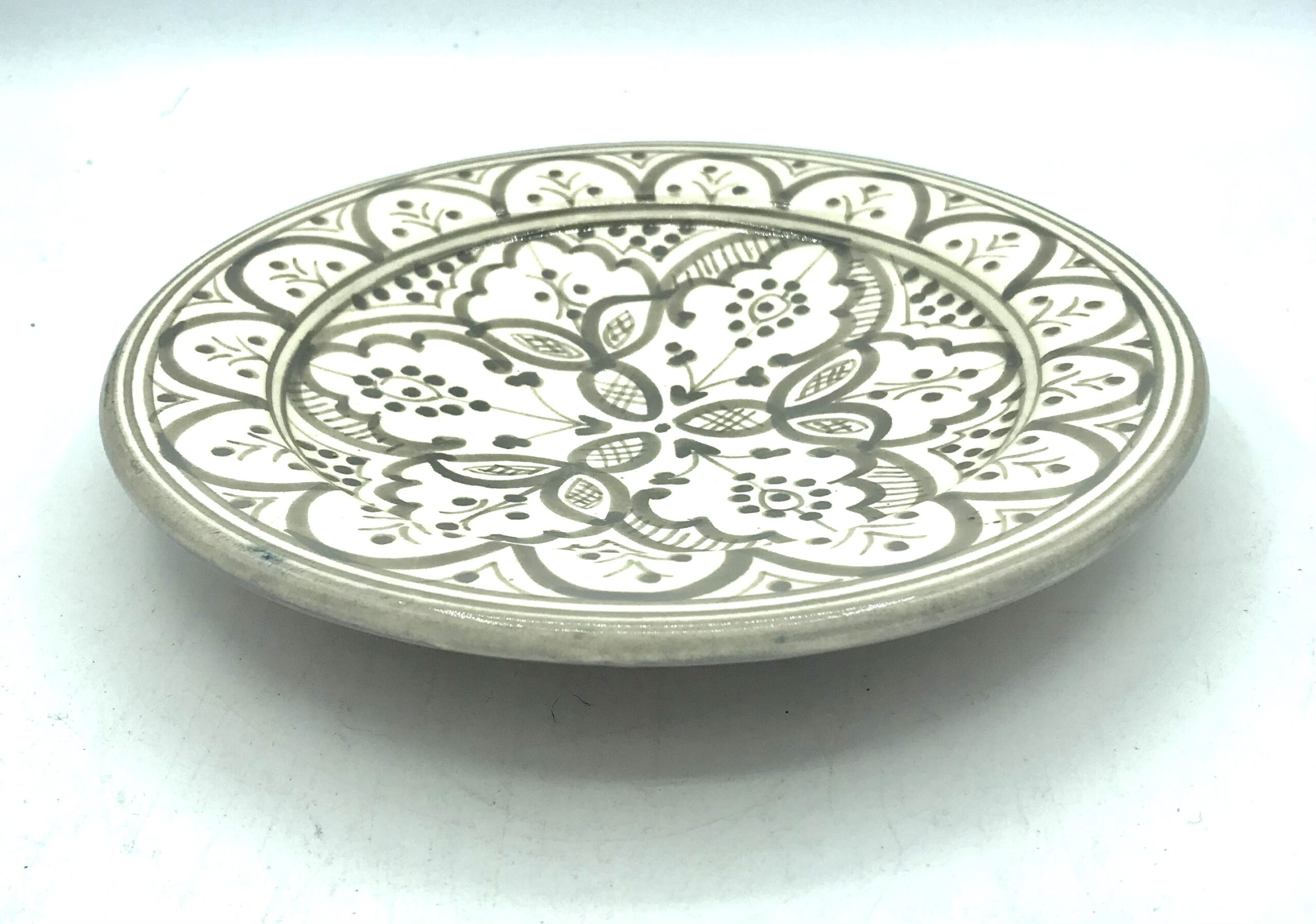 Piatto realizzato artigianalmente in Marocco con disegni floreali grigi tipicamente orientali