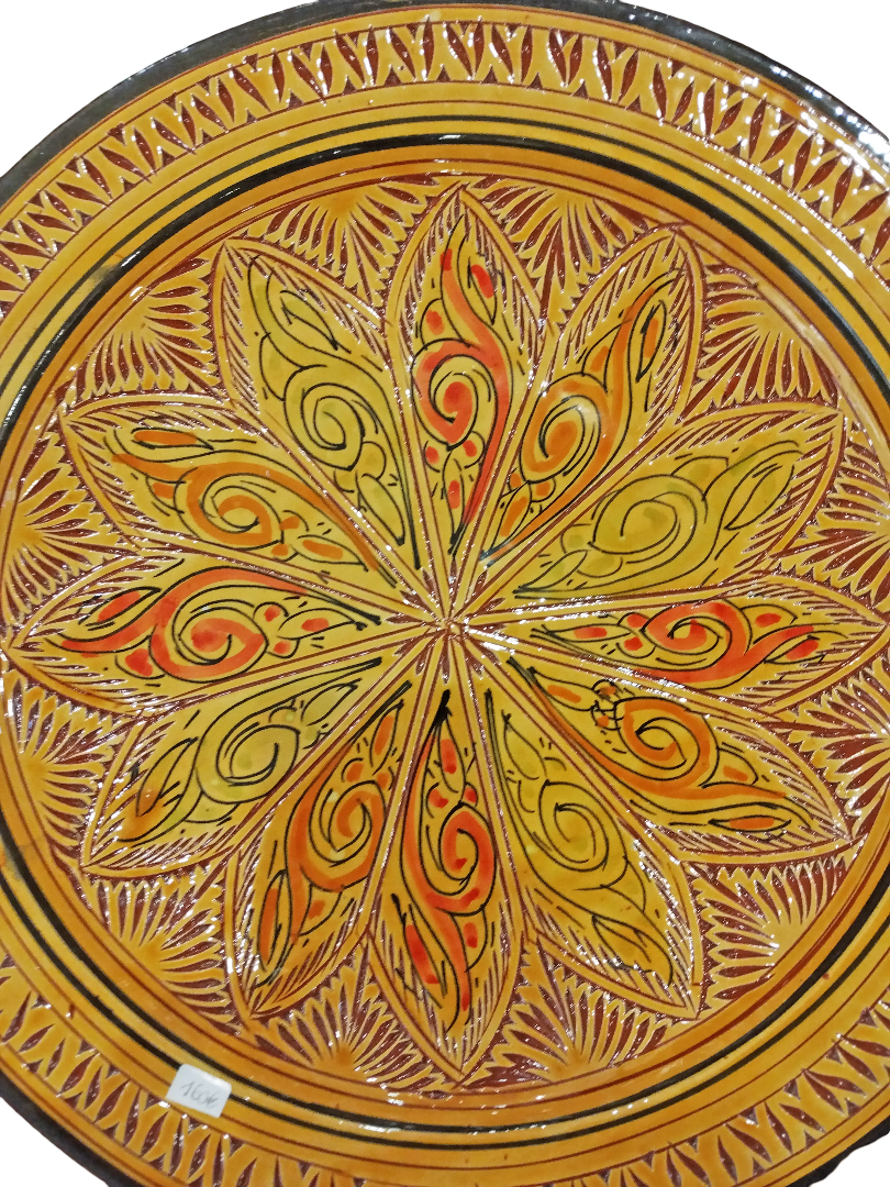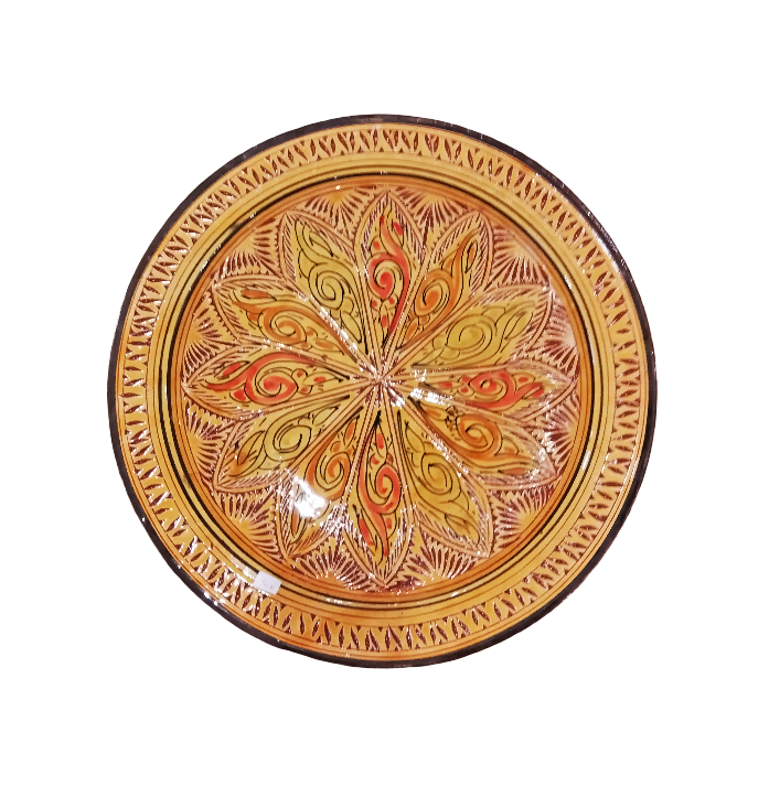 Piatto Marocchino in terracotta smaltata, interamente decorato da intagli geometrici e floreali, per uso alimentare ed ornamentale