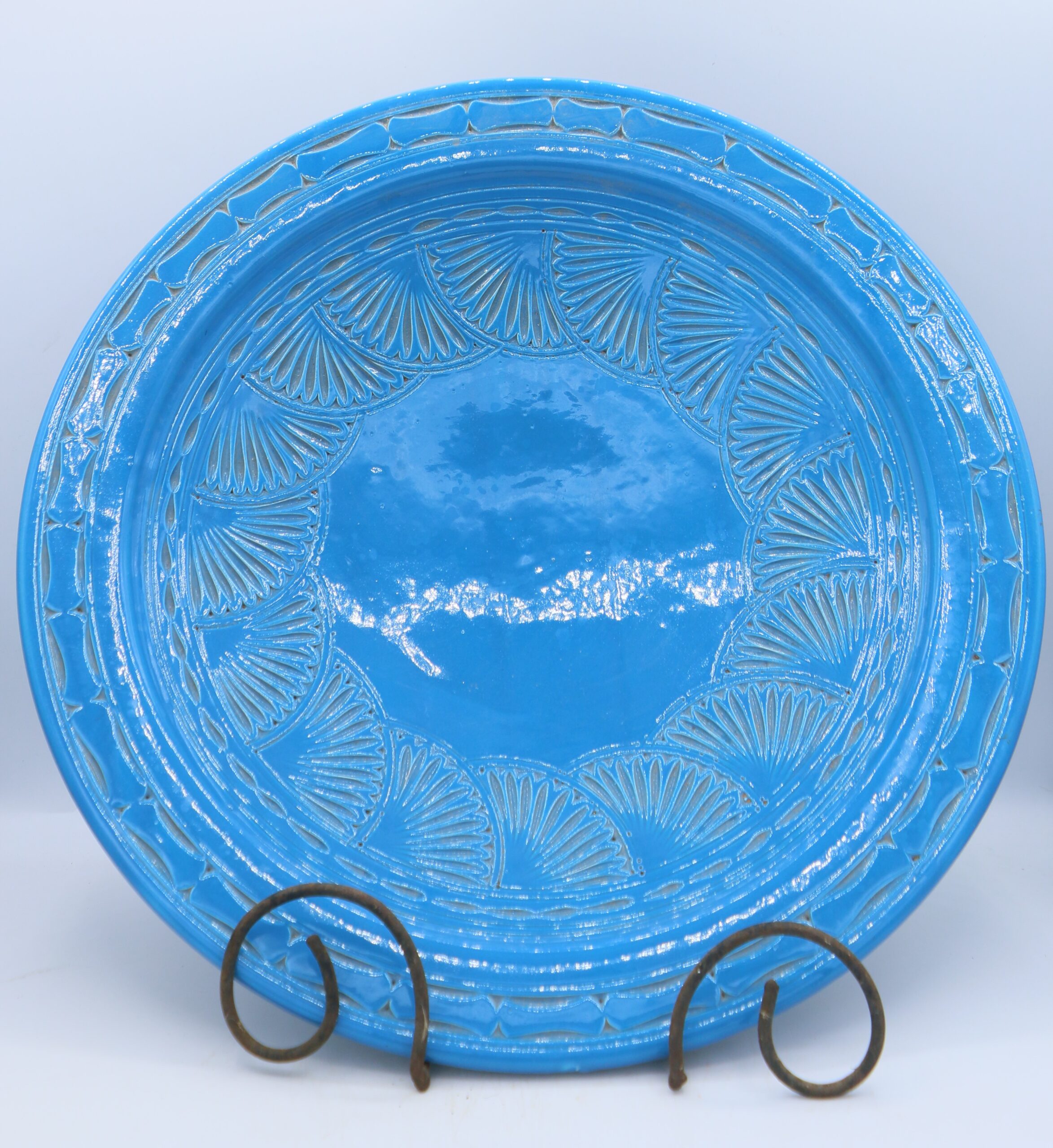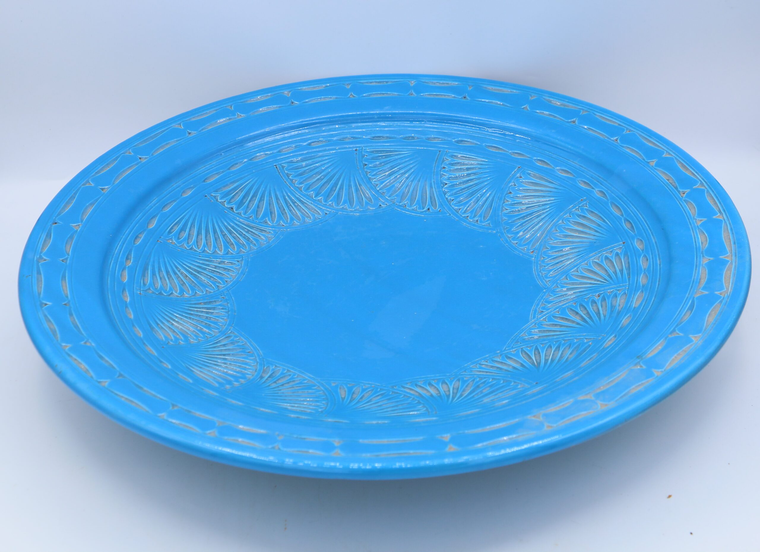 Piatto Marocchino in terracotta smaltata di colore azzurro, per uso alimentare ed ornamentale, interamente decorato da intagli geometrici e floreali