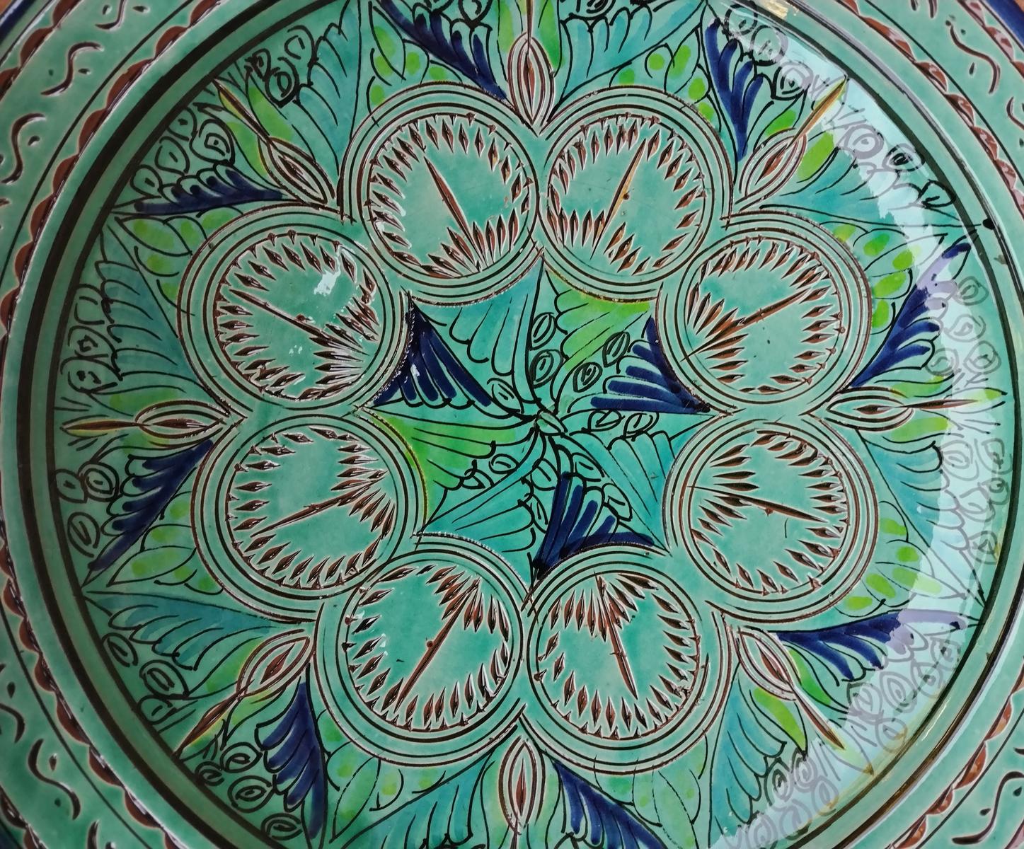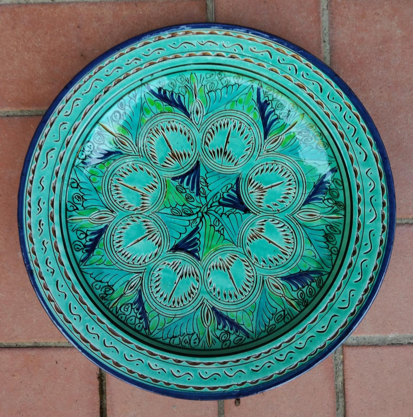 Piatto Marocchino in terracotta smaltata, interamente decorato con intagli geometrici e floreali, per uso alimentare ed ornamentale