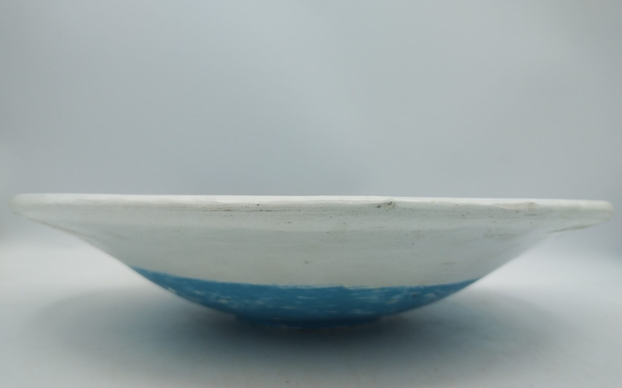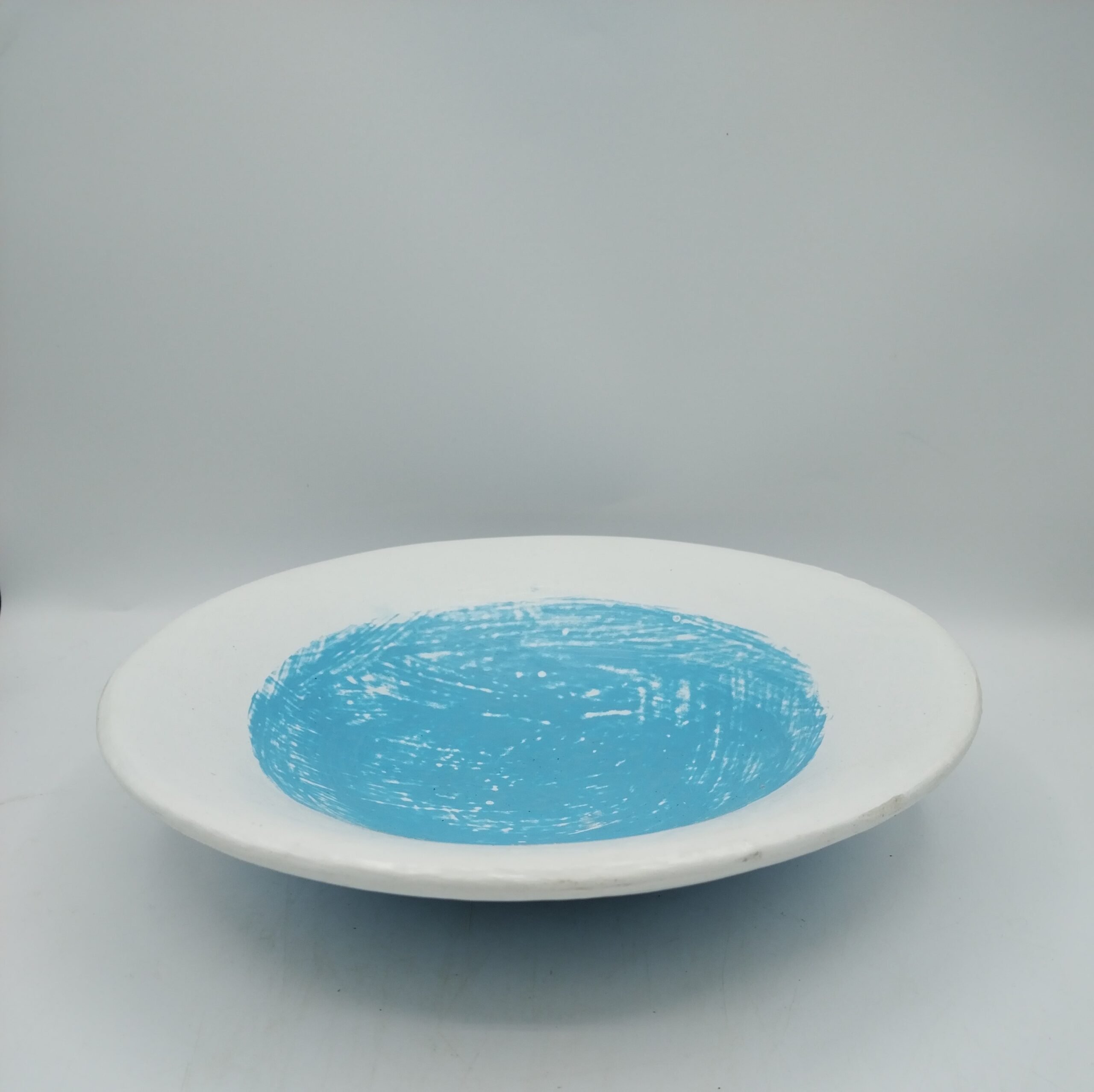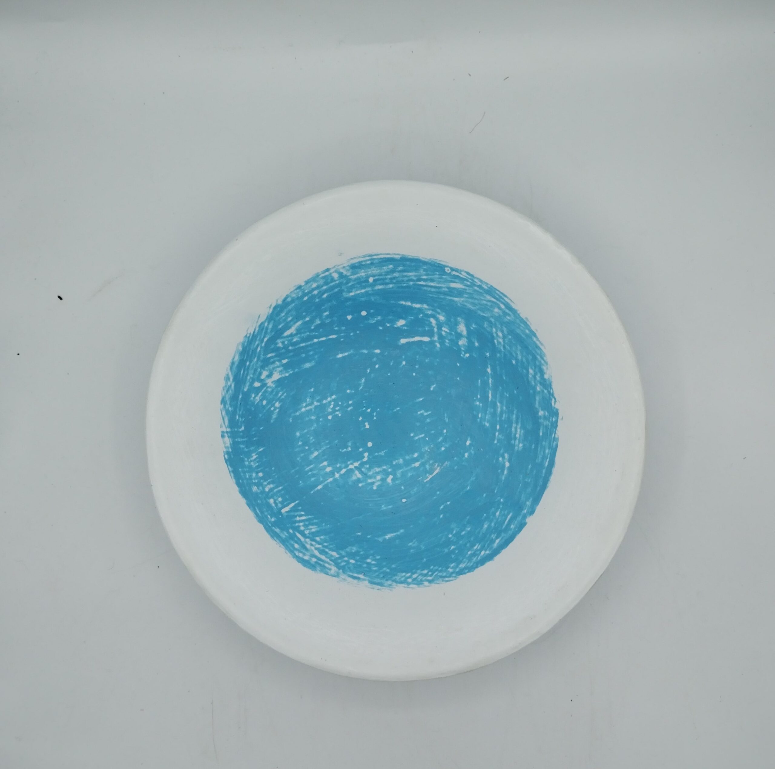 Piatto piccolo ornamentale color bianco con il fondo e la parte sotto color azzurro, realizzato artigianalmente in Indonesia da usare come ciotola svuota tasche, non per uso alimentare