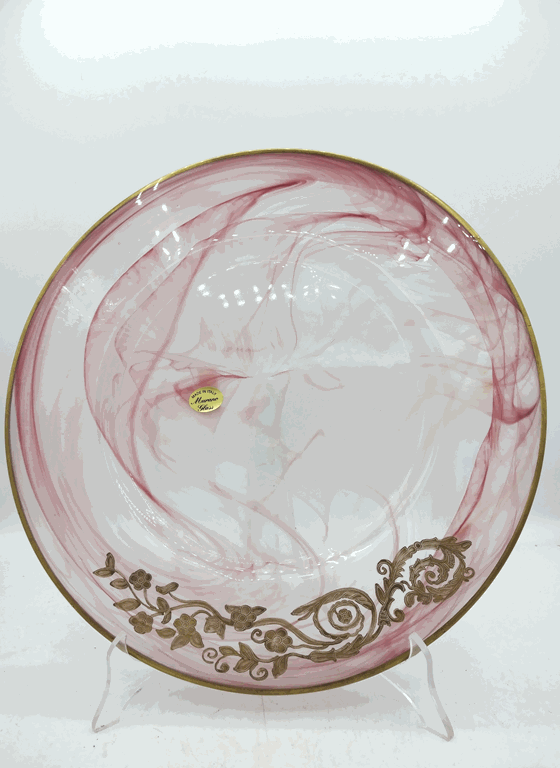 La parte più distintiva di questo piatto, oltre alla lavorazione del vetro, è la decorazione con motivi floreali in foglia d’oro che dona una lussuosa lucentezza ai dettagli incisi, creando un contrasto affascinante con il vetro rosa circostante.