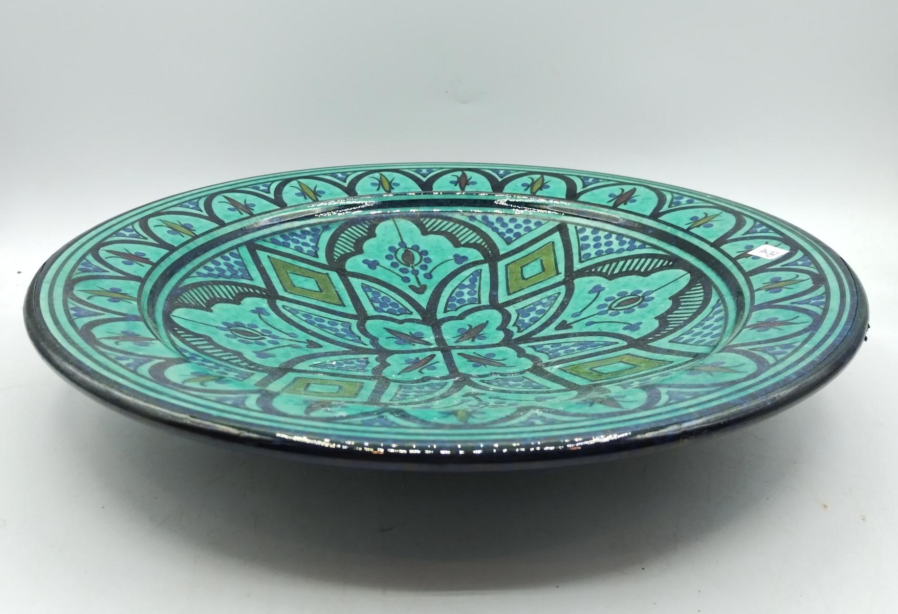 Piatto verde acqua con motivi floreali in terracotta smaltata, realizzato artigianalmente in Marocco