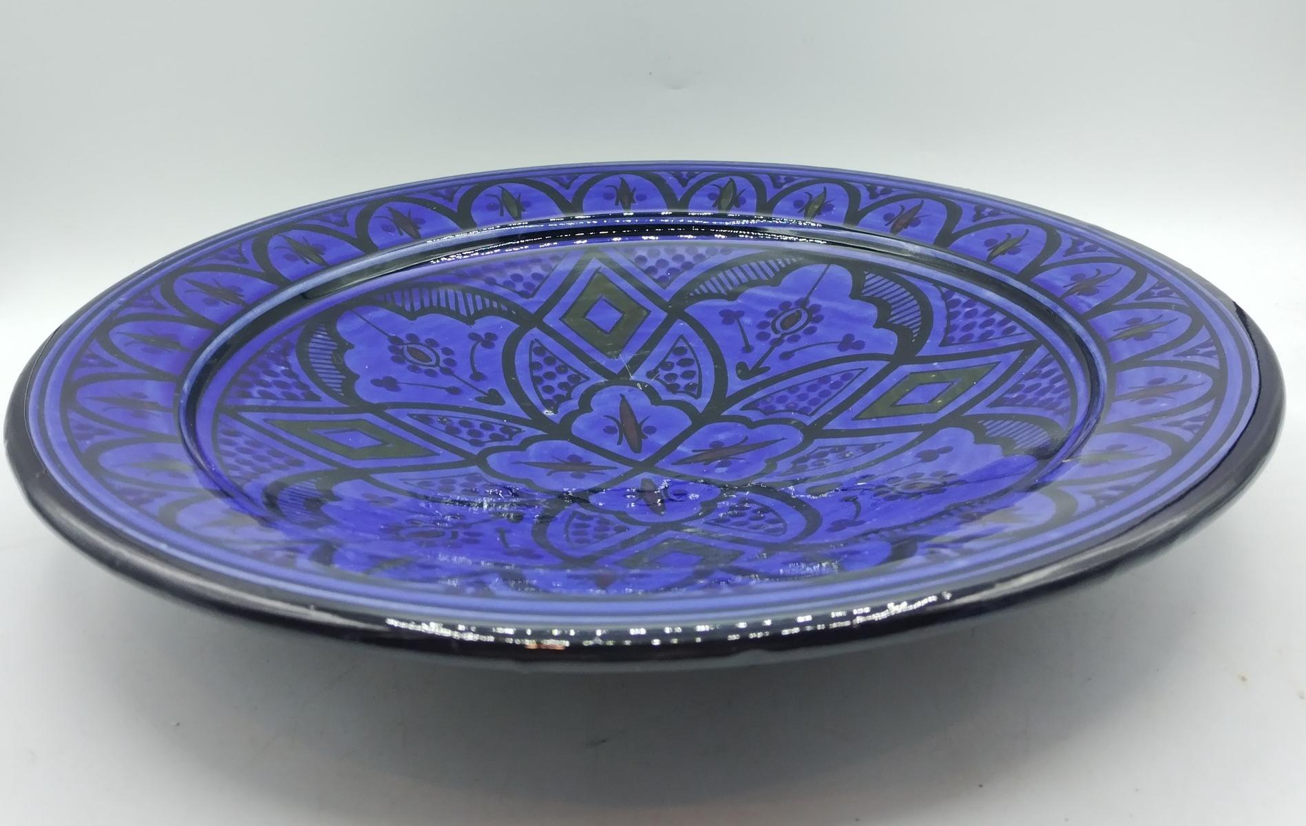 Piatto blu con motivi floreali in terracotta smaltata, realizzato artigianalmente in Marocco