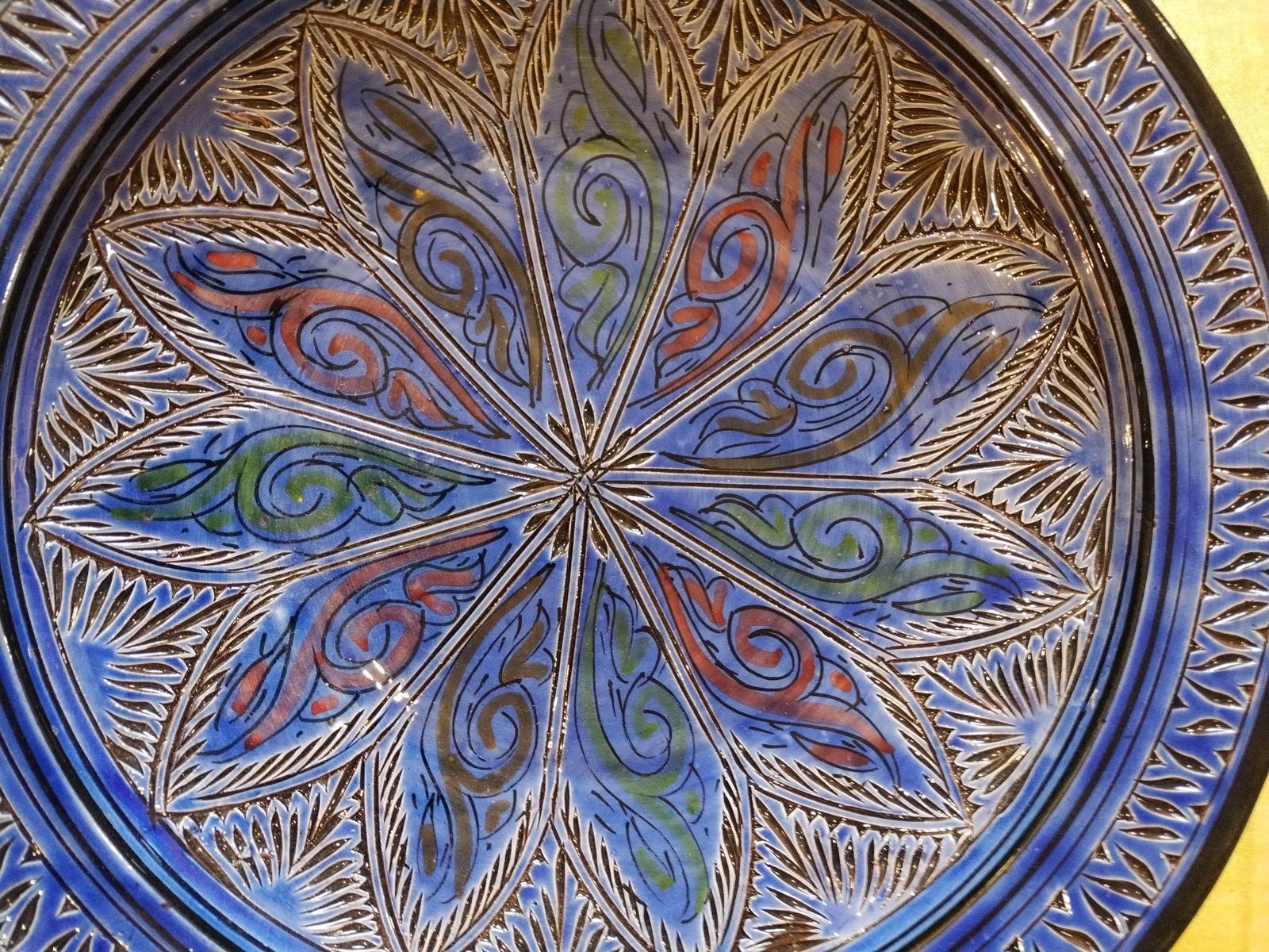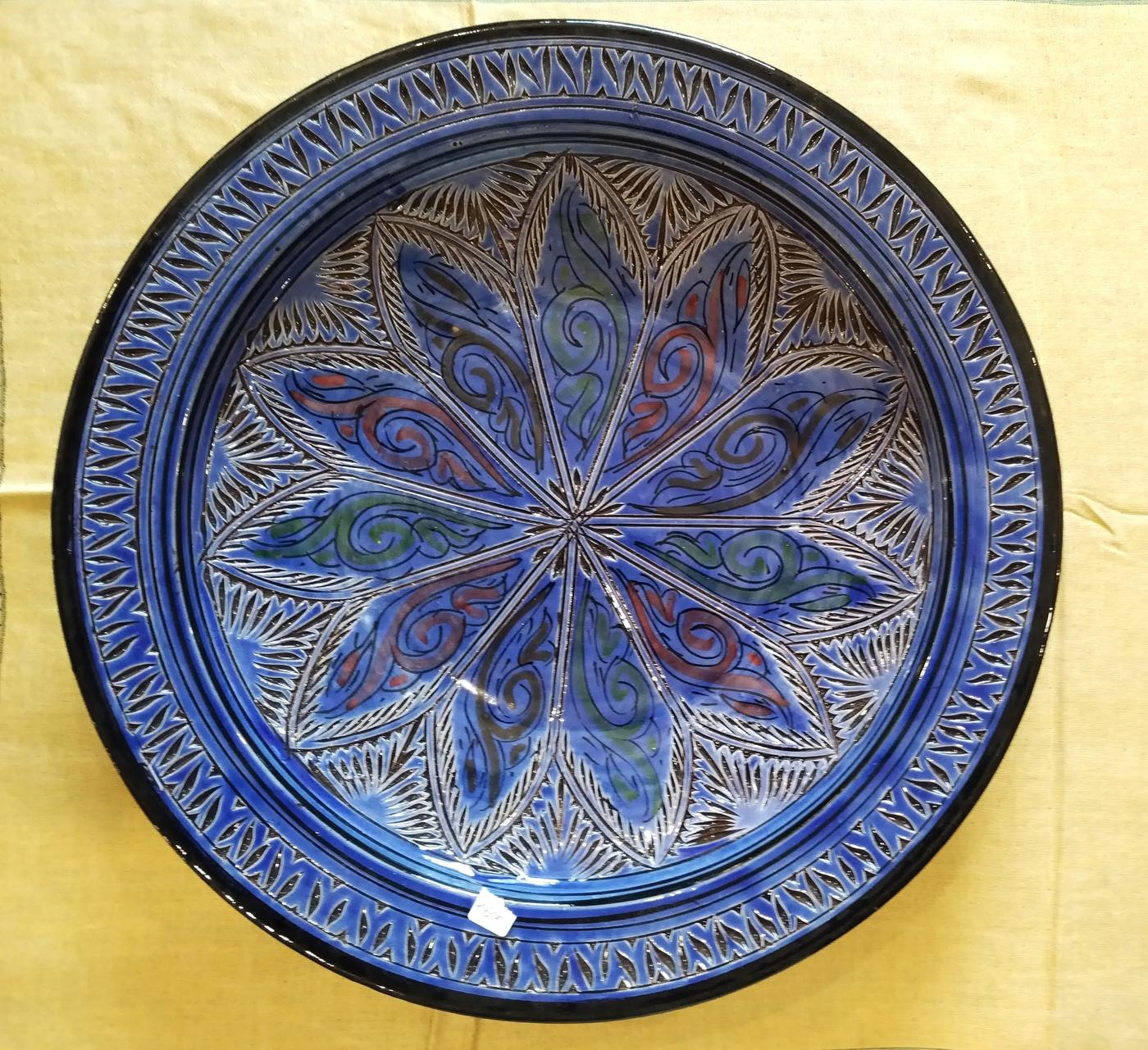 Piatto Marocchino in terracotta smaltata blu, interamente decorato con intagli geometrici e floreali, per uso alimentare ed ornamentale