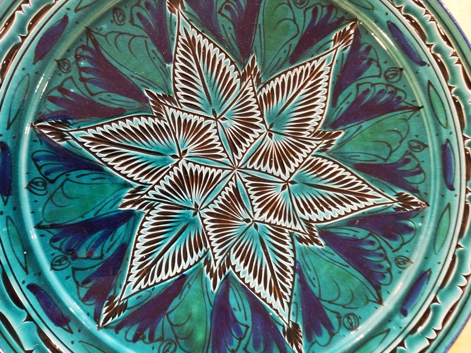 Colpisce per le sue ampie dimensioni e per la splendida tinta verde acqua con intricati intagli geometrici e floreali che formano motivi complessi e simmetrici, evidenziati in nero e blu scuro, a contrasto con lo sfondo che dona luminosità e profondità e sembra far uscire una grande stella.