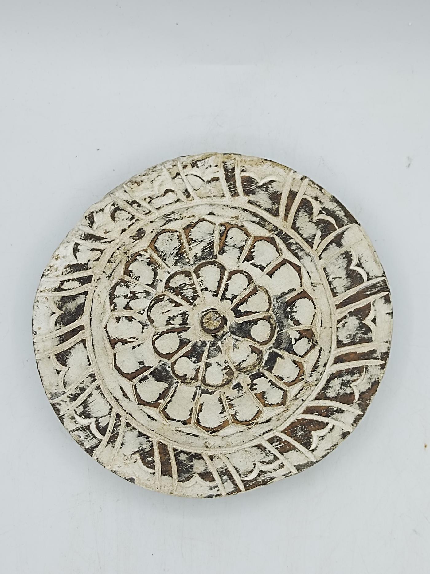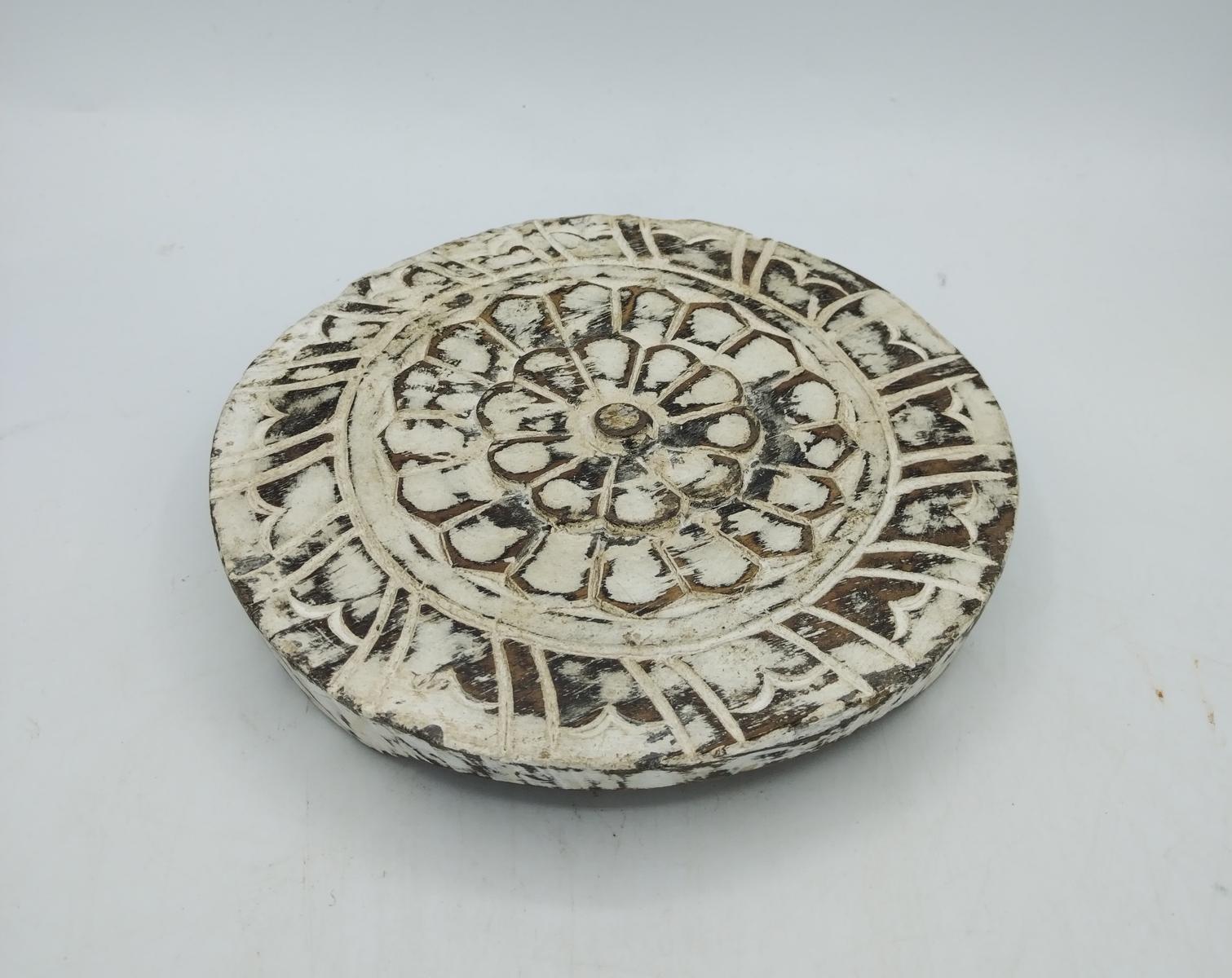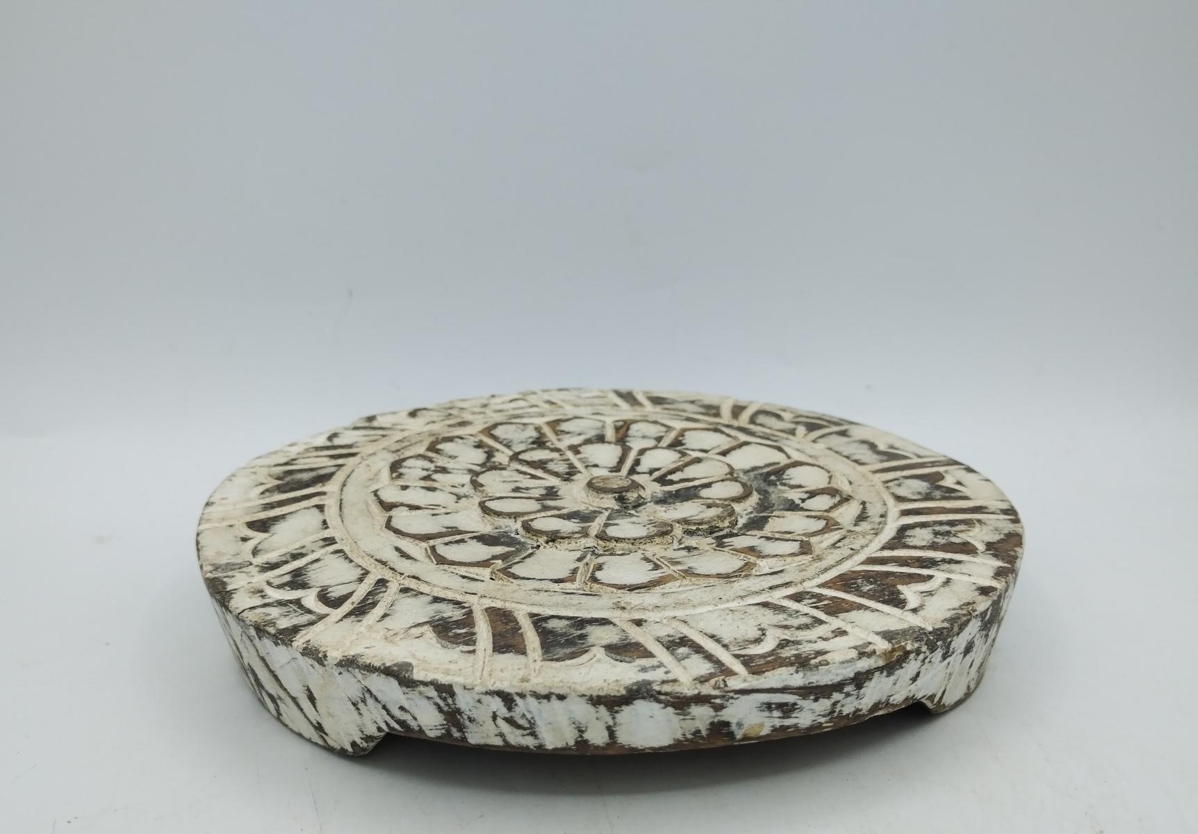 Poggia pentole in legno scuro decapato bianco, realizzato in India con disegno floreale