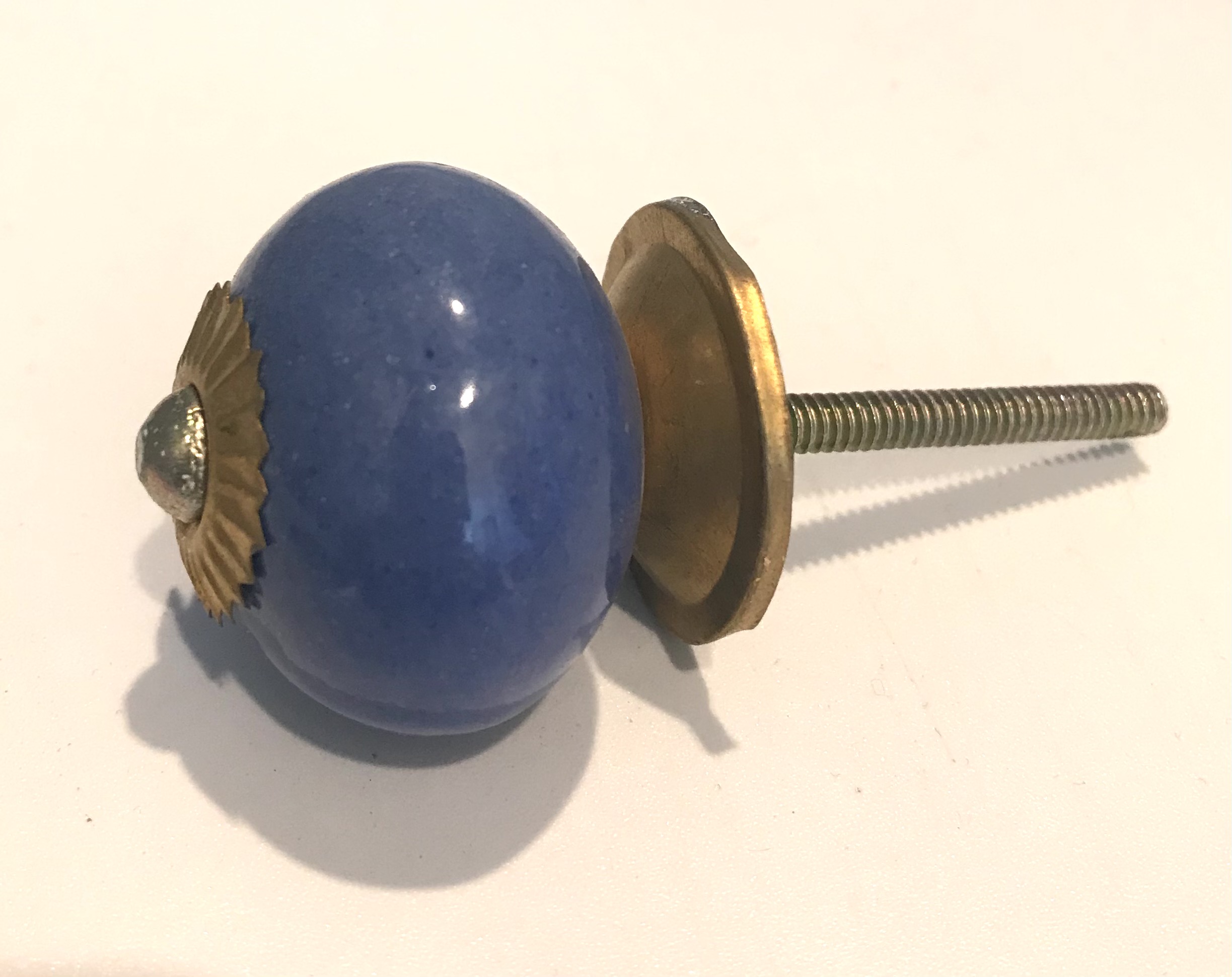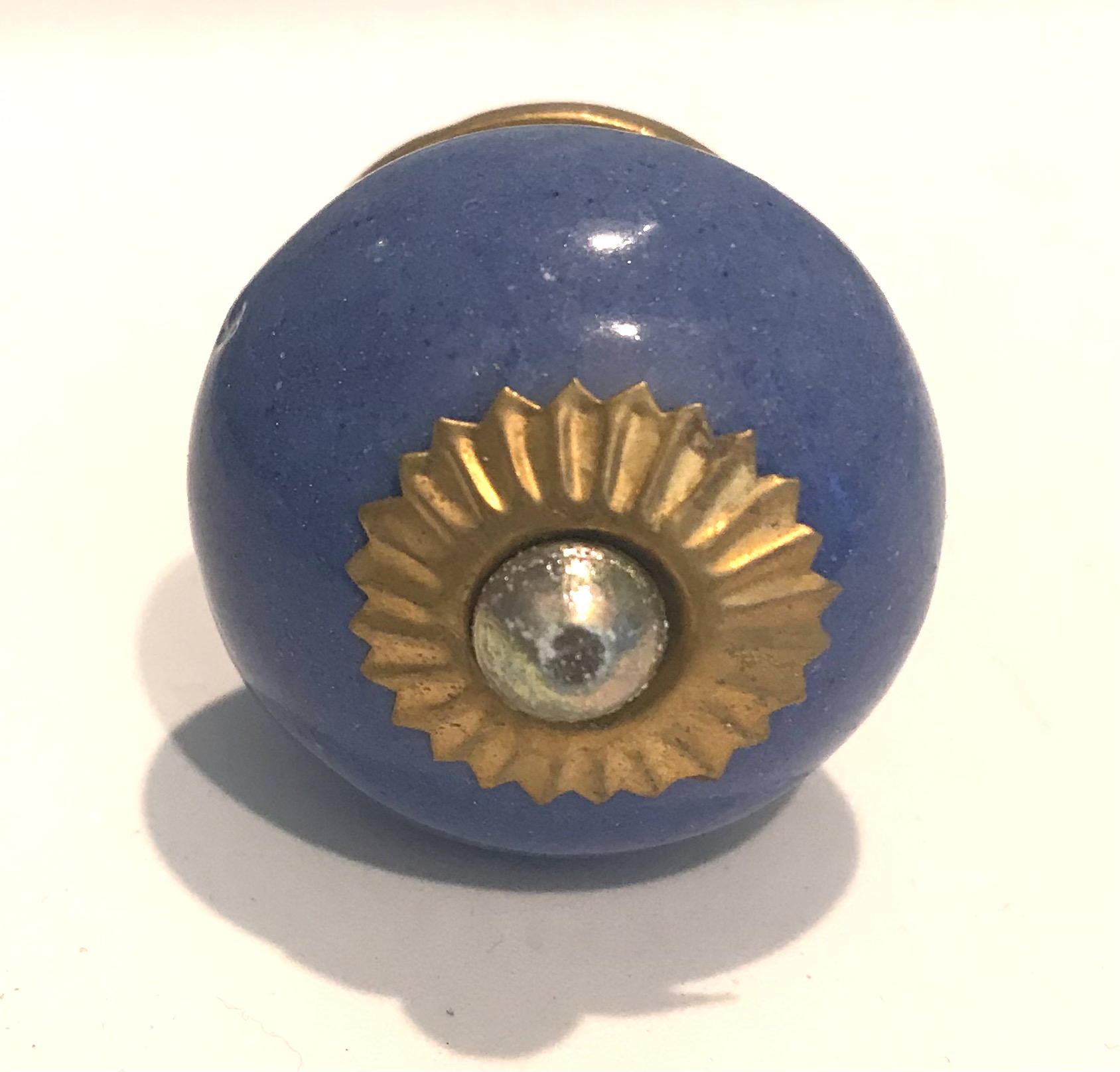 Pomelli indiani in ceramica e metallo tondi color avio con attacchi in metallo dorato