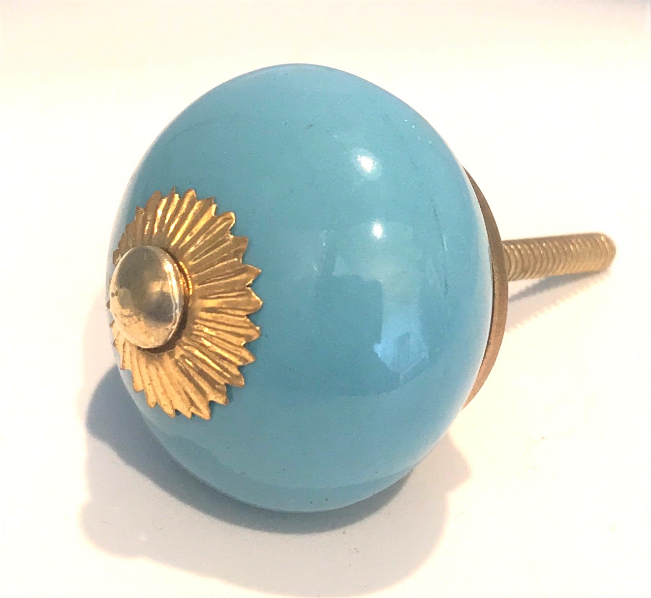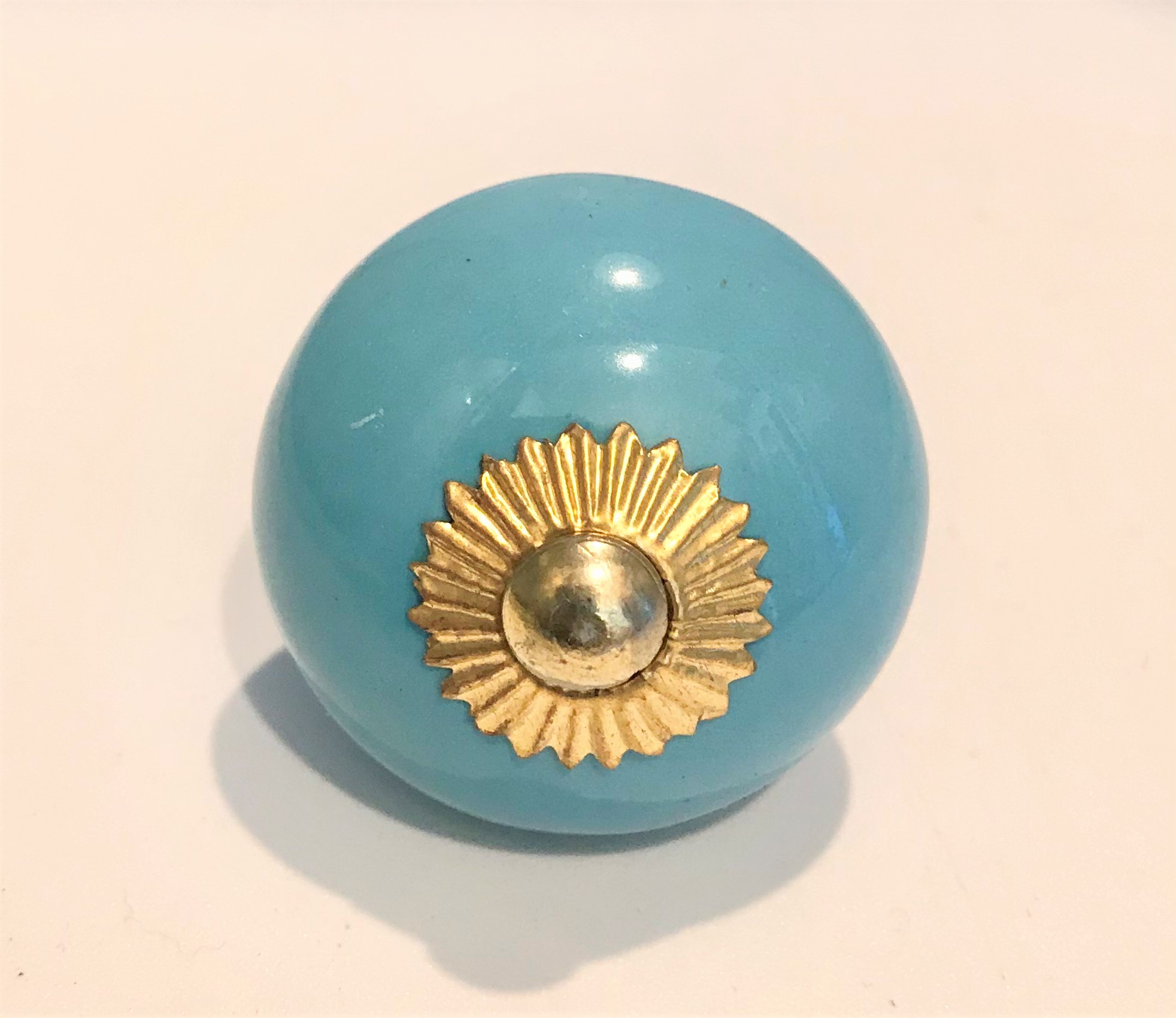 Pomelli indiani in ceramica e metallo tondi color turchese con attacchi in metallo dorato