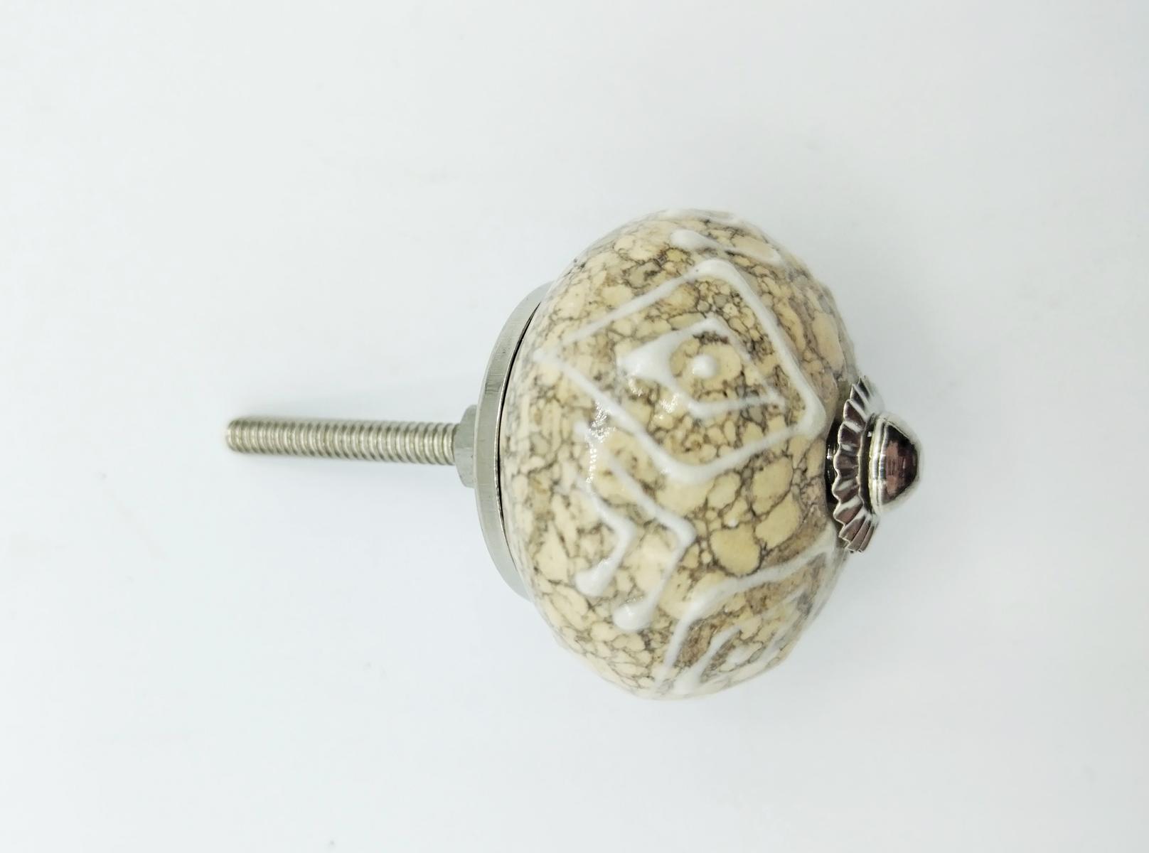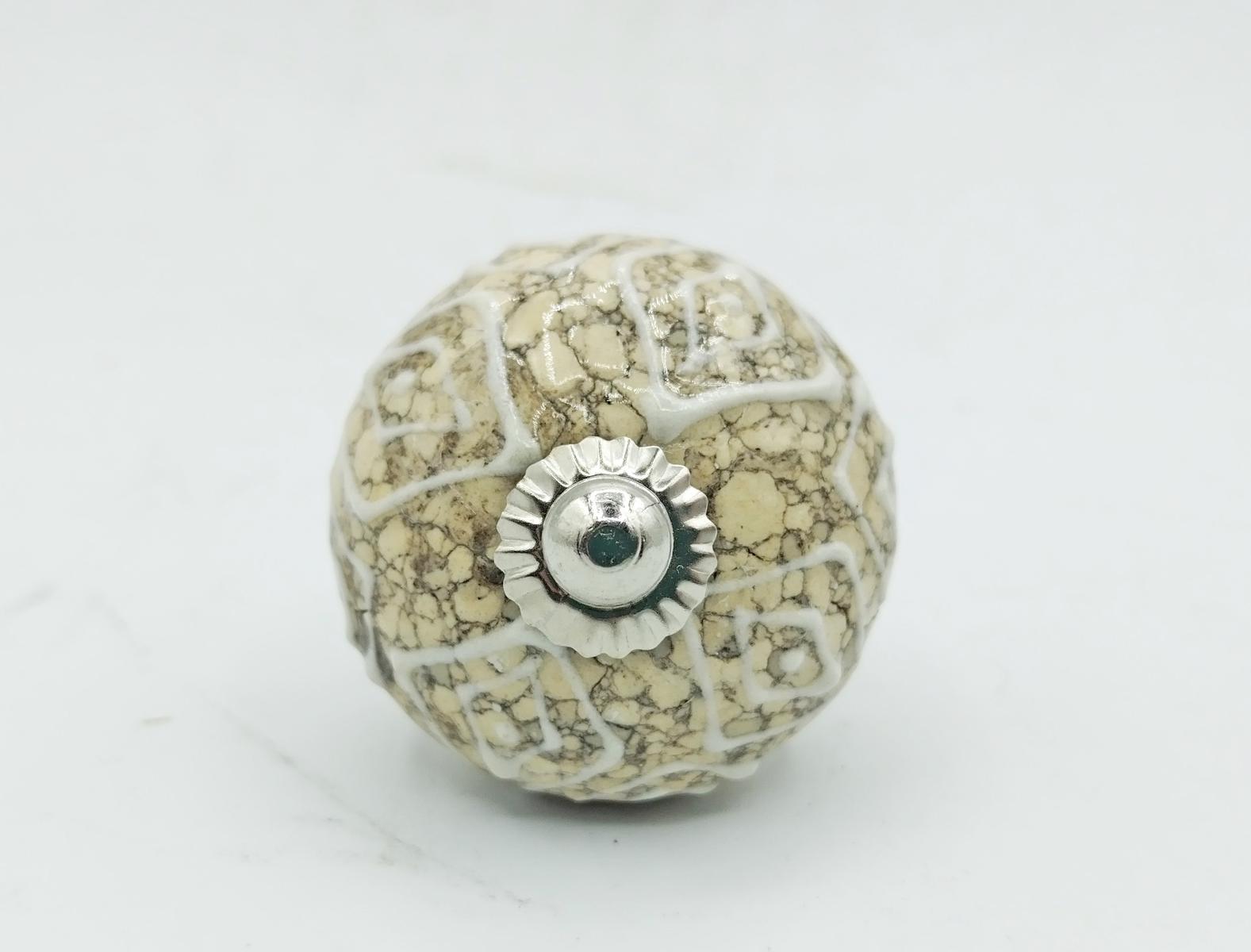 pomelli indiani in ceramica e metallo tondi color crema, con attacchi in metallo argentato.