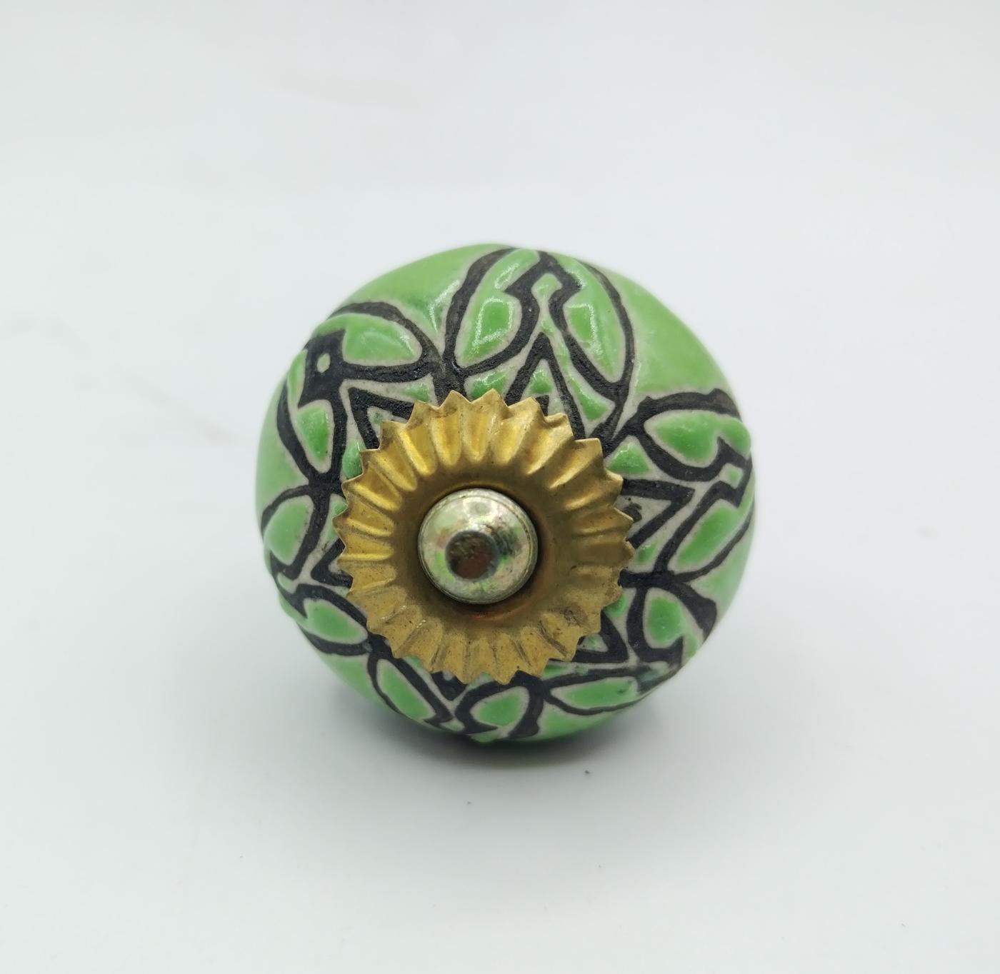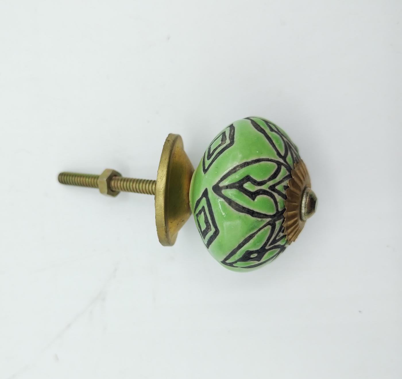 pomelli indiani in ceramica e metallo tondi color verde con incisioni a motivo geometrico e floreale, con attacchi in metallo dorato.