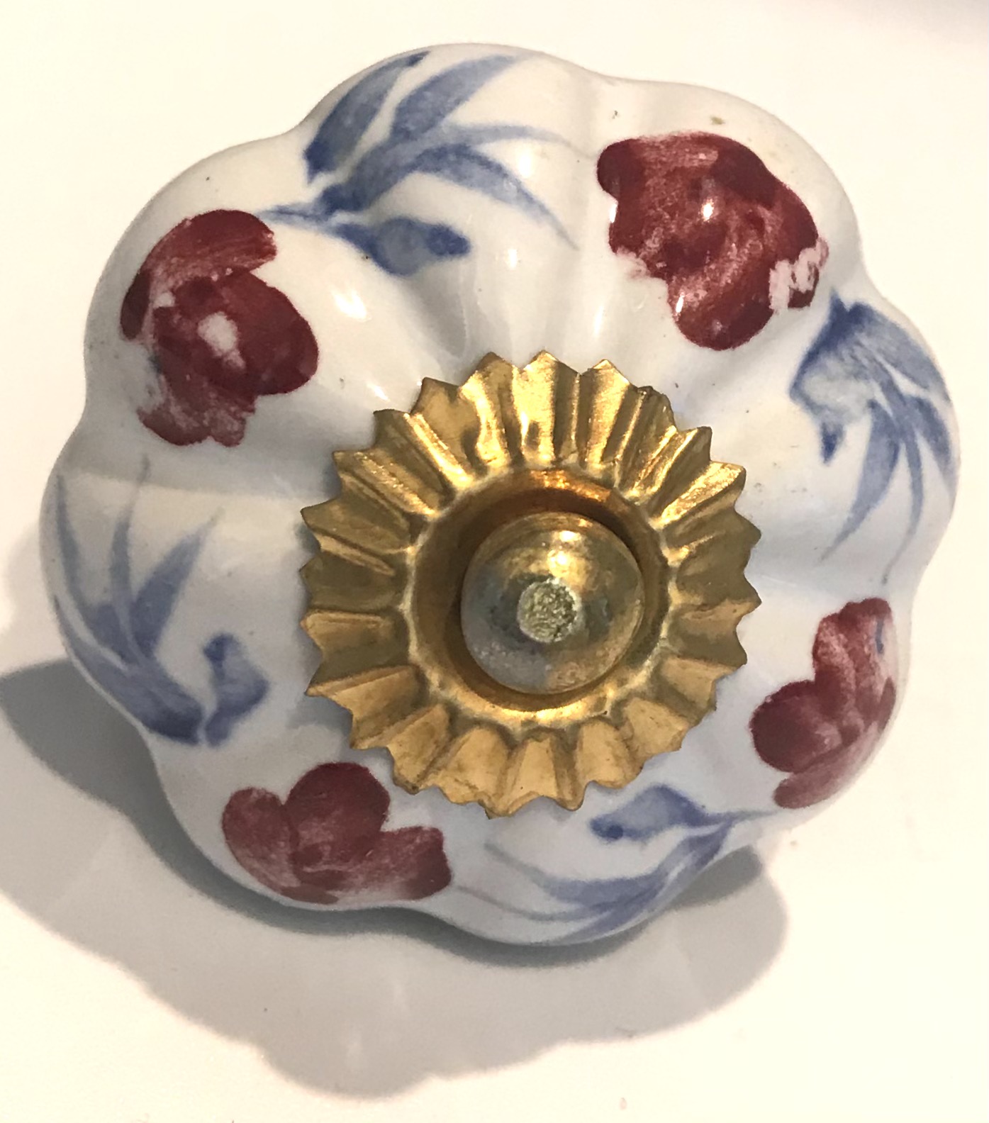 Pomelli indiani in ceramica e metallo forma di fiore color bianco dipinti di blu e bordeaux con attacchi in metallo dorato