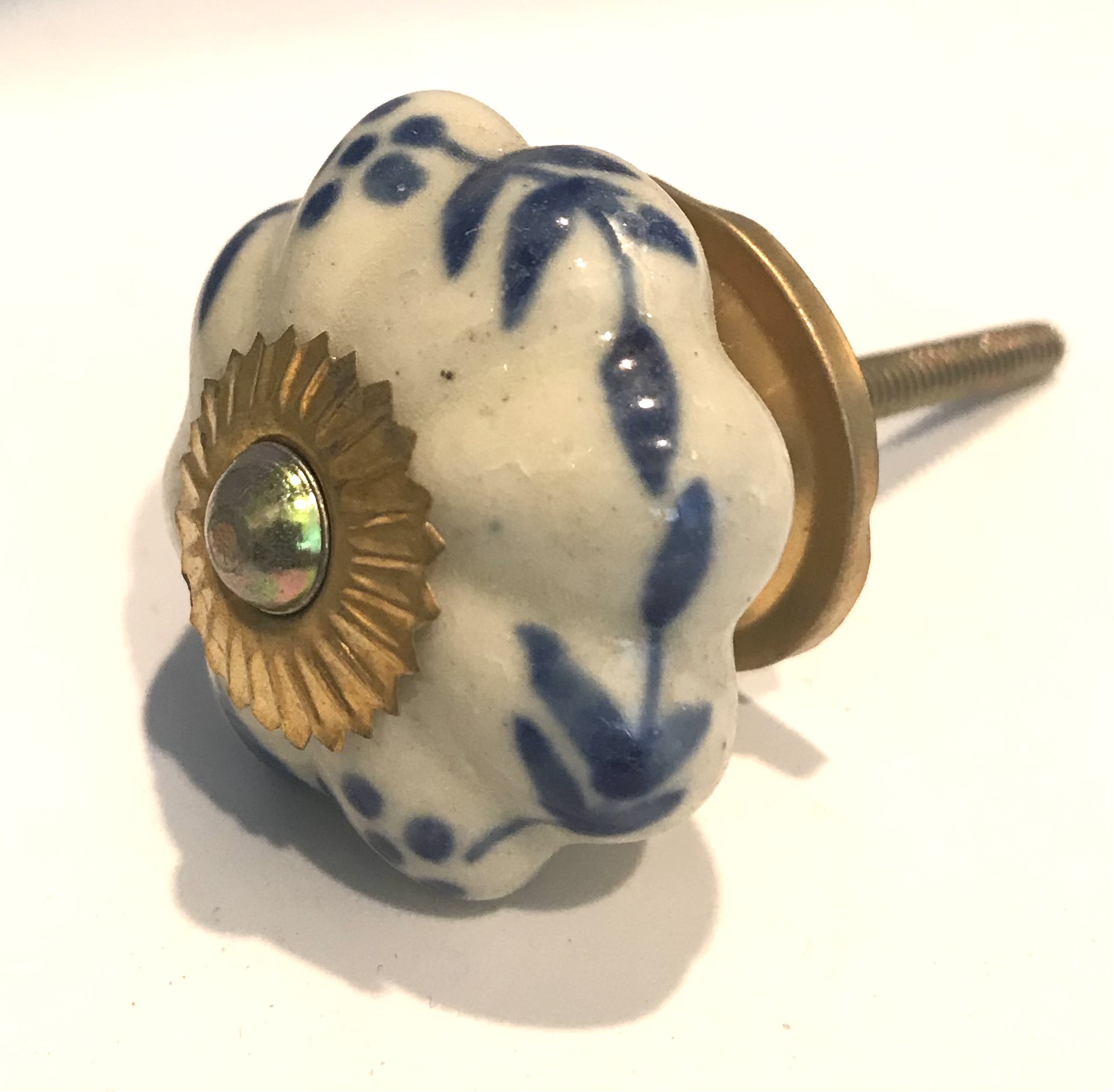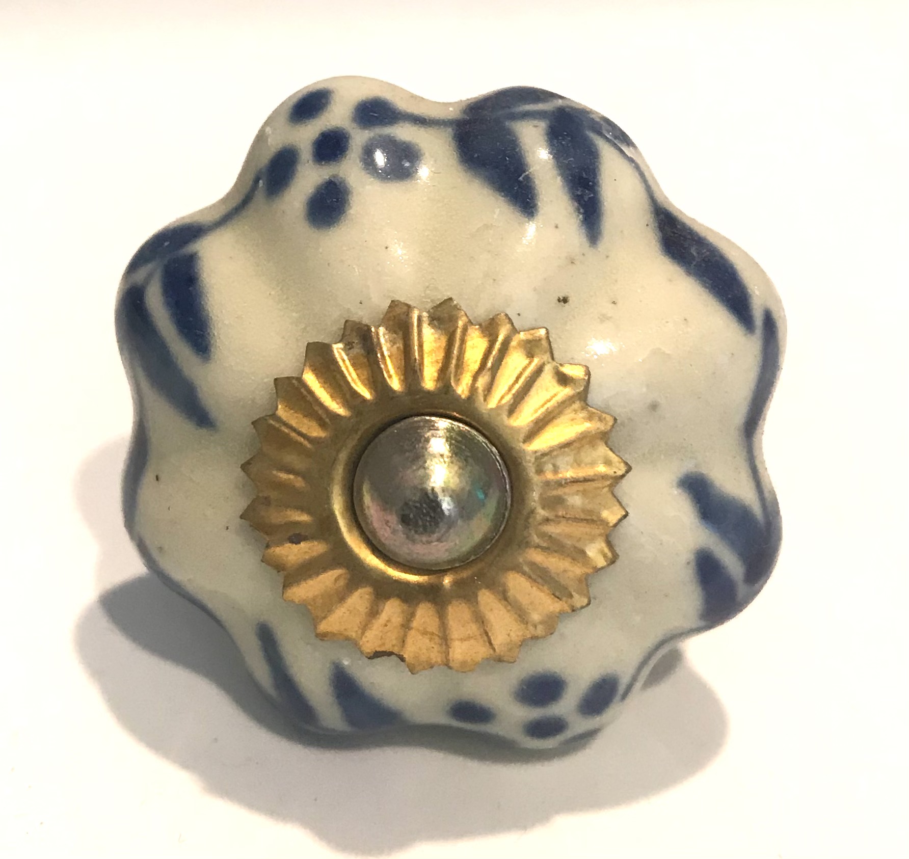 pomelli indiani in ceramica e metallo forma di fiore color crema dipinti di blu con attacchi in metallo dorato