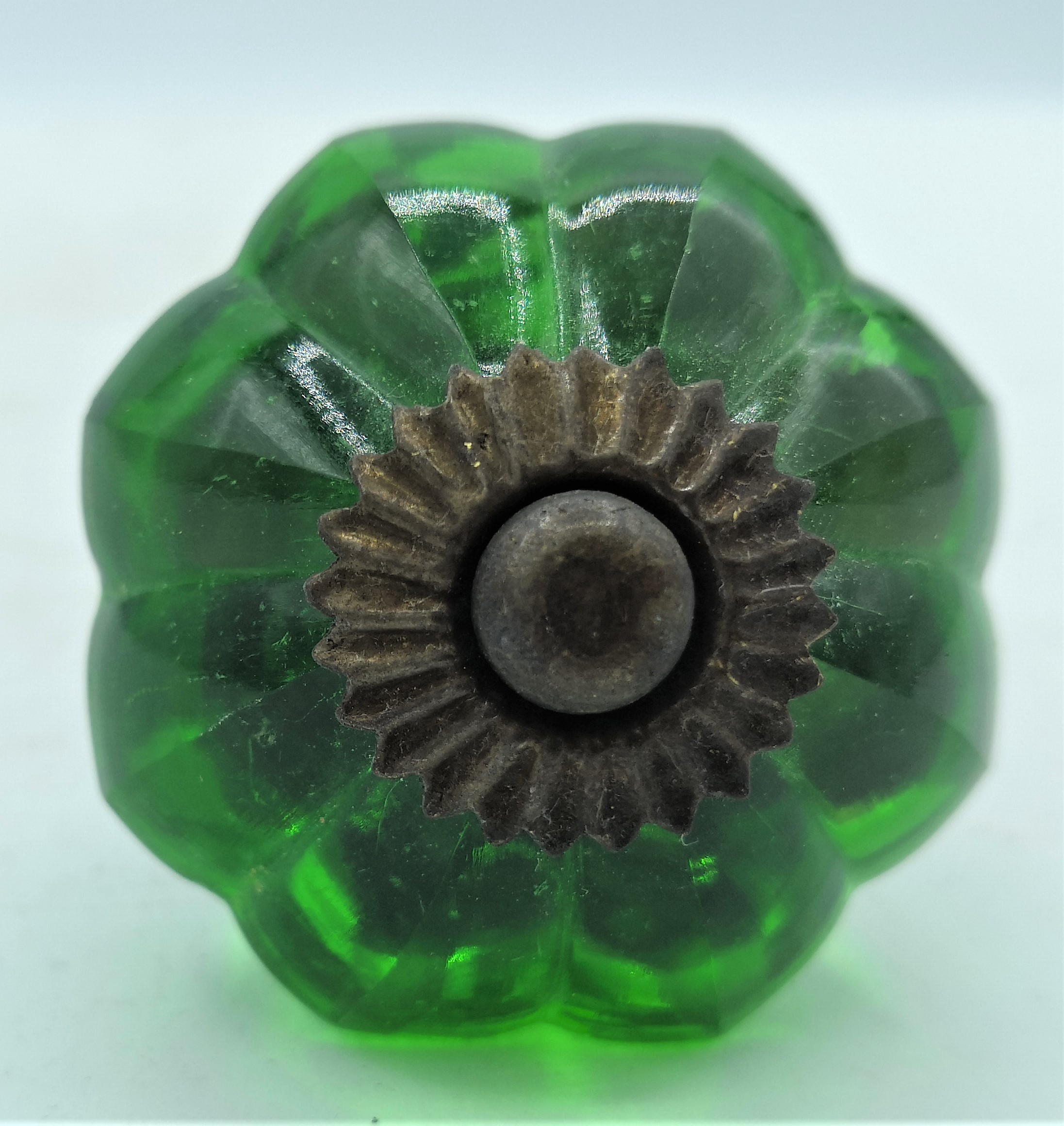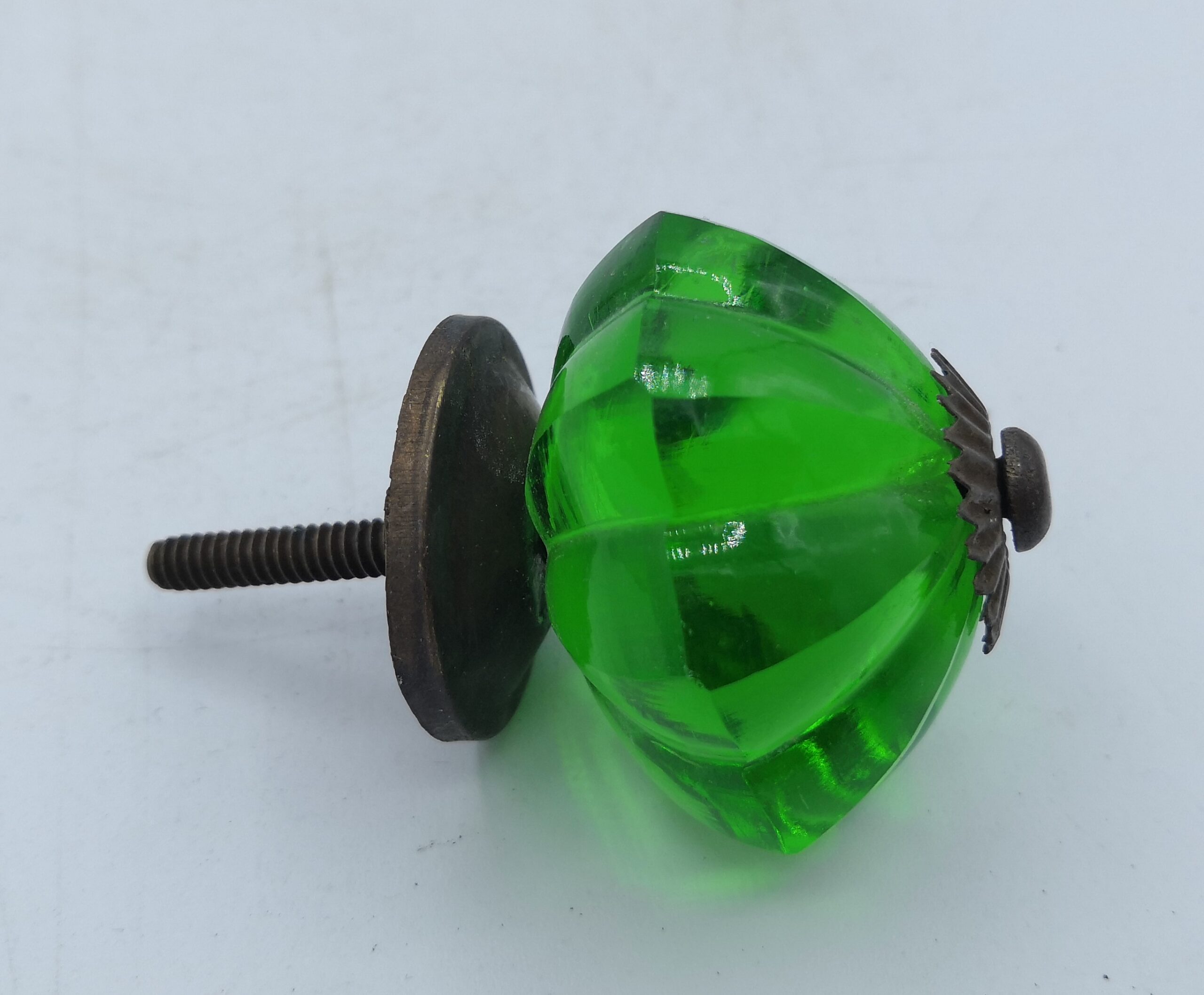 Pomelli indiani in vetro e metallo forma di fiore color verde con attacchi in metallo