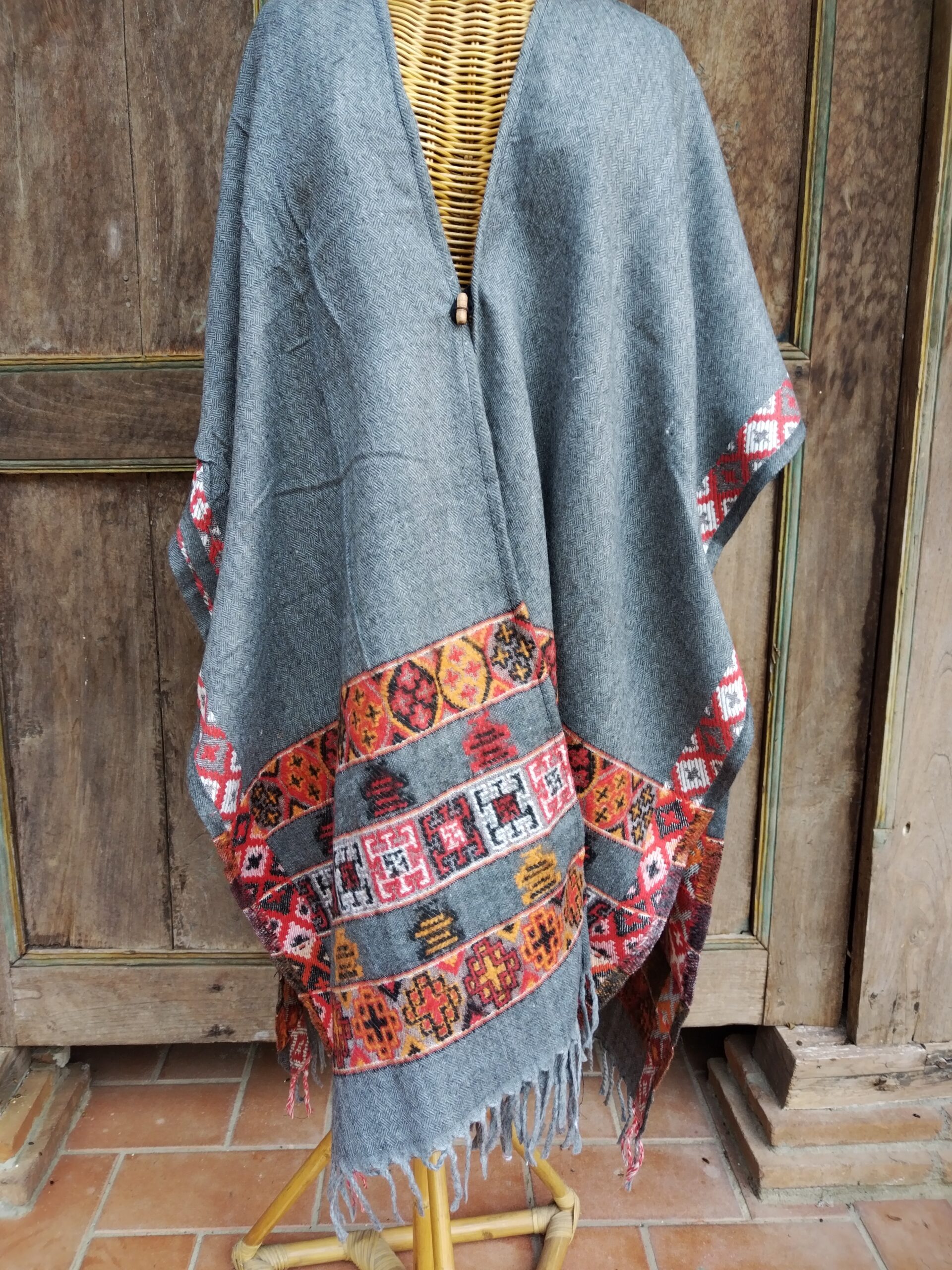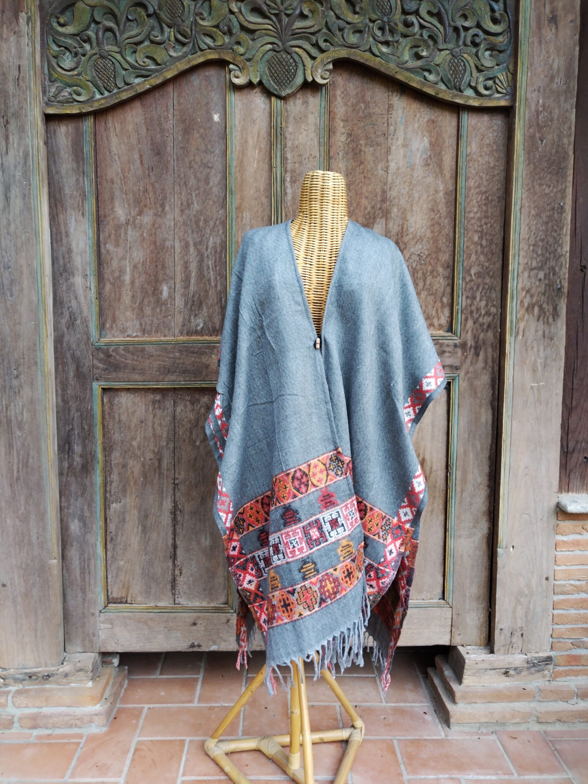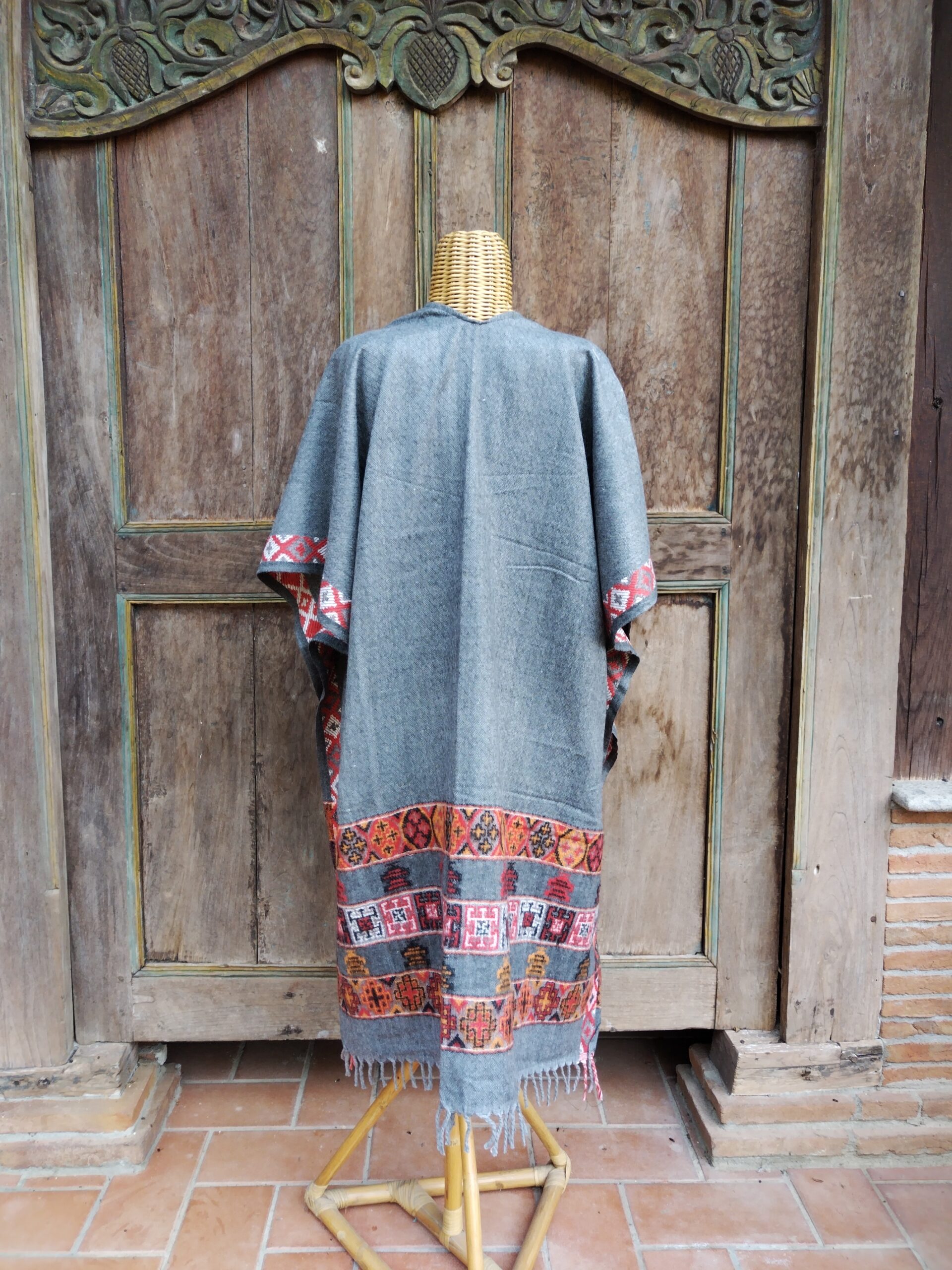 La bellezza di quest’abito è proprio nel decoro tradizionale che arricchisce lo stile sobrio e classico di questo poncho e nel suo taglio dritto, che lo rende perfetto sia per donne che per uomini, adatto a qualsiasi tipo di fisico, cadendo dritto lungo i fianchi.