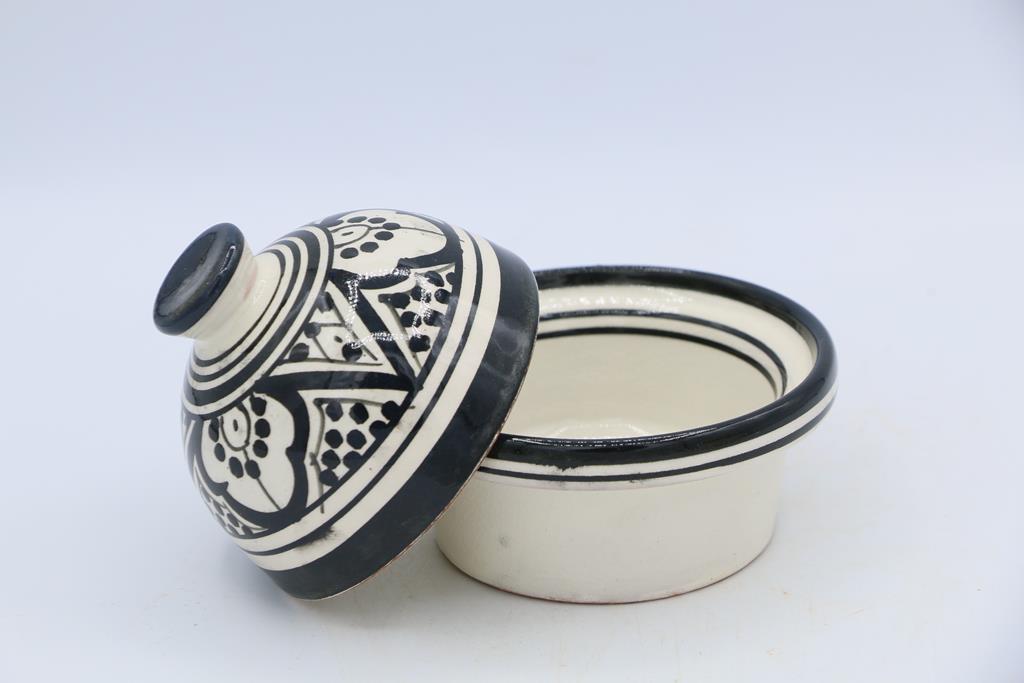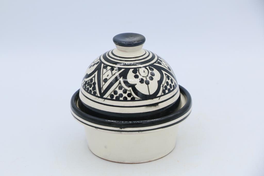 I disegni che adornano il porta burro sono tipici dello stile orientale marocchino, caratterizzati da motivi geometrici intricati, arabeschi e pattern floreali. Questi disegni non solo abbelliscono l’oggetto, ma raccontano anche storie di tradizioni antiche e abilità tramandate di generazione in generazione.