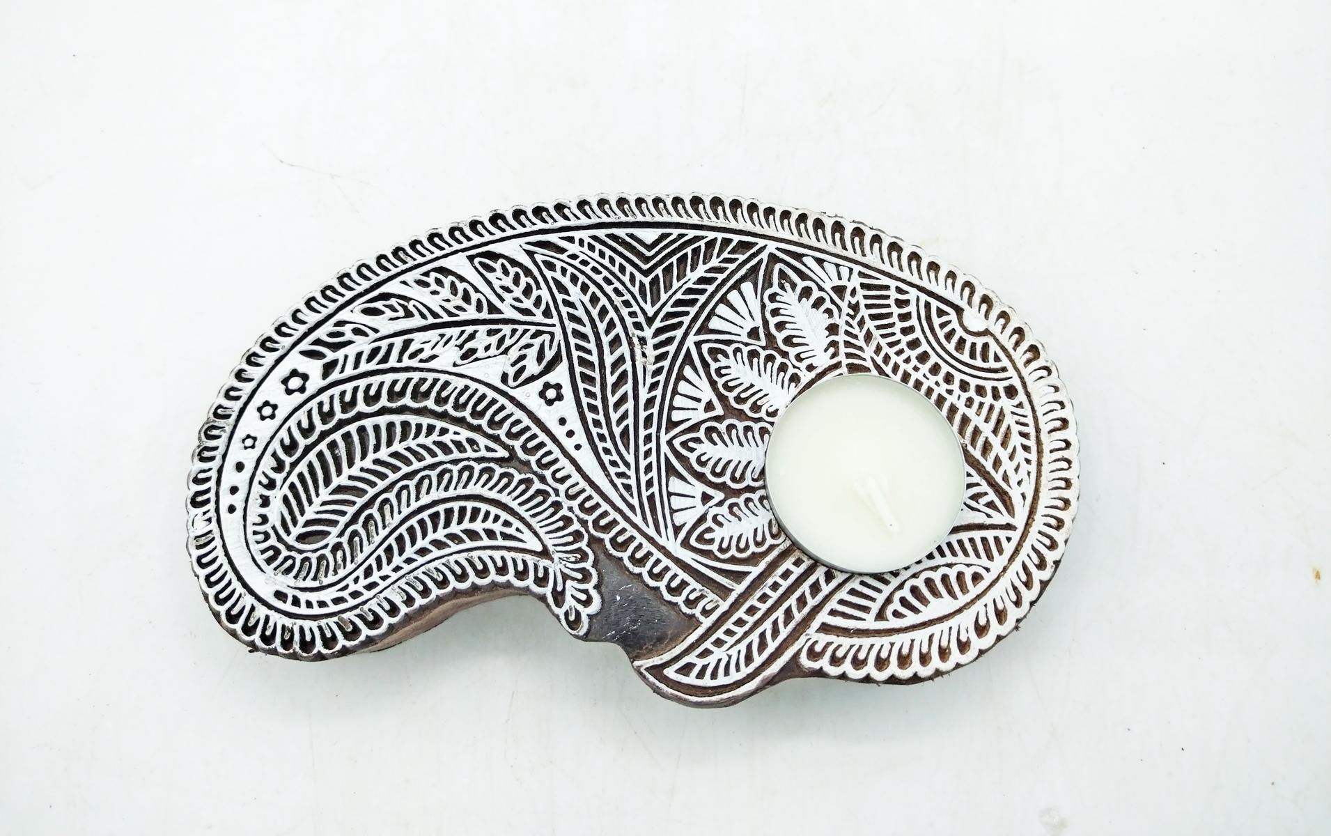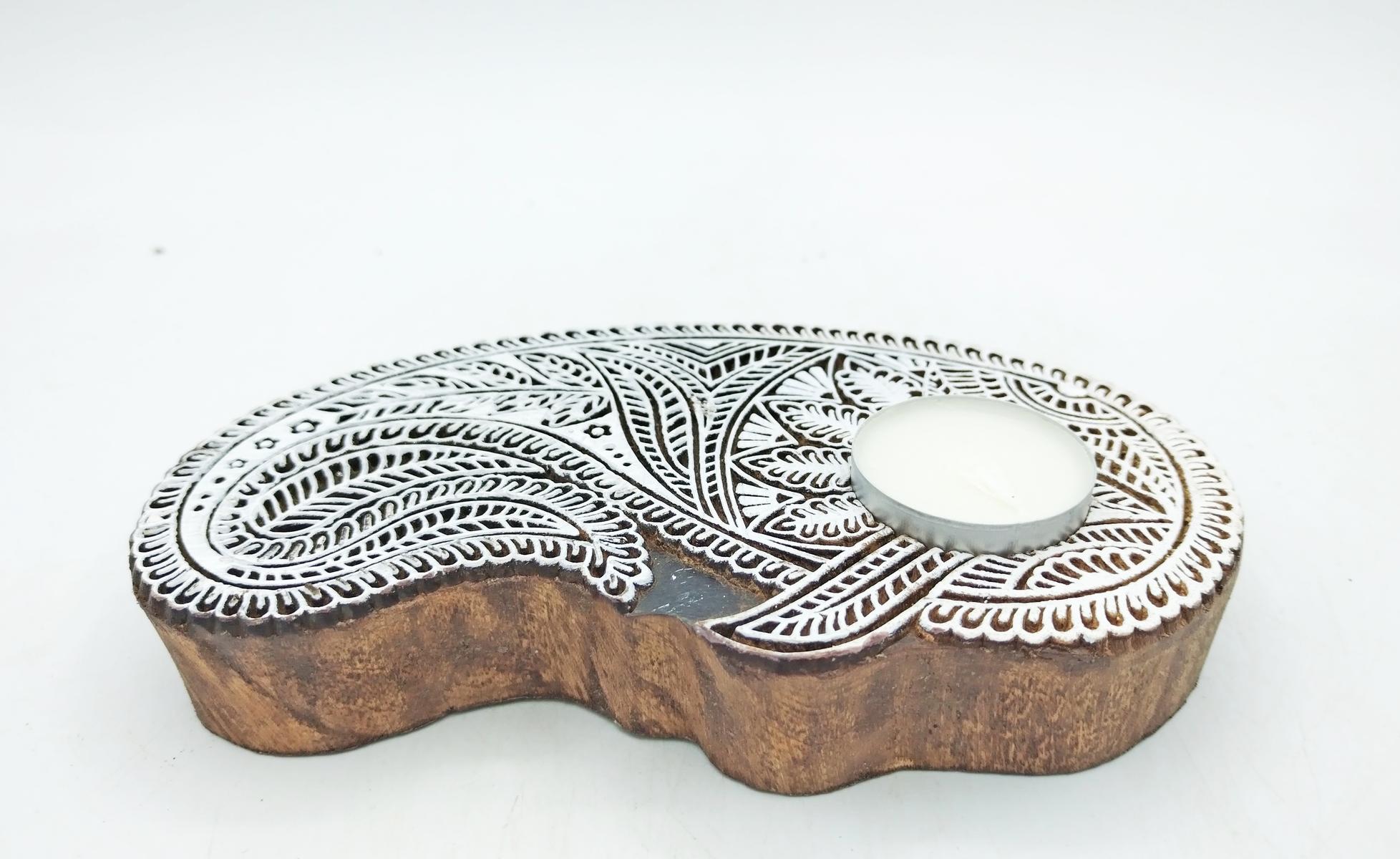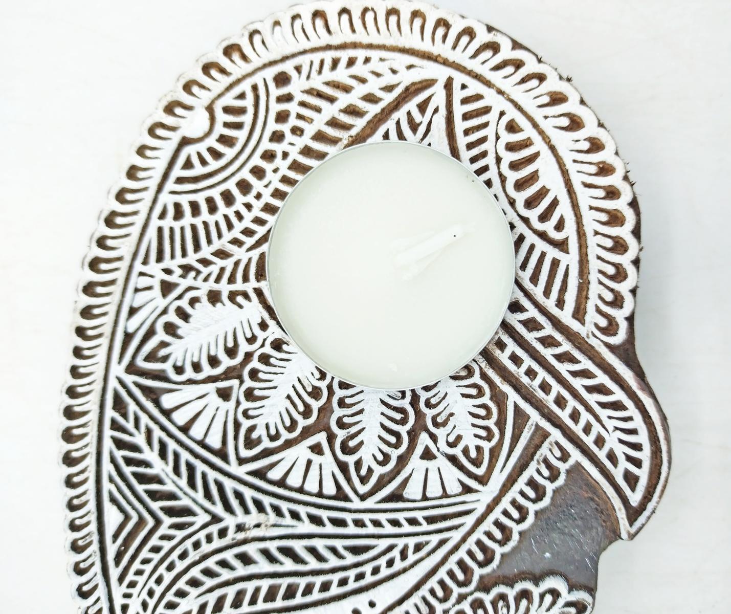 Porta candela in legno realizzato con un timbro per creare i batik indiani