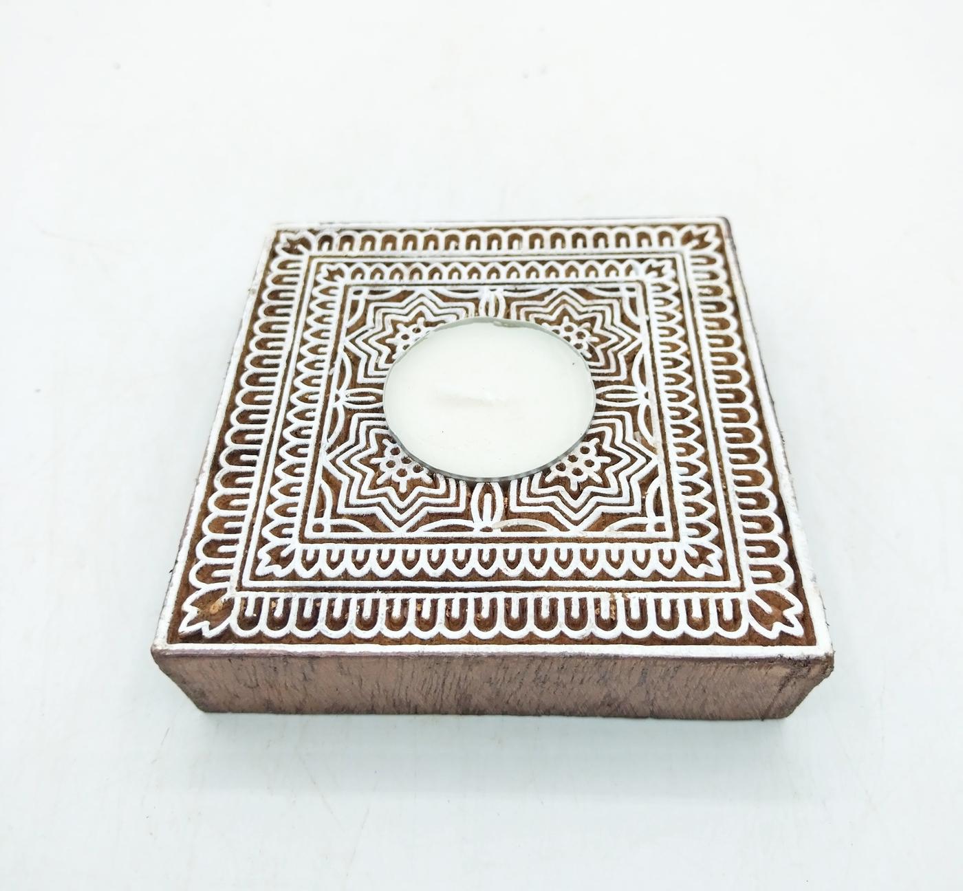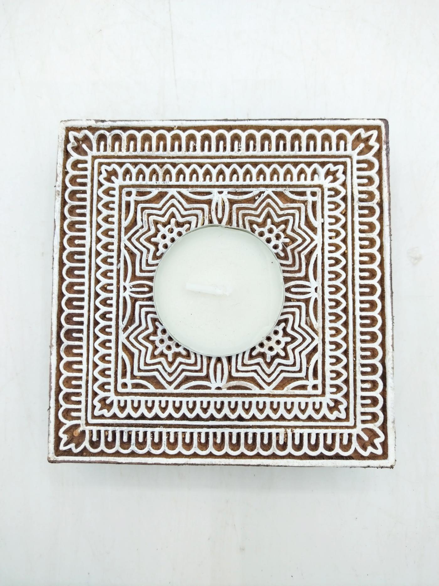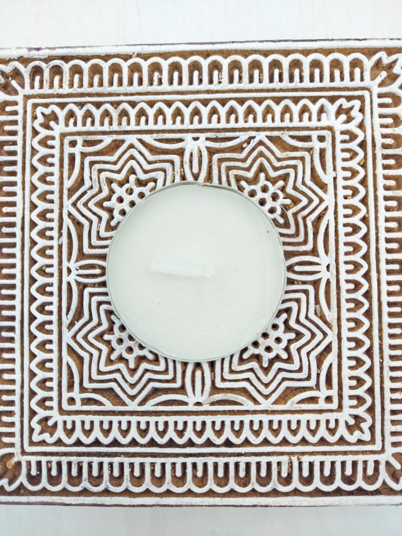 Porta candela in legno realizzato con un timbro usato per creare un batik indiano