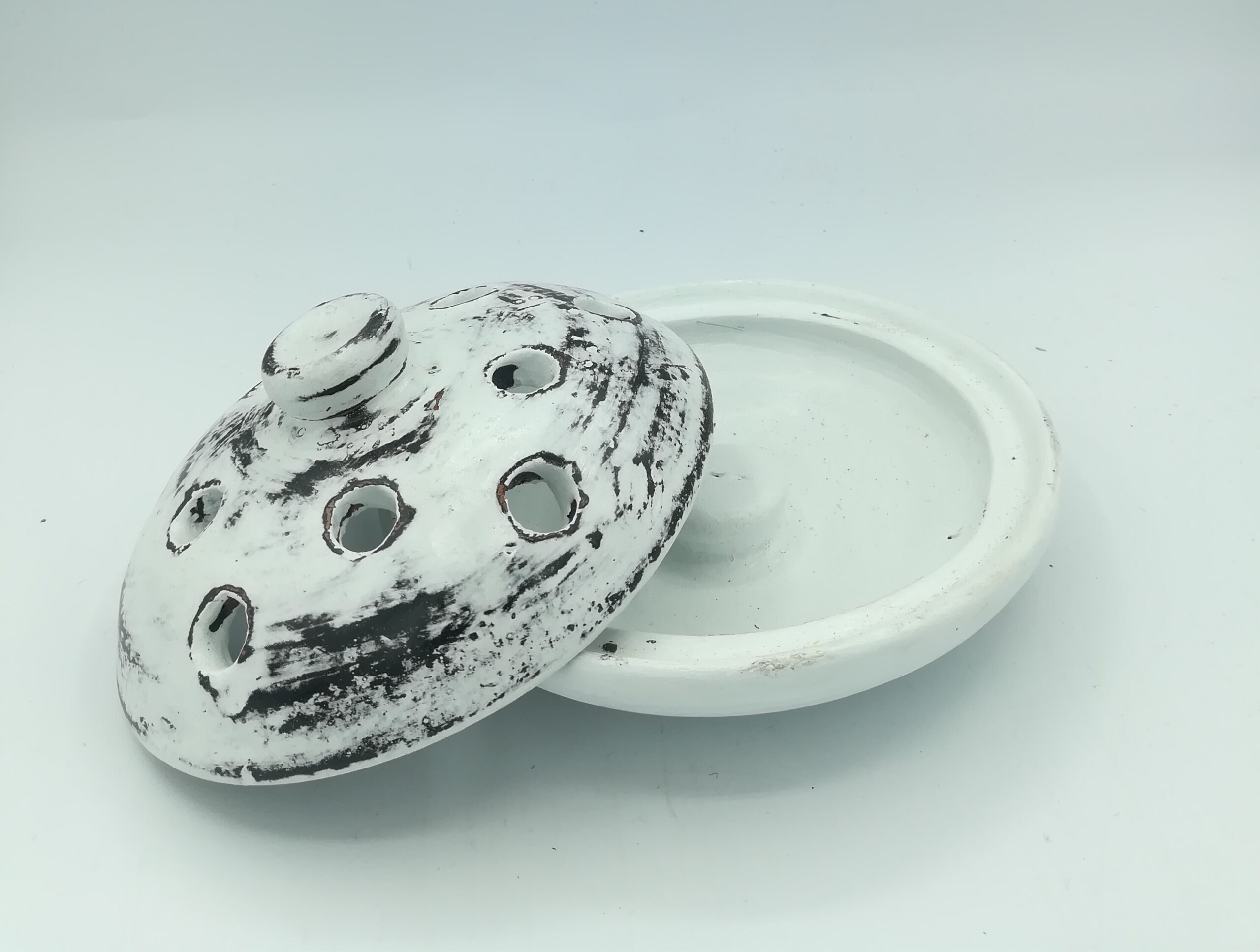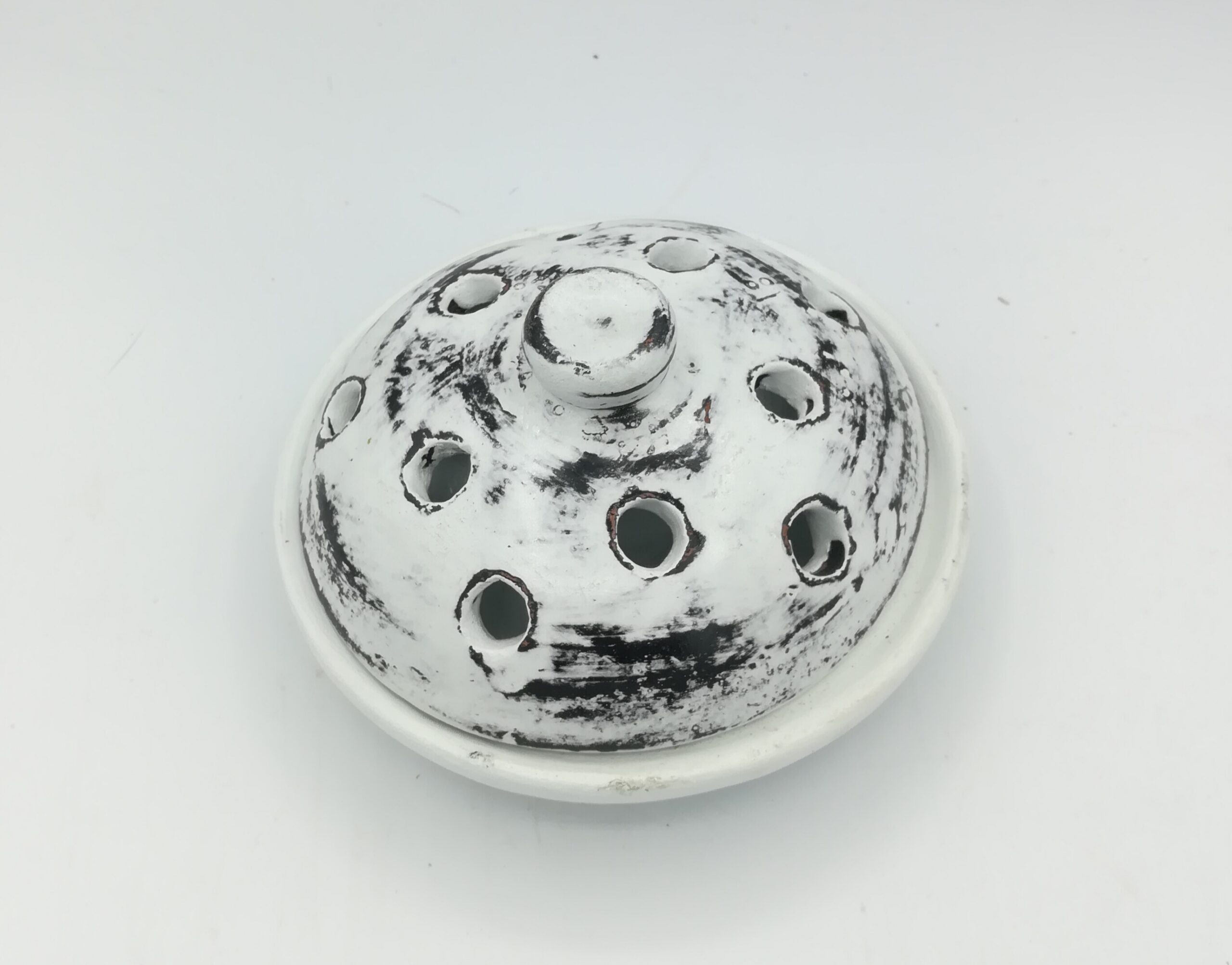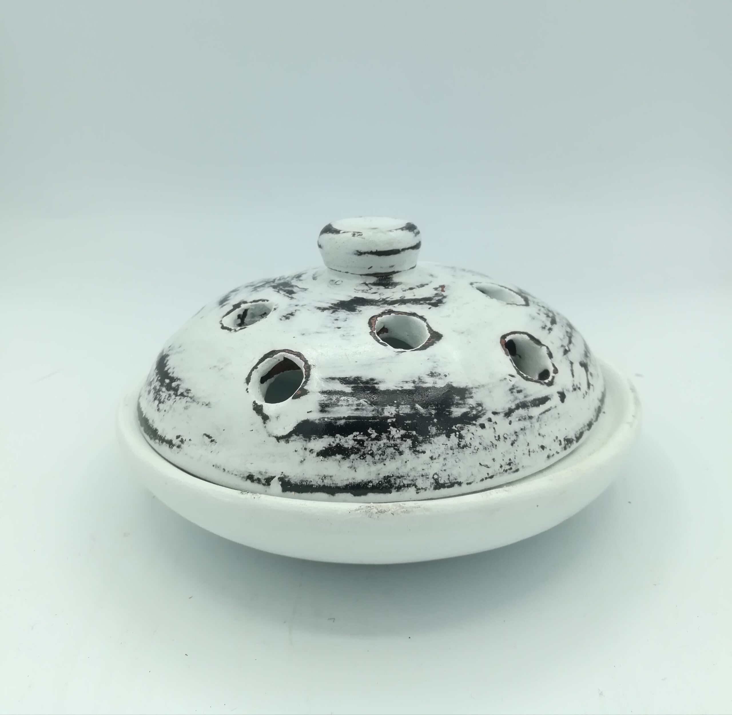 Porta candela/zampirone indonesiano in terracotta smaltata color decapato bianco, con coperchio traforato