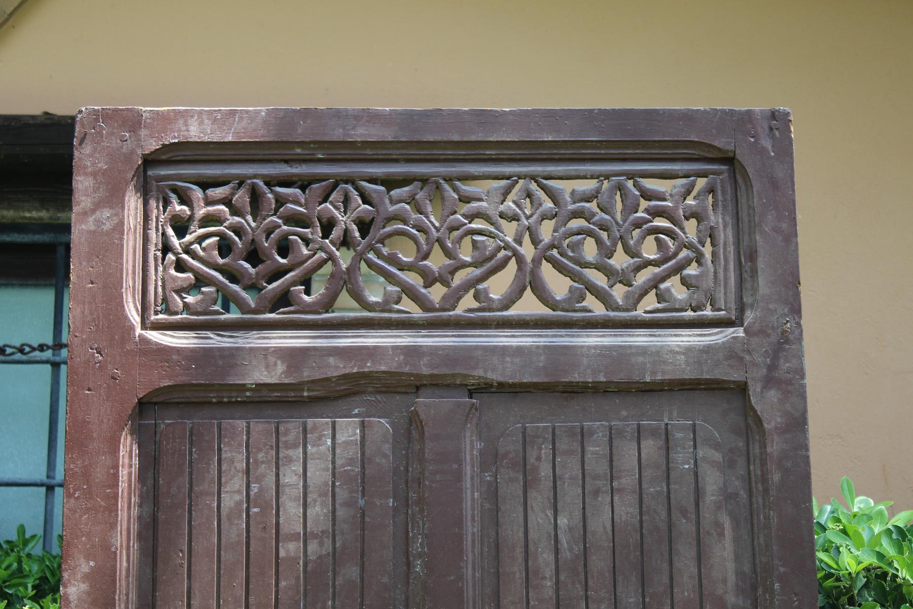 Dipinta di un marrone scuro spento, con evidenti segni del tempo che ne accentuano il valore d’antiquariato e l’autenticità, ha un riquadro intagliato con motivi arabeschi floreali e geometrici intrecciati nella parte superiore, tipici dell’arte islamica, che permettono alla luce di filtrare creando un effetto decorativo suggestivo.